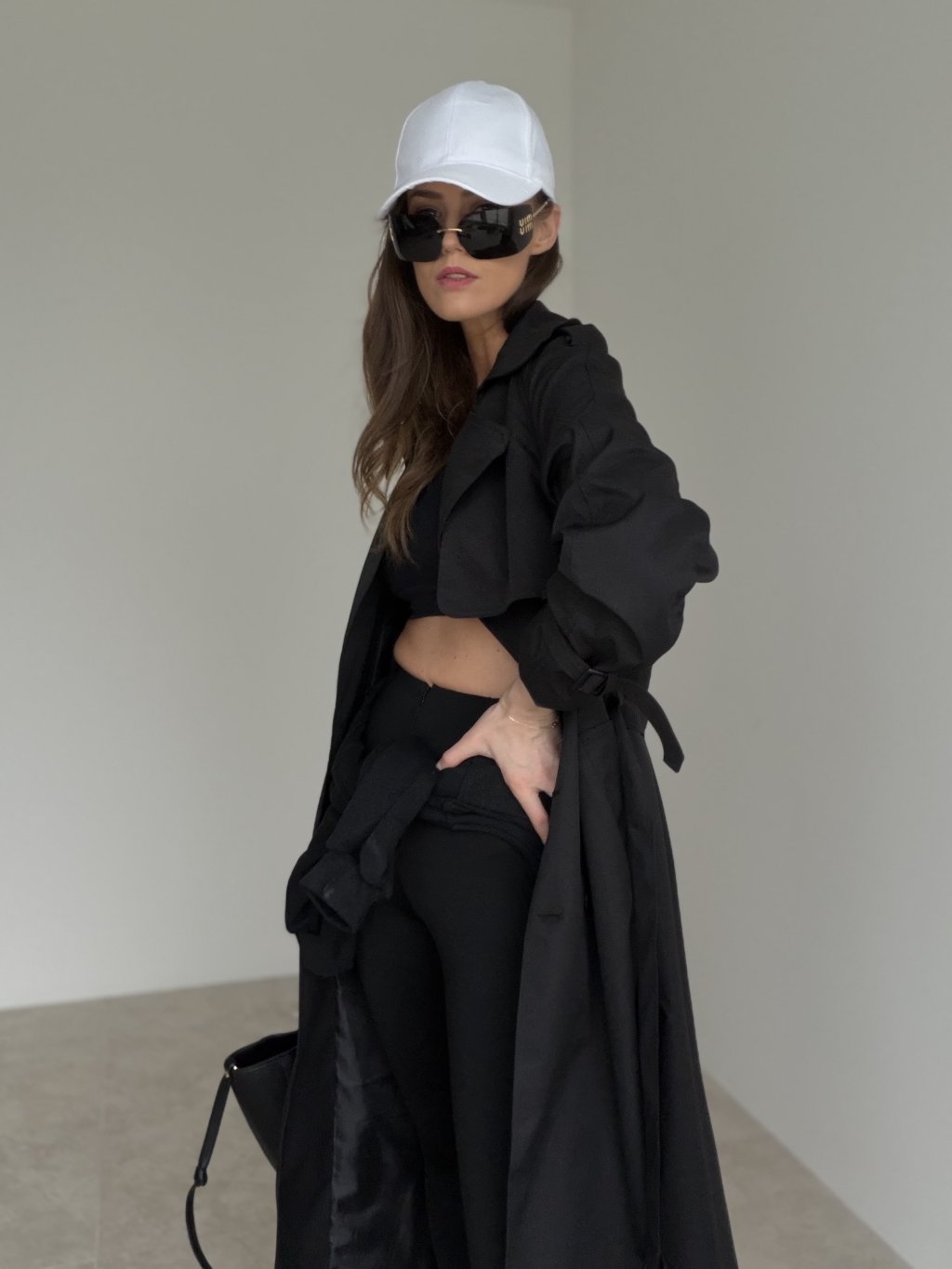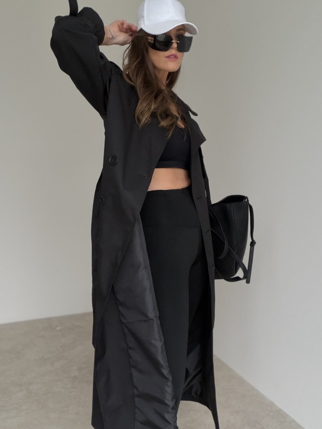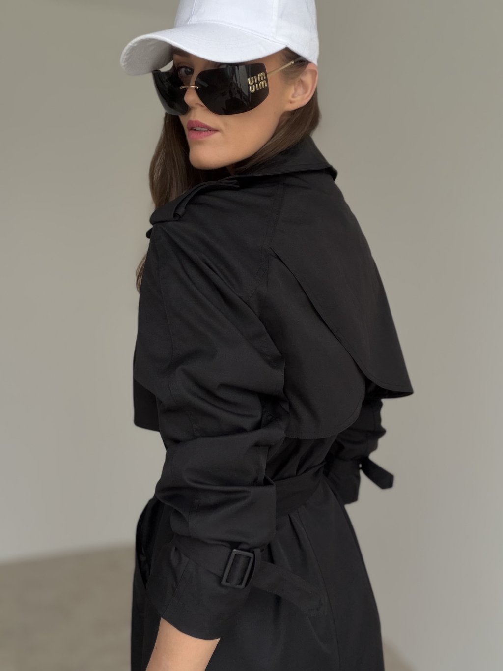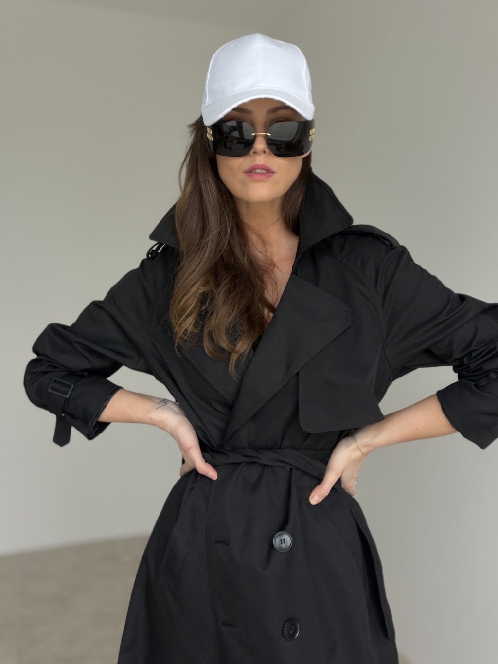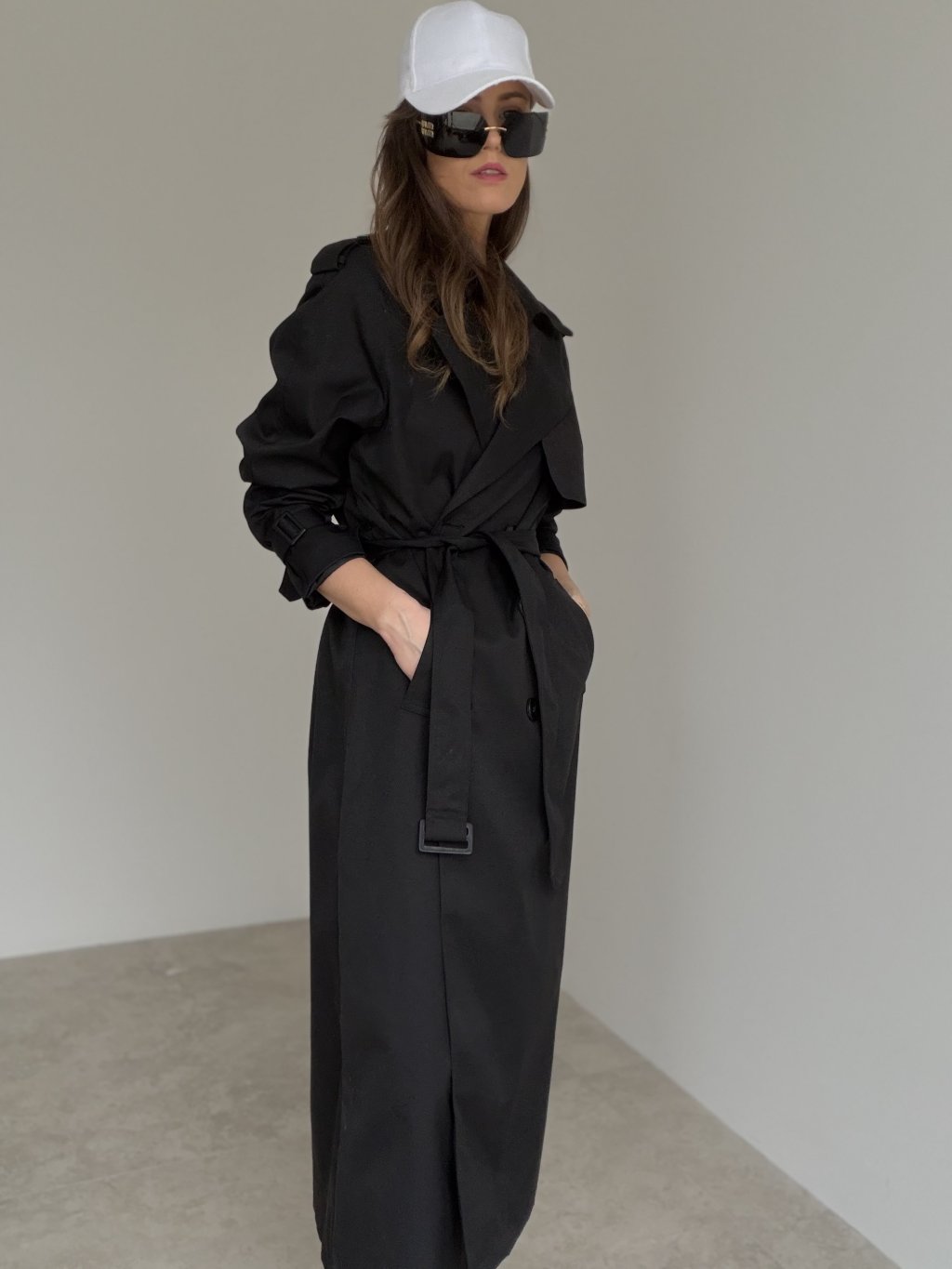 Long double-breasted trench coat with lapels, shoulder details and adjustable cuffs. A timeless piece for work and everyday styling.