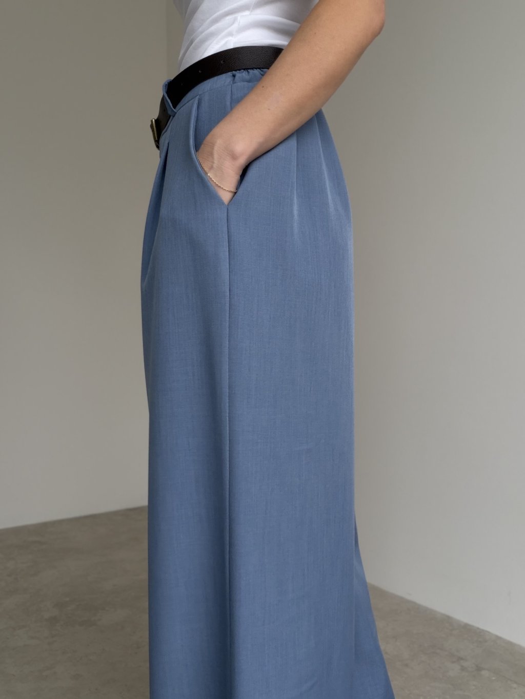 These trousers are an elegant yet extremely comfortable wardrobe staple for everyday wear and more polished outfits. They feature a relaxed wide-leg silhouette with a high-rise waist and front pleats that create a refined look and visually elongate the legs. A belt is included, along with belt loops, making styling easy for any occasion. The waistband is elasticated at the back for extra comfort and a better fit. Side pockets add a practical touch, making them a versatile choice for day-to-day wear.