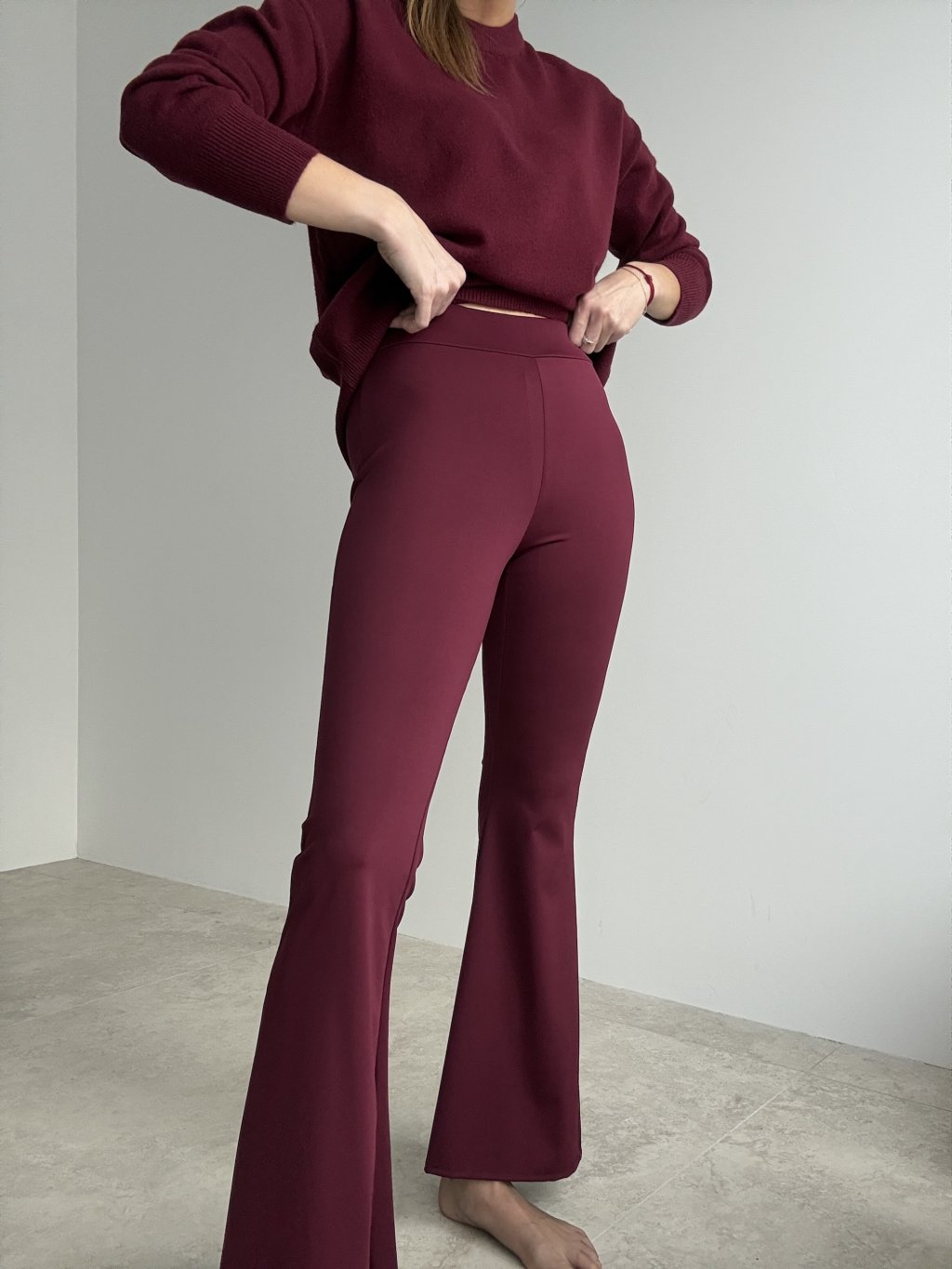 Stretchy high-waisted trousers with a slightly flared leg that hug the figure, gently shape the tummy and, thanks to the ruching at the back, visually enhance the bottom.