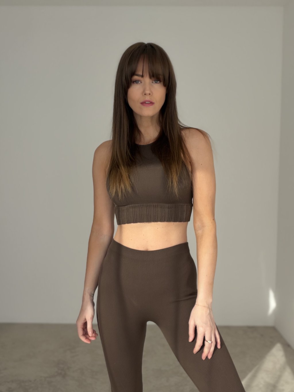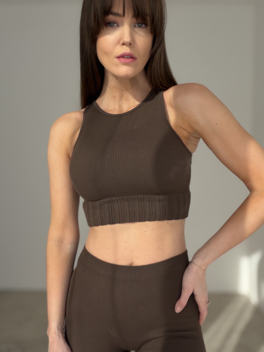 Comfortable two-piece set in stretchy ribbed knit: a sleeveless top and high-waisted leggings. Perfect for everyday wear and easy layering.