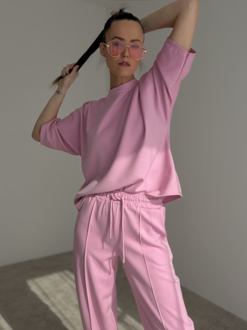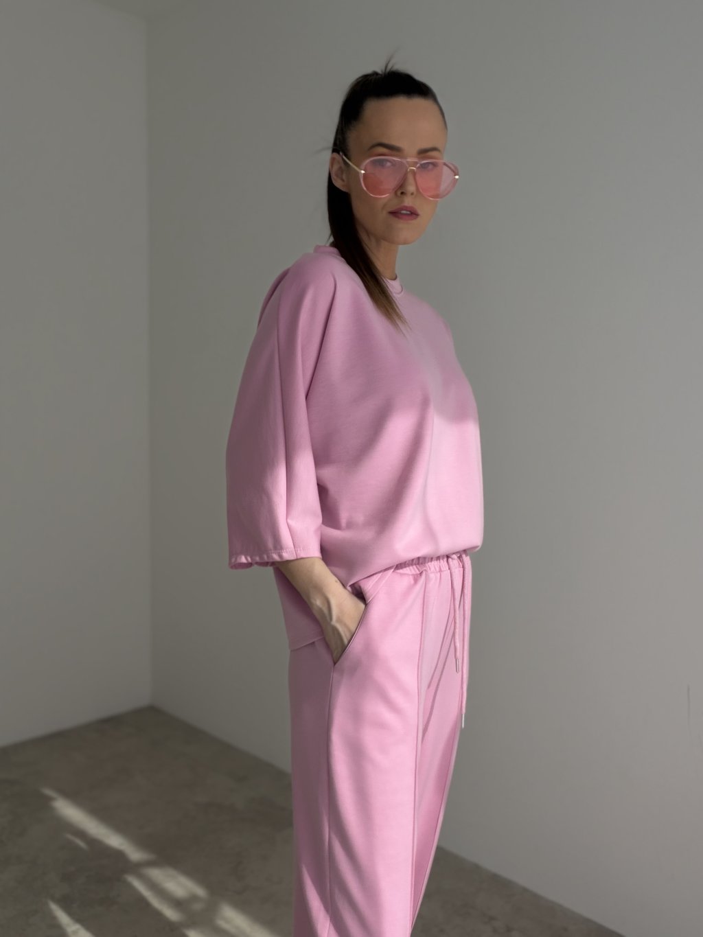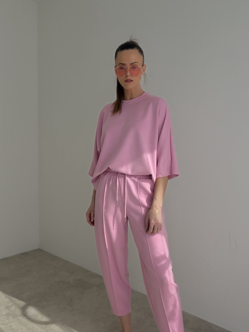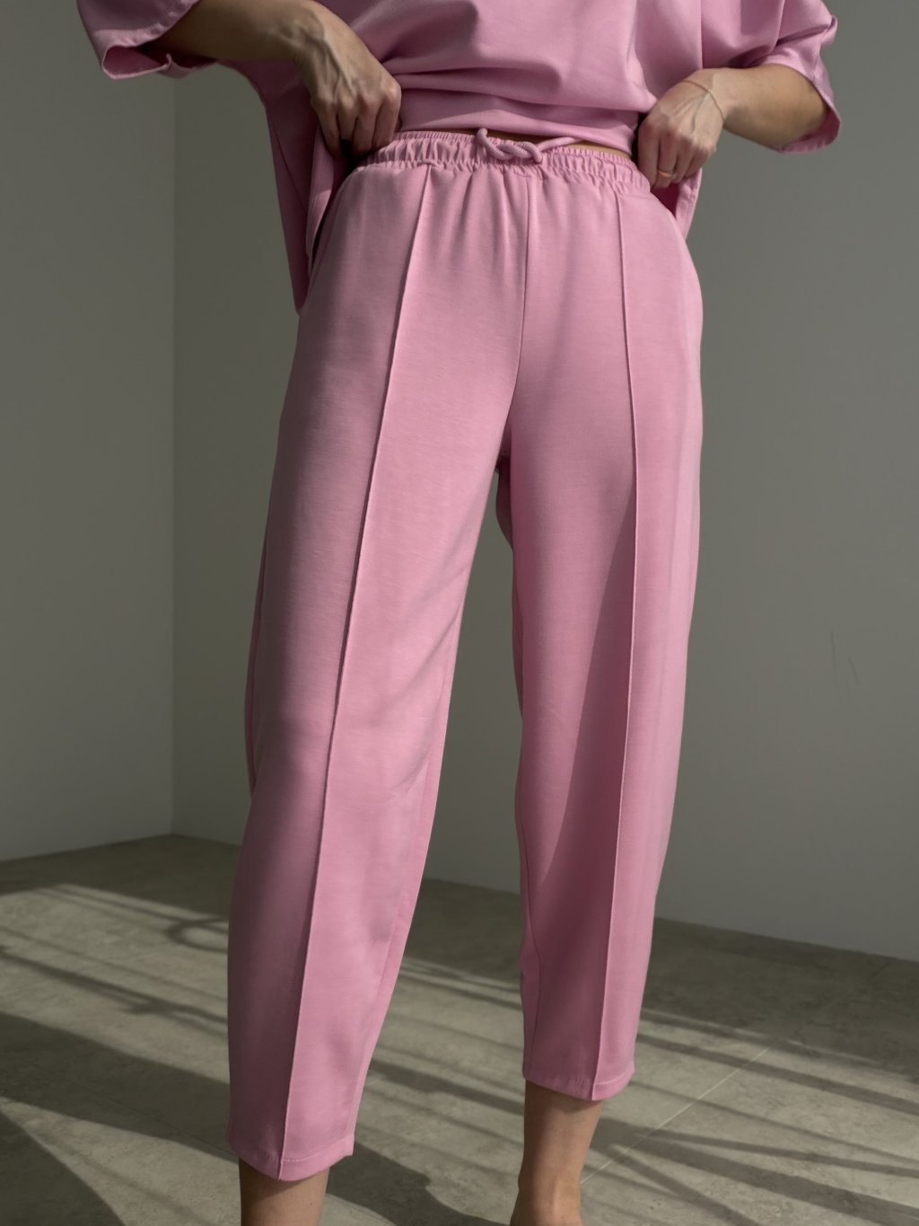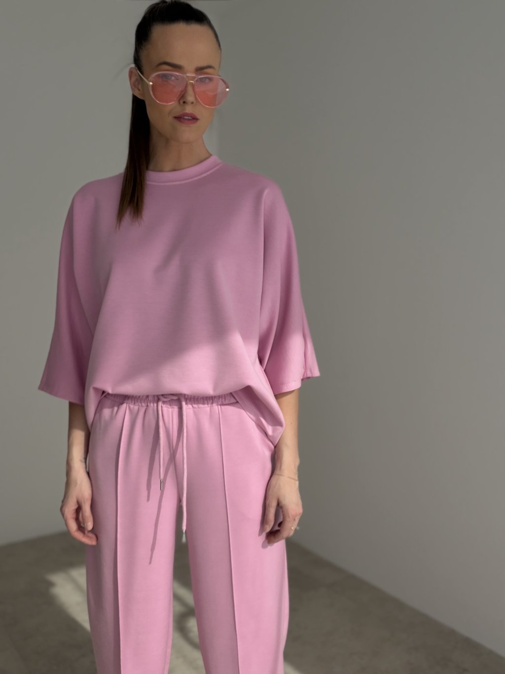 A comfortable two-piece set made from a soft knit fabric, perfect for days when you want to look polished while staying truly relaxed. The loose-fit top features a crew neckline, dropped shoulders and a modern, effortless silhouette that moves easily with you. The pants come with an elasticated waistband and adjustable drawstring, practical pockets and a relaxed, slightly tapered leg for all-day comfort. Wear it as a matching set for a clean, put-together look, or style each piece separately with your wardrobe staples.