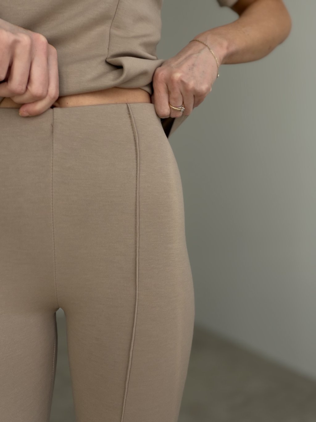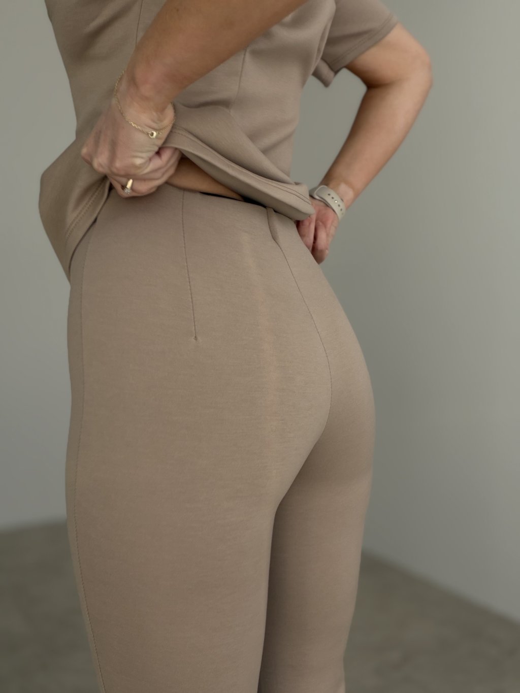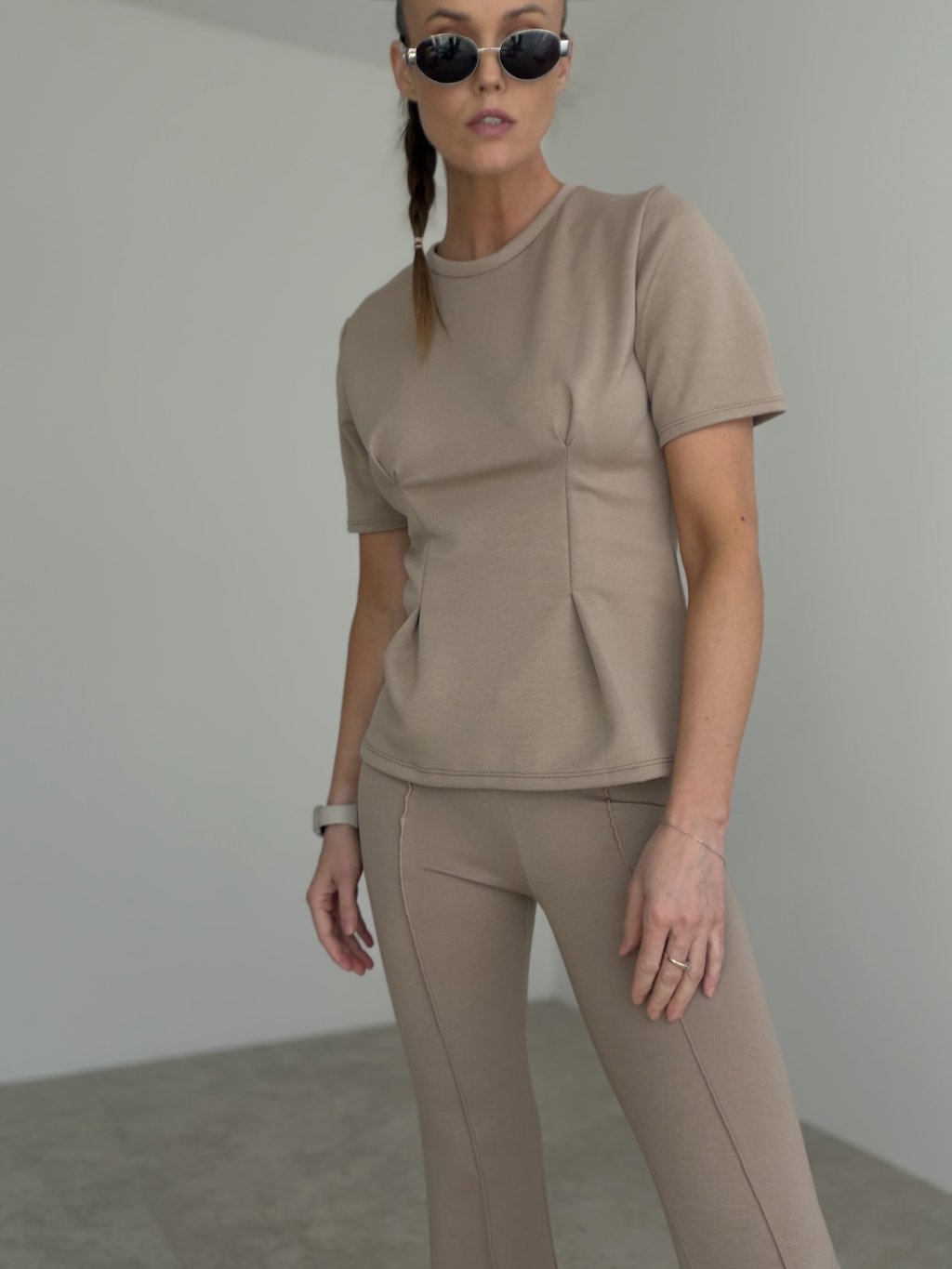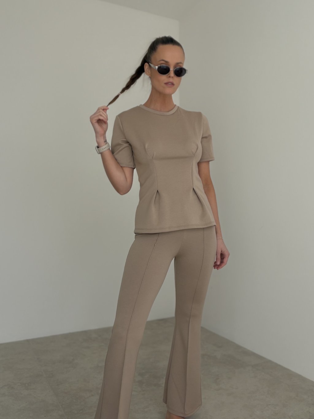 A comfortable and stylish two-piece set with a short-sleeve top and fitted high-waisted trousers. A timeless outfit that combines comfort, femininity, and a modern look.