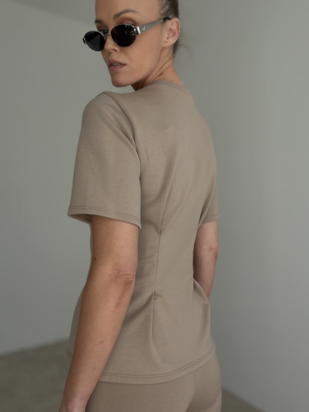 This two-piece set is the perfect choice for women who love comfort, clean lines, and at the same time a polished, feminine look. The short-sleeve top feels simple yet elegant, while its gently shaped cut beautifully highlights the silhouette. The bottom part features fitted high-waisted trousers that adapt comfortably to the body and create a modern, timeless outfit suitable for everyday wear as well as stylish casual days. The whole set feels harmonious, minimalist, and very easy to style with accessories according to your own taste.