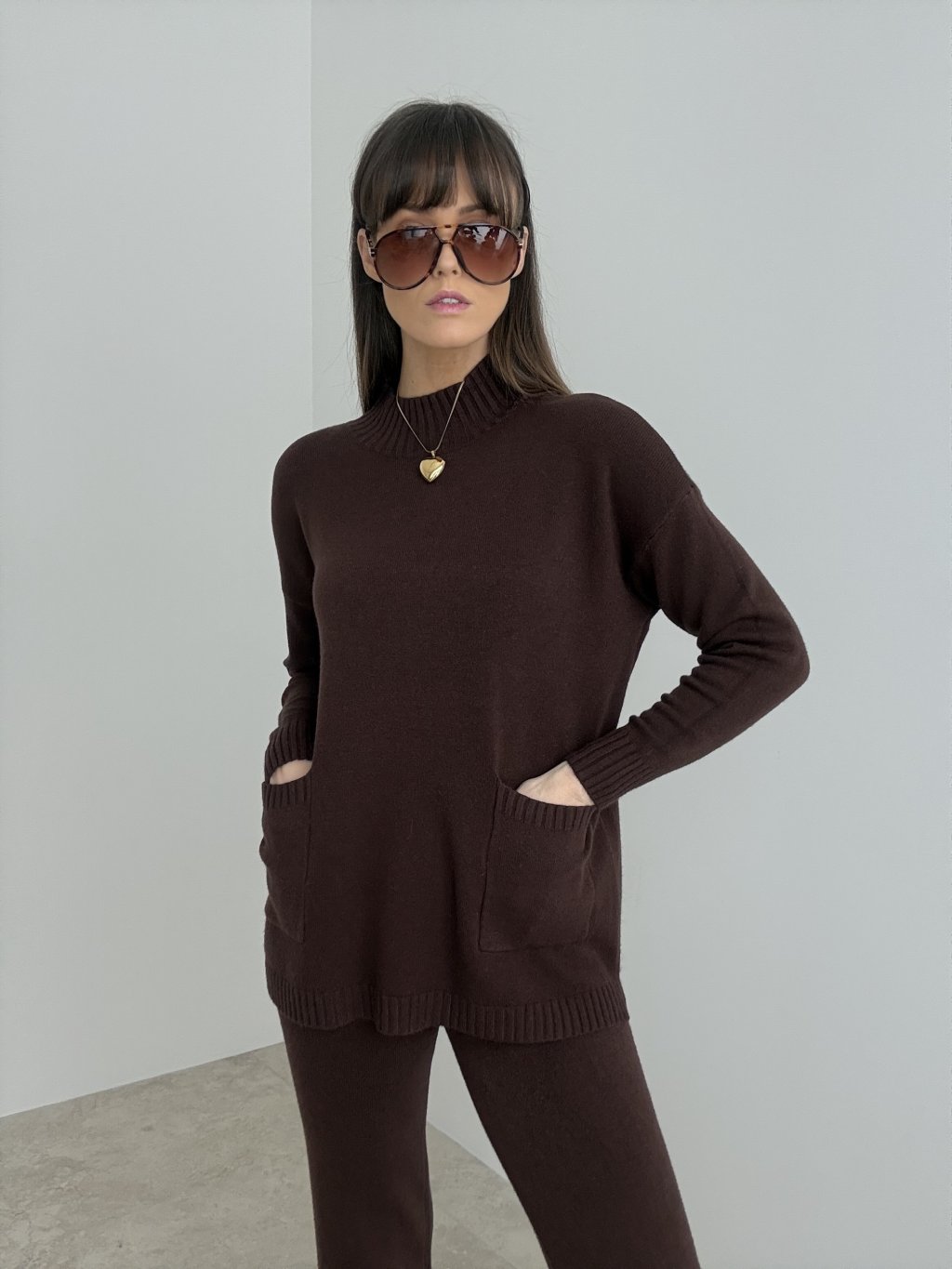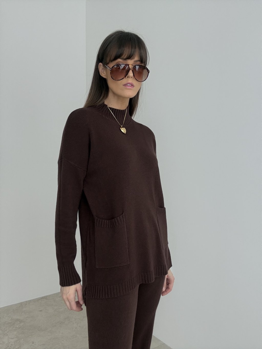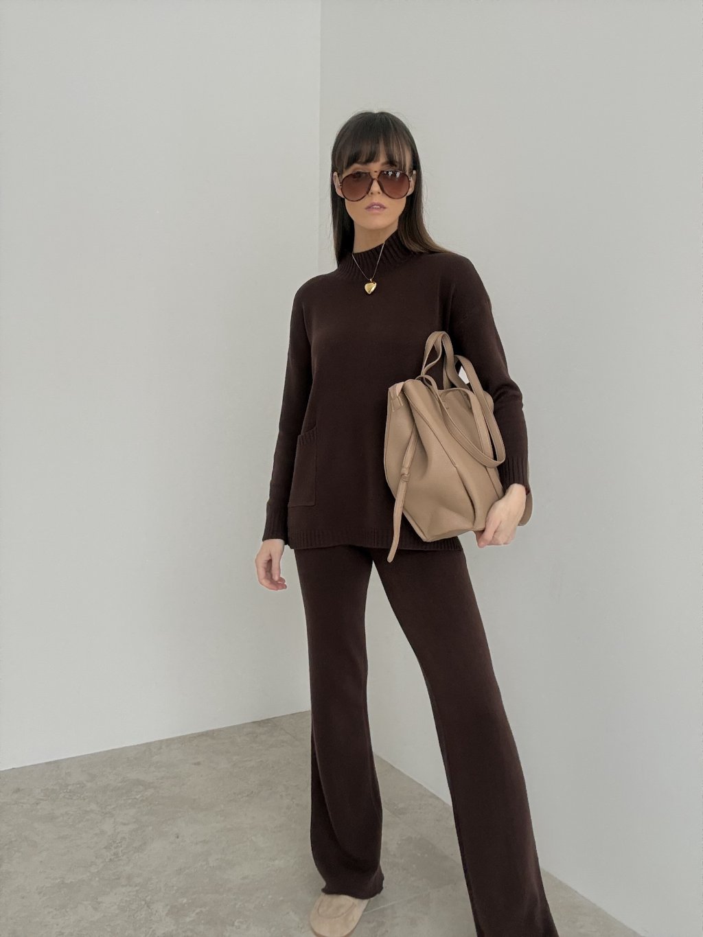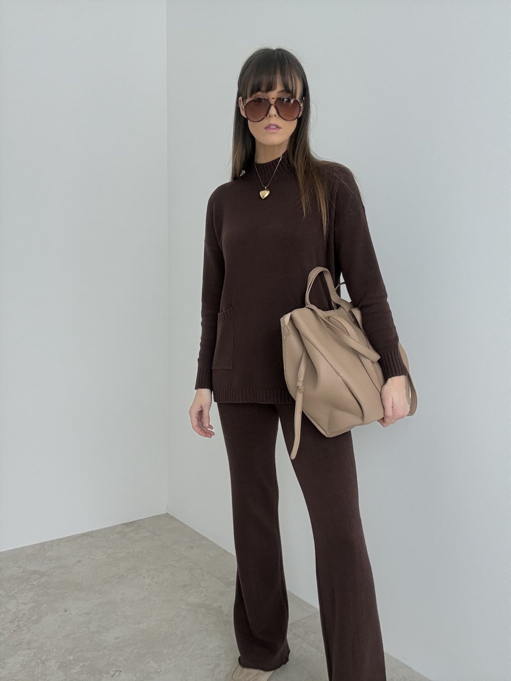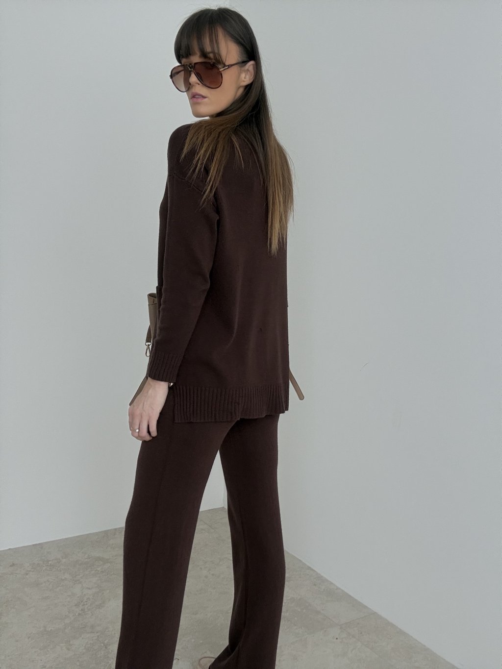 A two-piece knit set that combines comfort with a polished, put-together look. The top features a relaxed fit, long sleeves, and a classic crew neckline, making it timeless and easy to wear on its own as well. The trousers come with a comfortable elastic waistband and subtly flared legs that visually elongate the silhouette and add an elegant touch to a relaxed outfit. The fabric feels pleasant against the skin, making this set ideal for city days, travel, casual work settings, and cosy at-home wear. Both pieces can be styled separately, giving you multiple outfit options from one set.