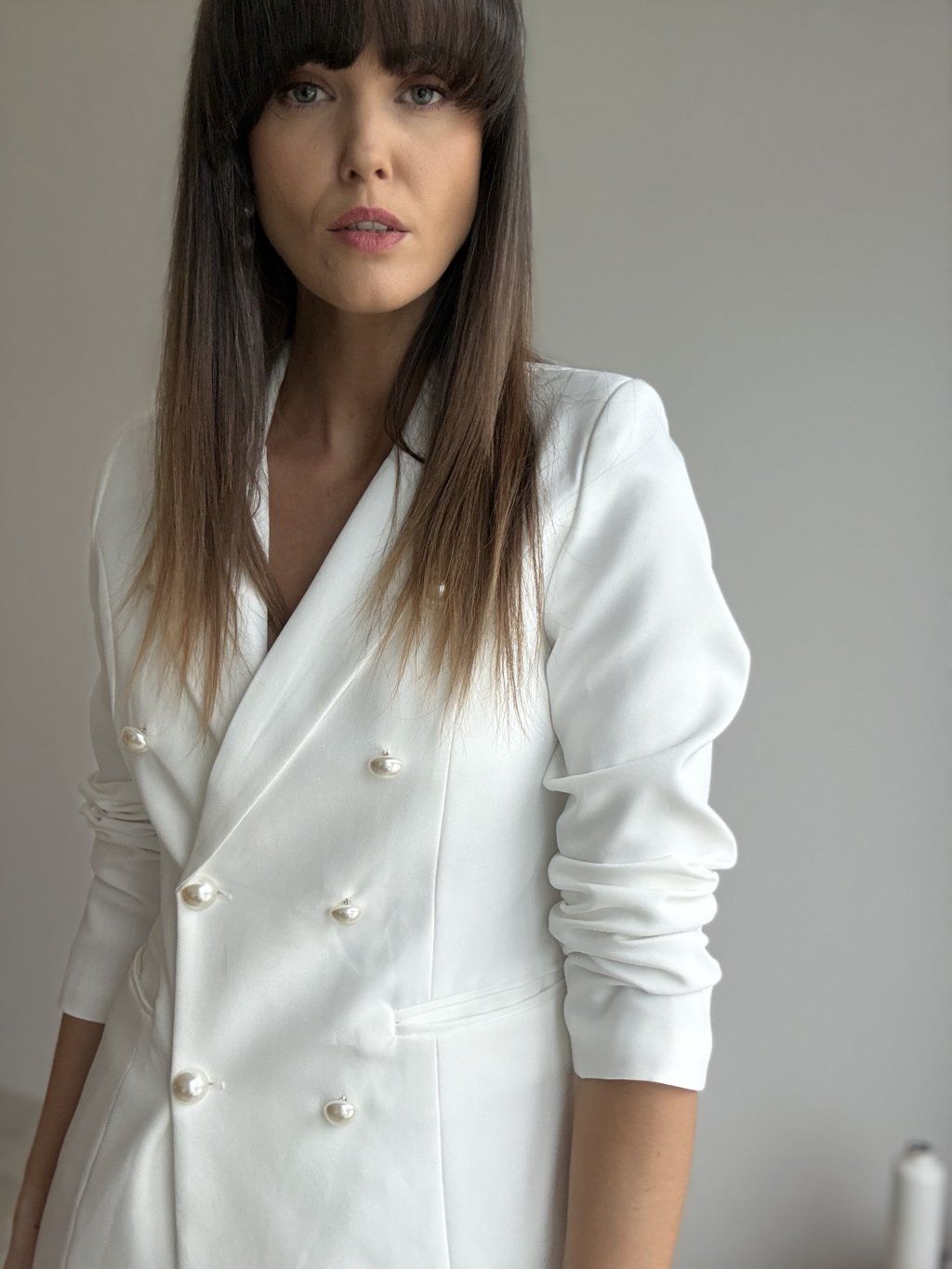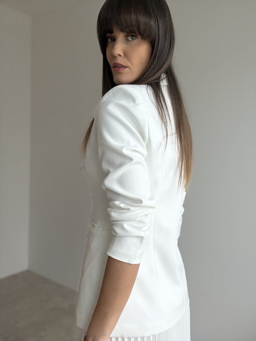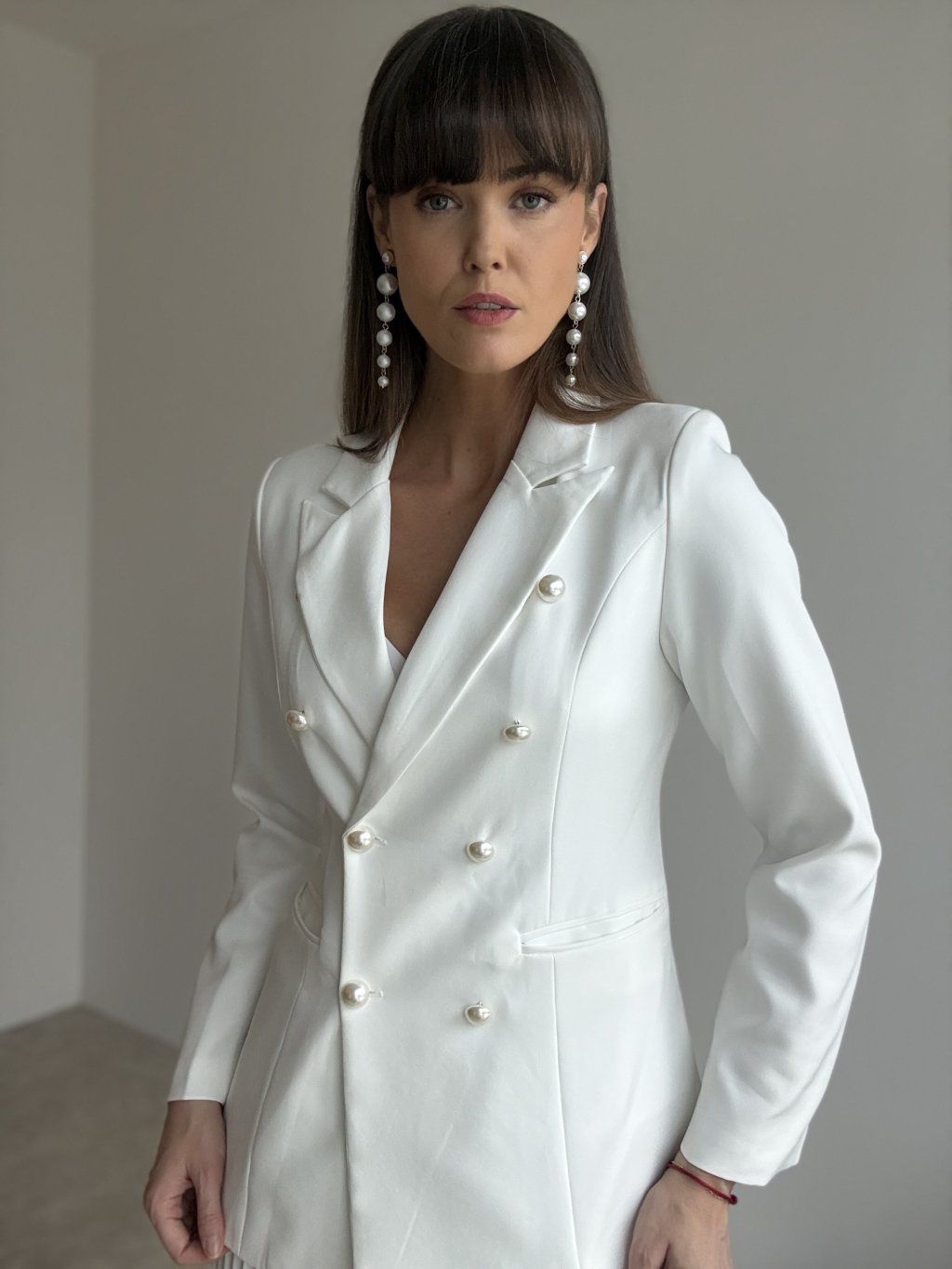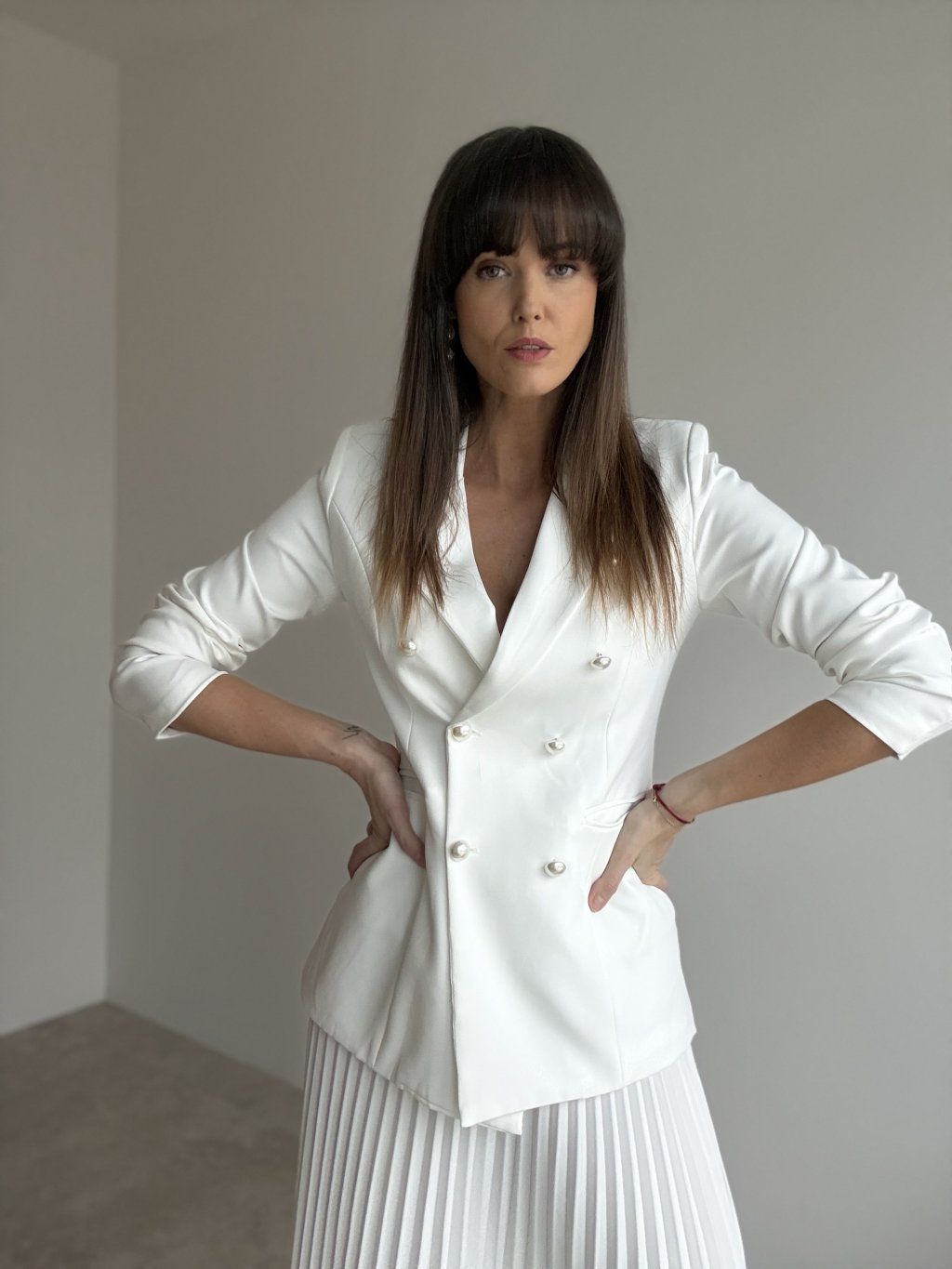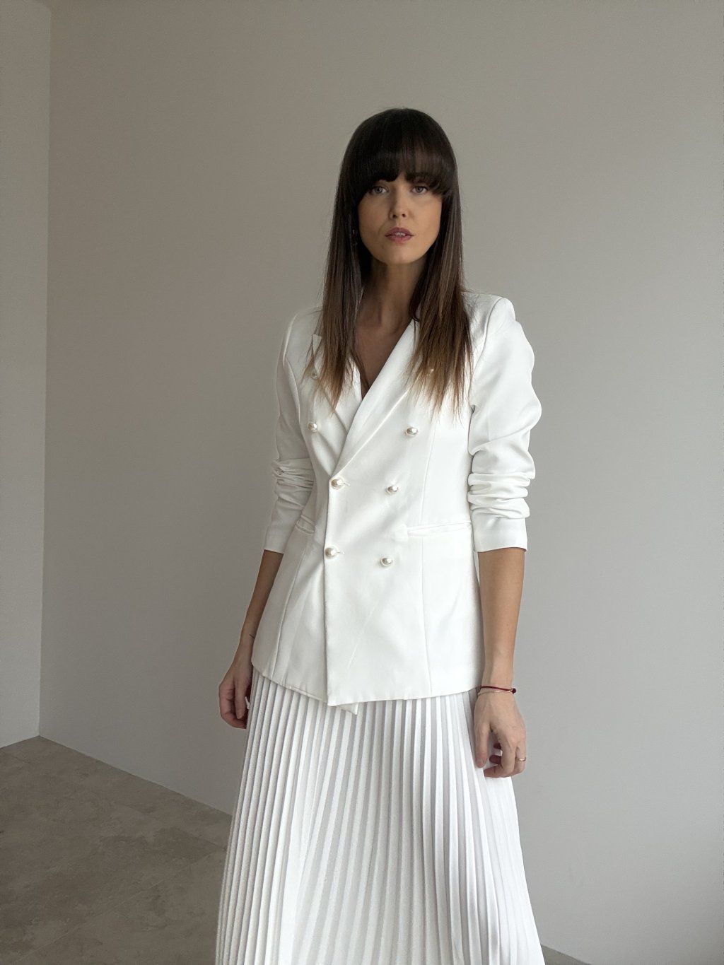 An elegant two-piece set combining a tailored longline blazer with eye-catching double-breasted fastening and a softly pleated midi skirt. The blazer features a gently fitted cut that accentuates the waist, while structured shoulders and decorative buttons create a refined, polished look. Clean lines and subtle detailing give the outfit a luxurious feel, ideal for celebrations, formal meetings and special occasions. The pleated skirt moves beautifully with every step, visually elongating and slimming the silhouette, and the comfortable waistband ensures all-day wearability. You can wear the set together as a complete look, or style each piece separately – the blazer with trousers, the skirt with a top or blouse.