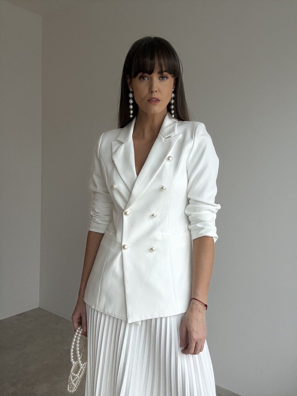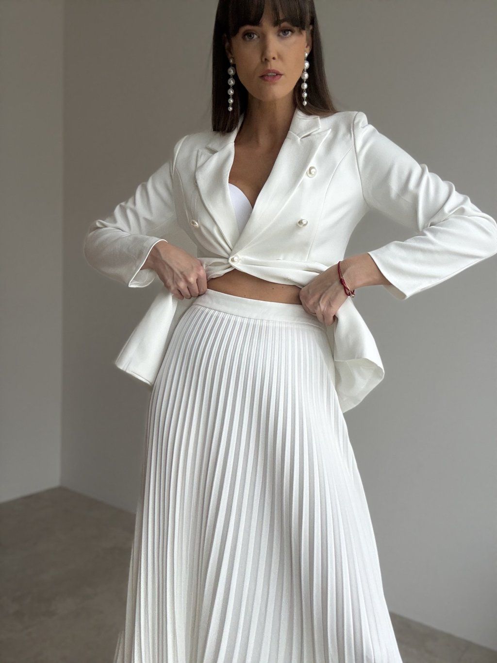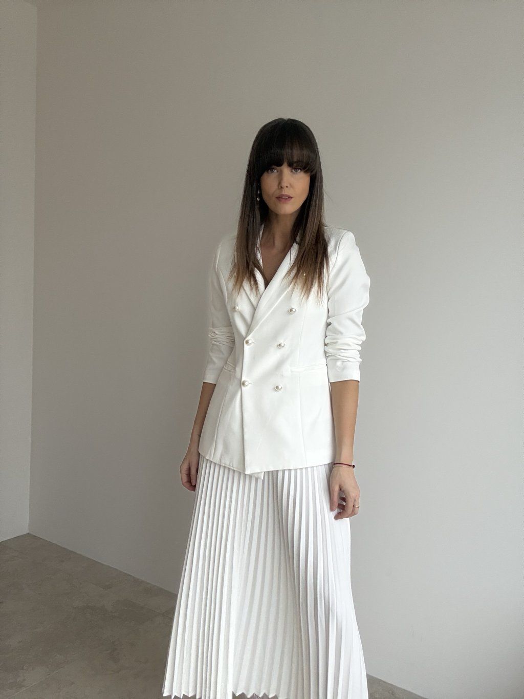 Two-piece set featuring a tailored longline blazer with double-breasted fastening and a pleated midi skirt. A refined, feminine outfit perfect for formal events, celebrations and special occasions.