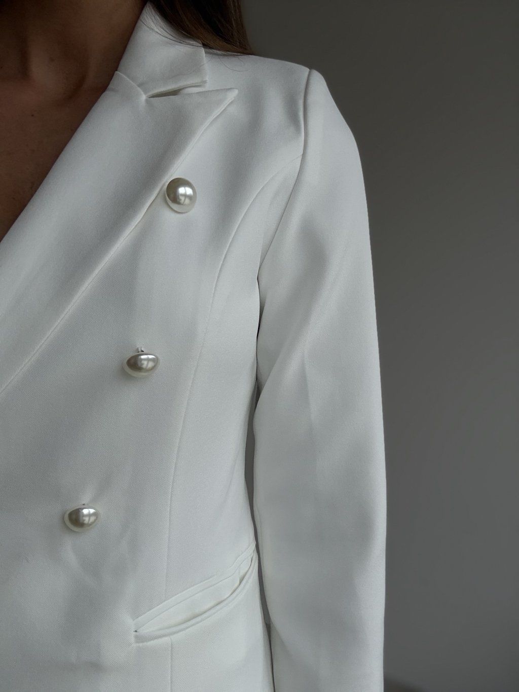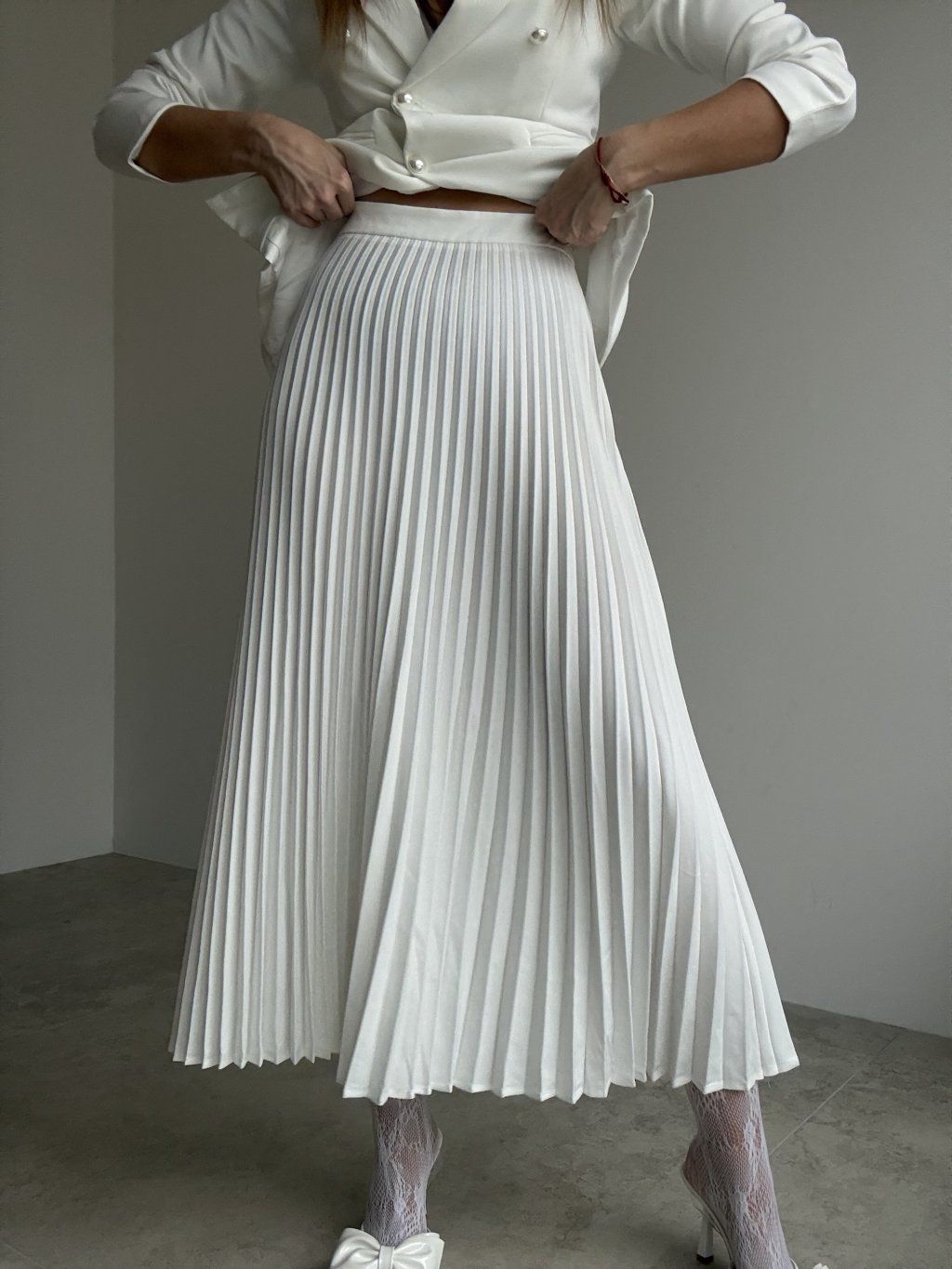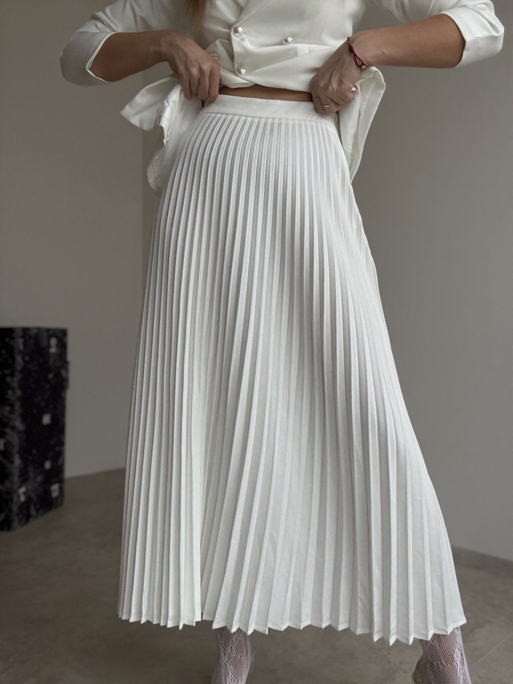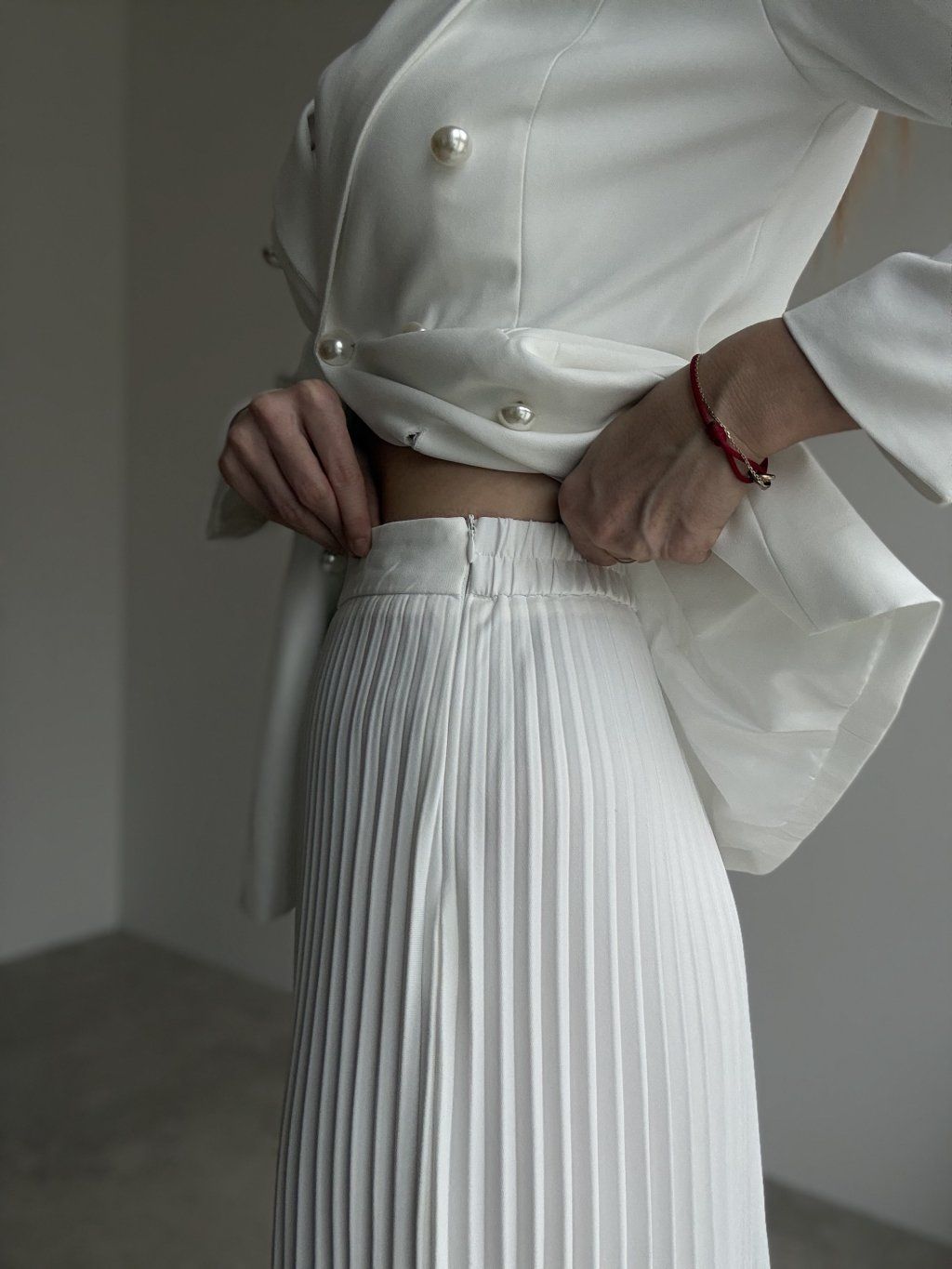 Two-piece set featuring a tailored longline blazer with double-breasted fastening and a pleated midi skirt. A refined, feminine outfit perfect for formal events, celebrations and special occasions.
