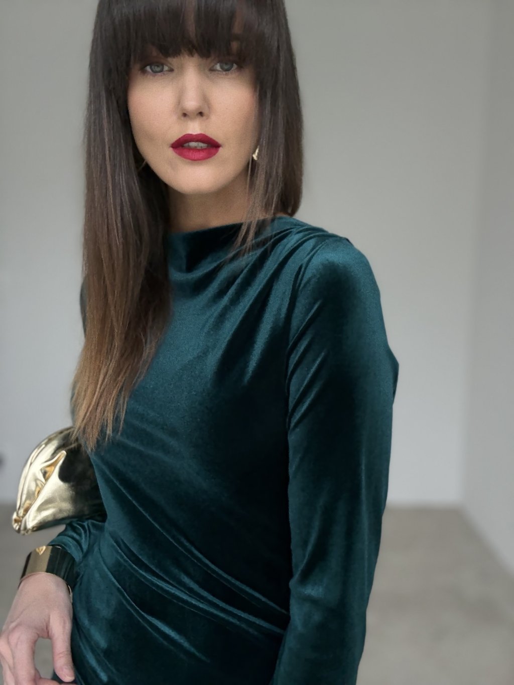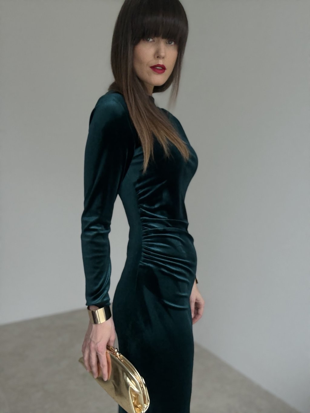 An elegant velvet dress with a subtle sheen and beautifully fluid drape that flatters the figure and feels exceptionally soft. The smooth stretch knit gently hugs the body, while the long sleeves and refined gathered bodice with a soft stand collar add a sophisticated touch. The midi length elongates the silhouette, making it perfect for events, evening occasions and festive moments.