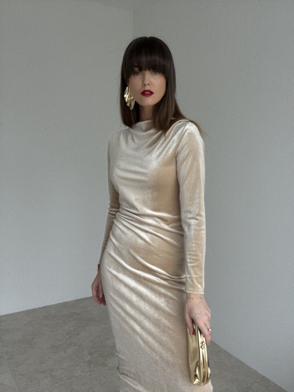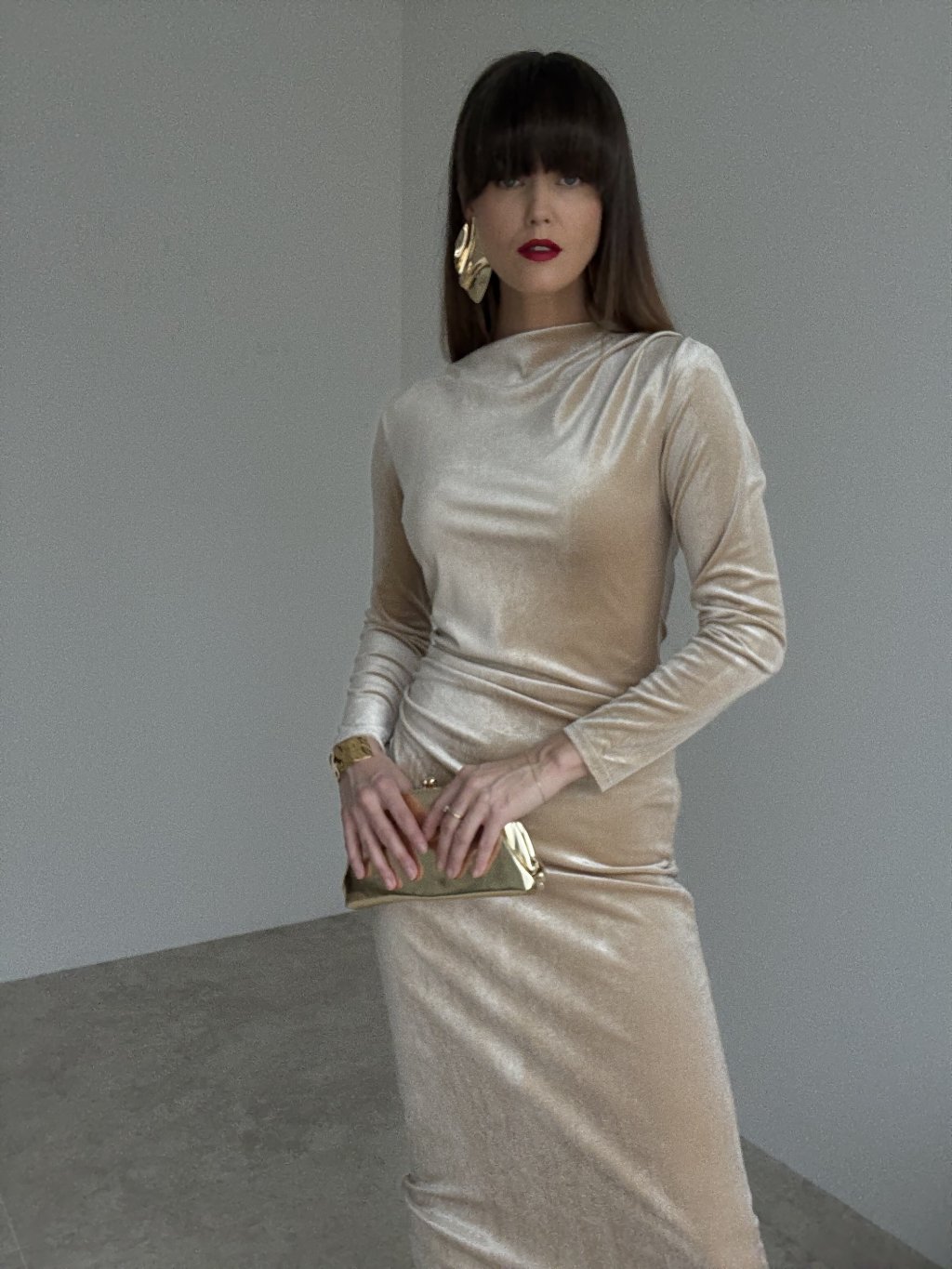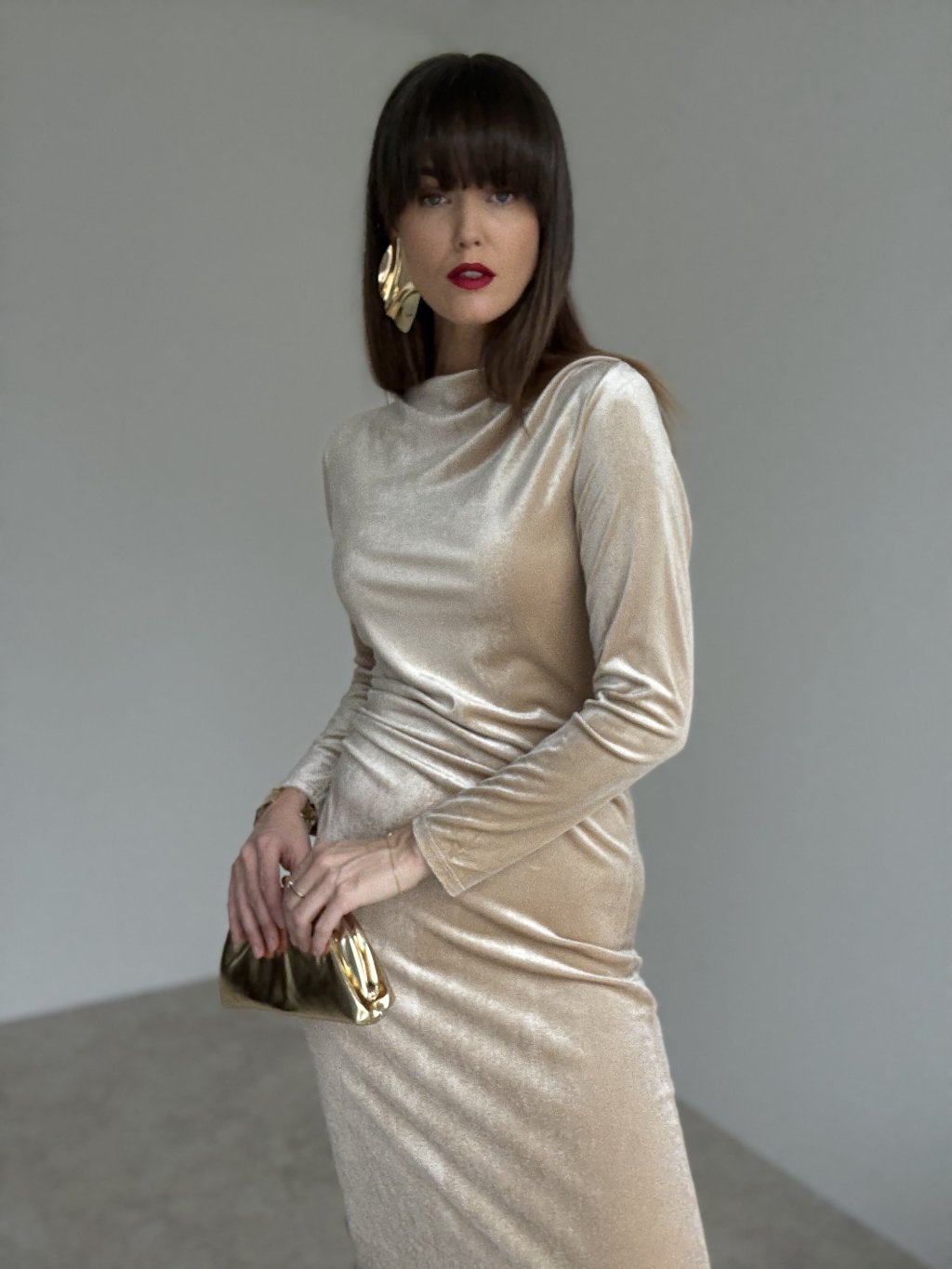 An elegant velvet dress with a subtle sheen and beautifully fluid drape that flatters the figure and feels exceptionally soft. The smooth stretch knit gently hugs the body, while the long sleeves and refined gathered bodice with a soft stand collar add a sophisticated touch. The midi length elongates the silhouette, making it perfect for events, evening occasions and festive moments.