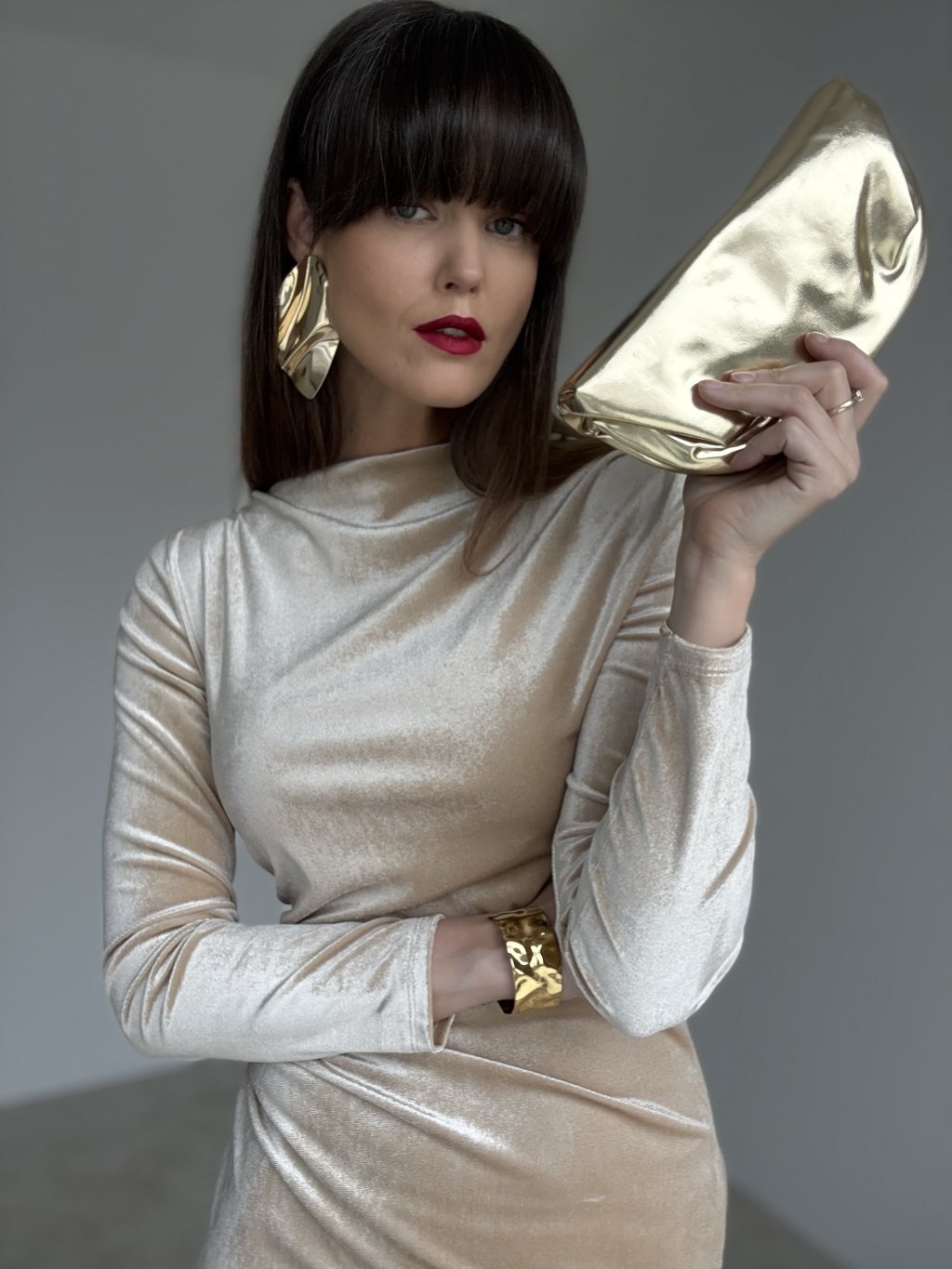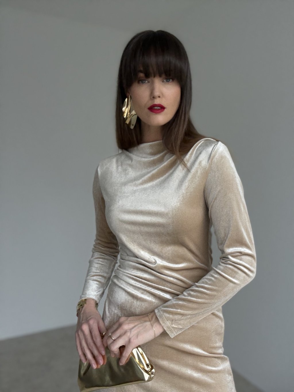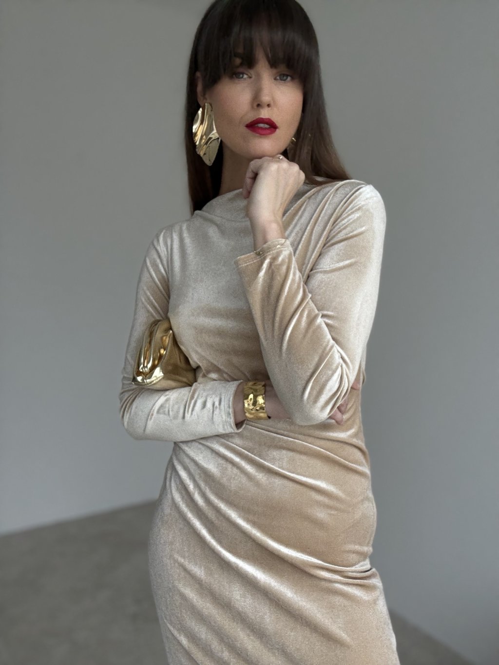 An elegant velvet dress with a subtle sheen and beautifully fluid drape that flatters the figure and feels exceptionally soft. The smooth stretch knit gently hugs the body, while the long sleeves and refined gathered bodice with a soft stand collar add a sophisticated touch. The midi length elongates the silhouette, making it perfect for events, evening occasions and festive moments.