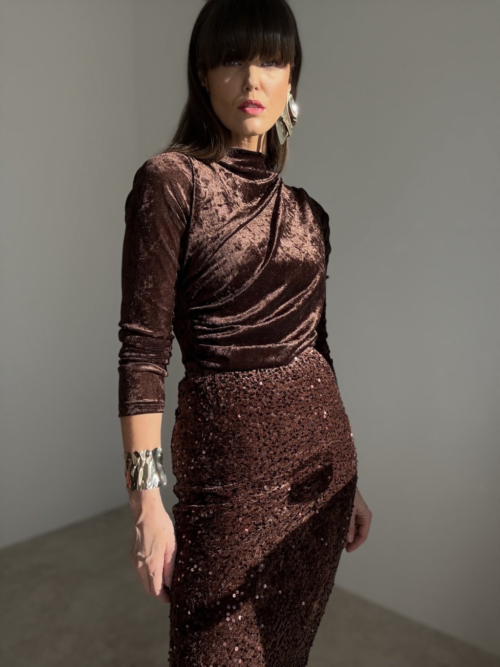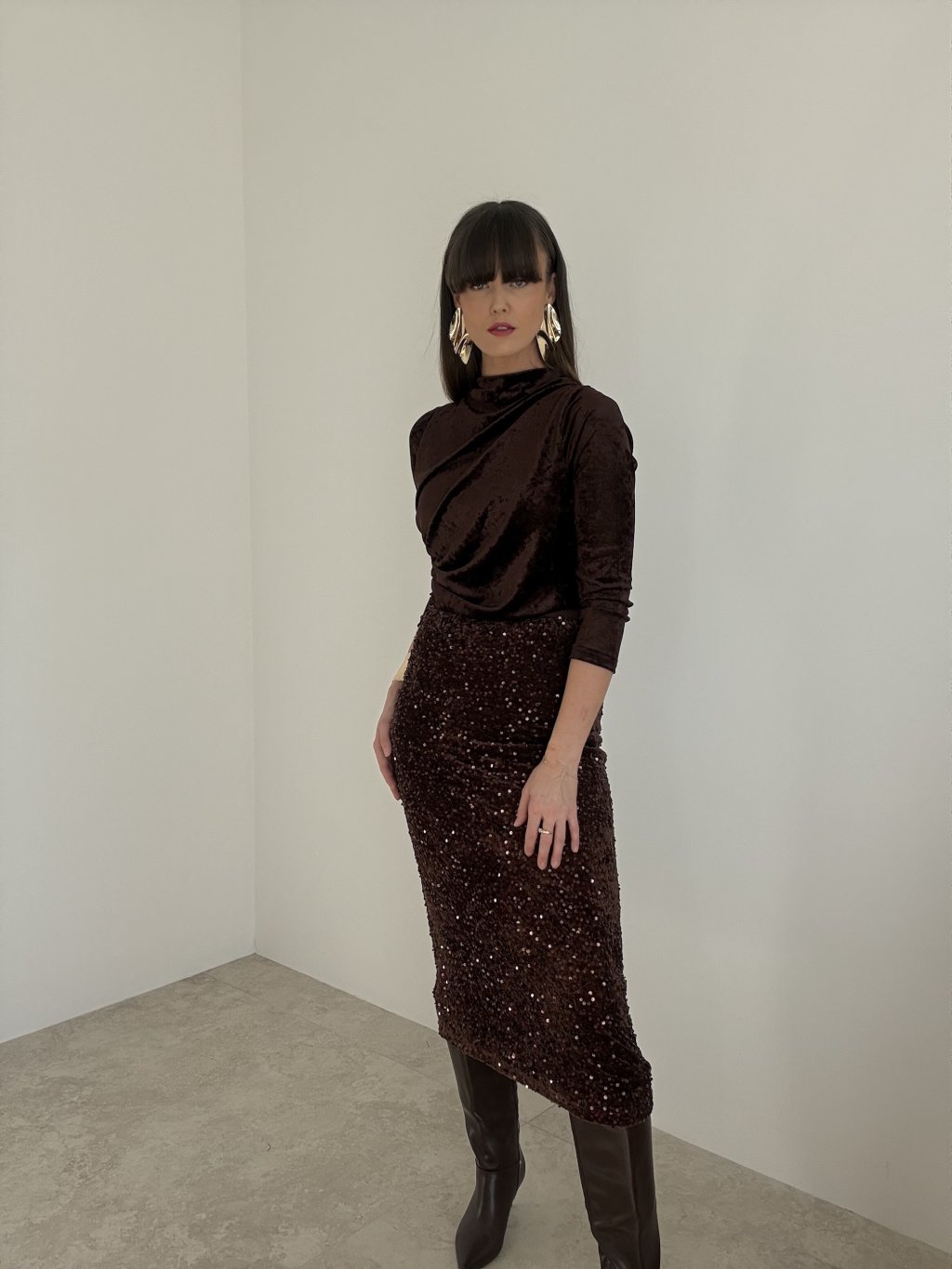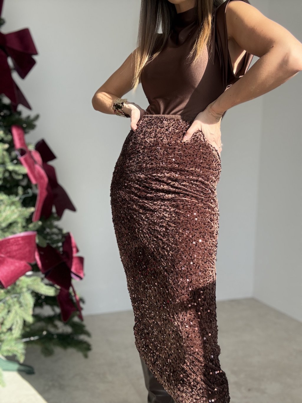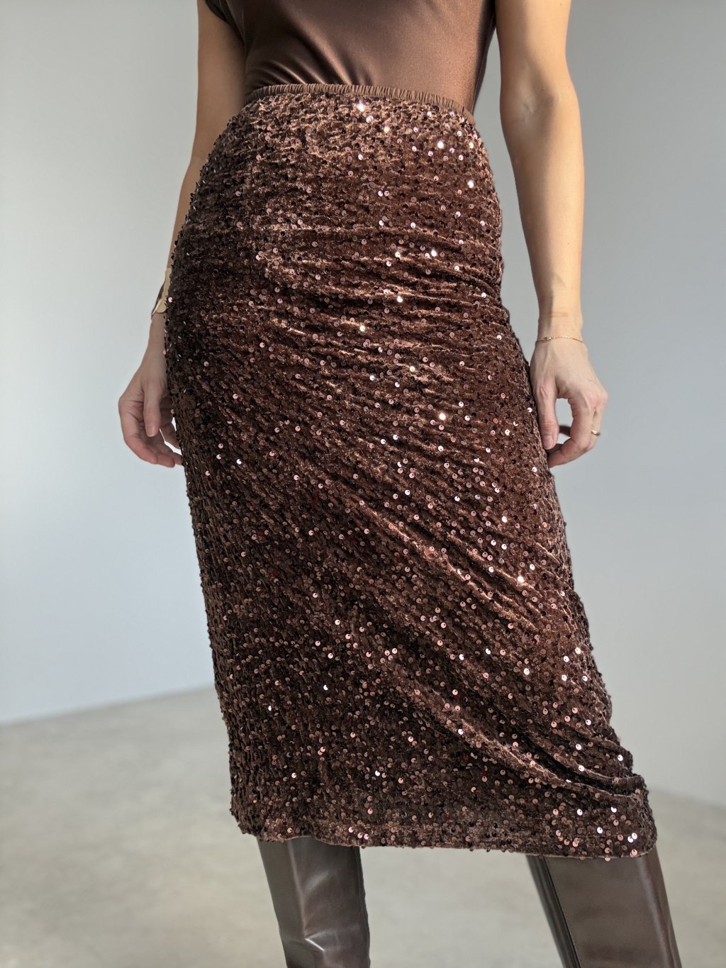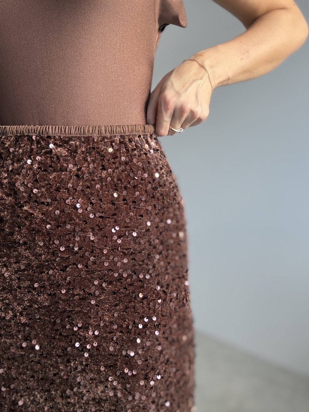 This velvet skirt with a richly sequined texture brings an elegant and luxurious touch to any outfit. The fitted silhouette beautifully shapes the body, while the elastic waistband ensures comfort and a flattering fit. The dense sequins create a soft, sparkling effect with every movement. With its sophisticated midi length, the skirt pairs perfectly with tops, bodysuits, turtlenecks or elegant blouses. Ideal for parties, festive events or creating a statement look with a simple upper piece.
