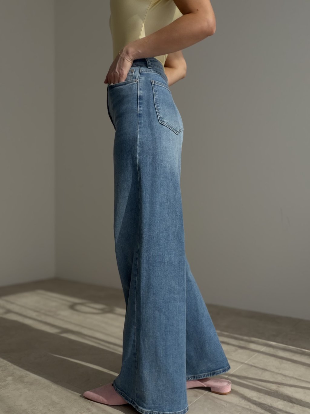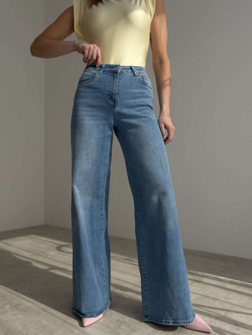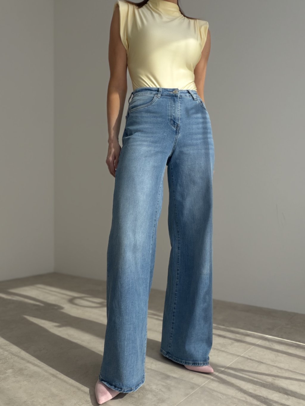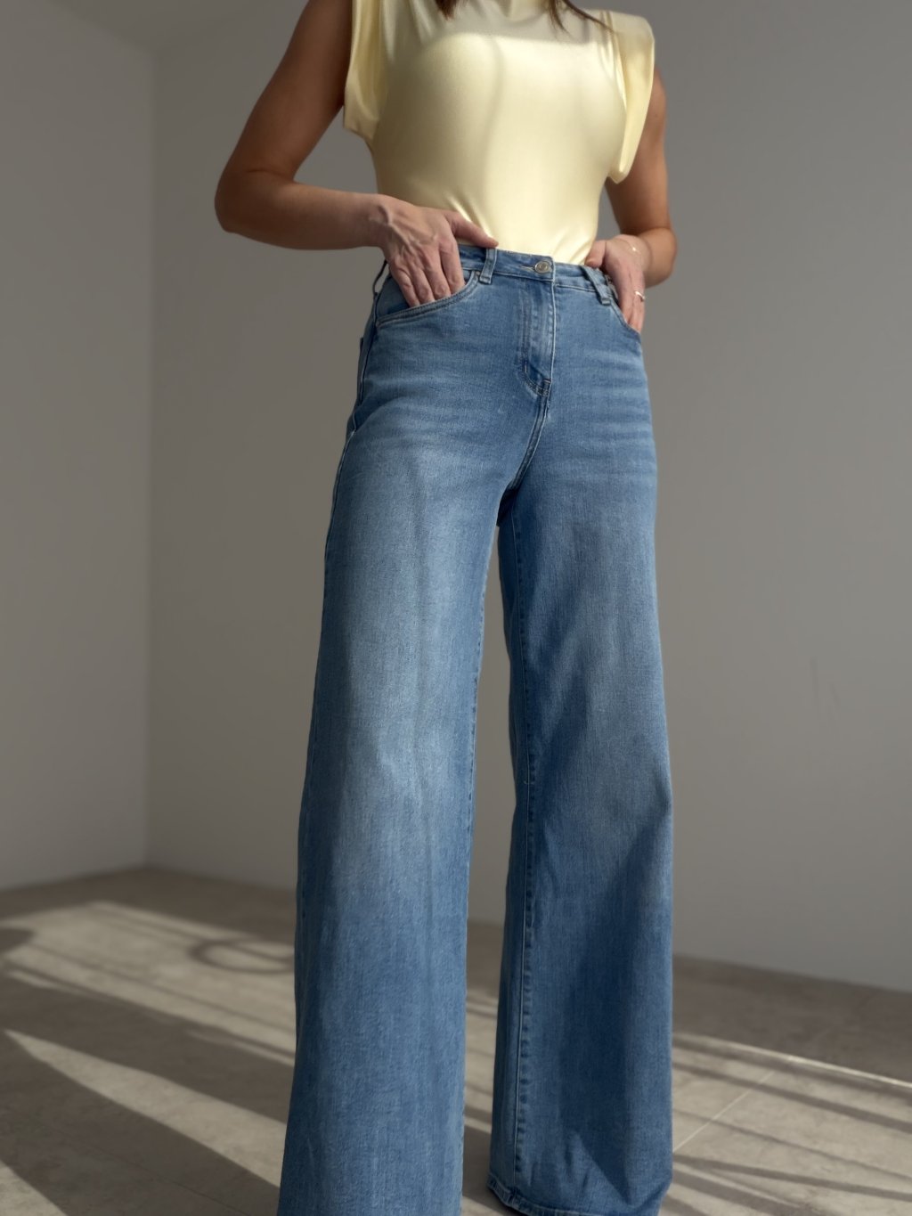 Wide-leg jeans with a high waist that visually elongate the legs and highlight the silhouette. The timeless cut and comfortable denim make them perfect for everyday and elegant outfits.