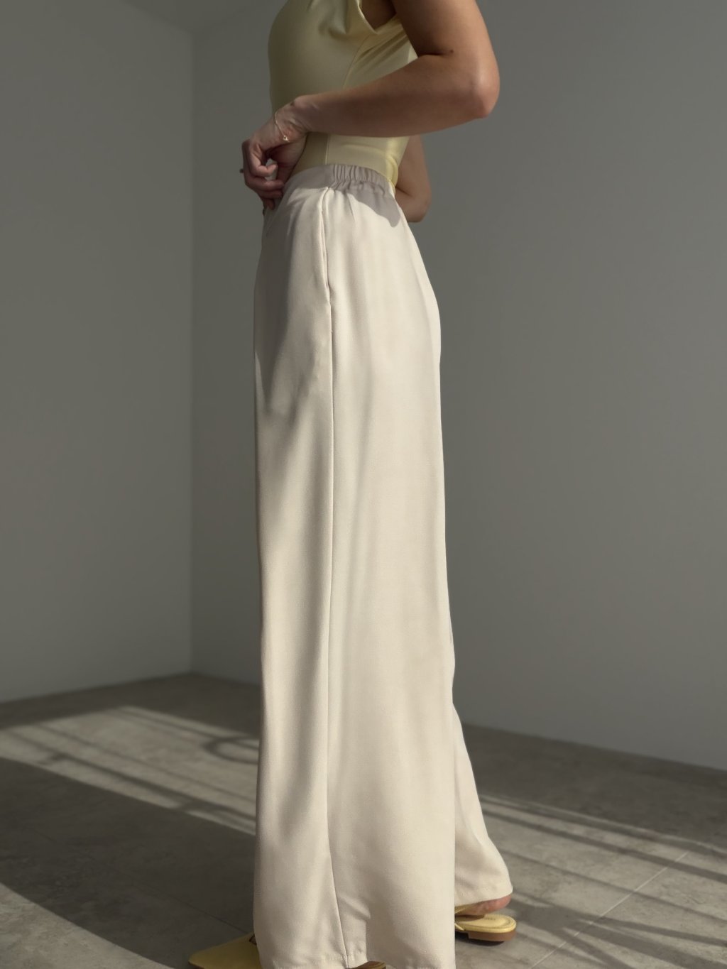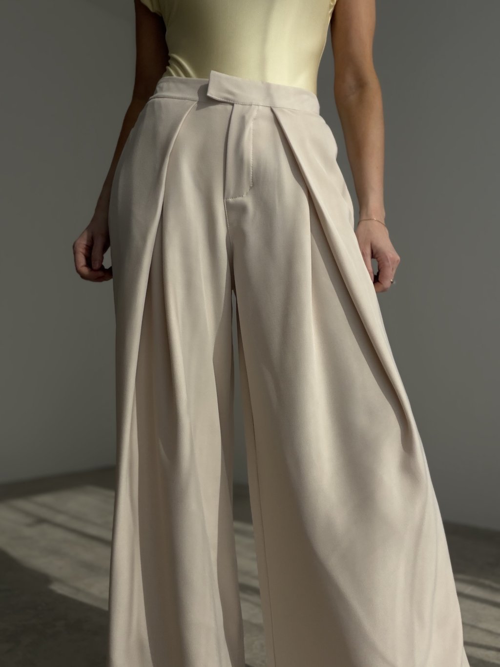 Elegant wide-leg trousers are a perfect choice for women who love comfort while keeping a polished and feminine look. The front has a refined appearance thanks to clean lines and delicate pleat detailing at the waist, creating a beautiful flowing effect when walking. The cut visually elongates the silhouette and adds a sophisticated touch to any outfit.