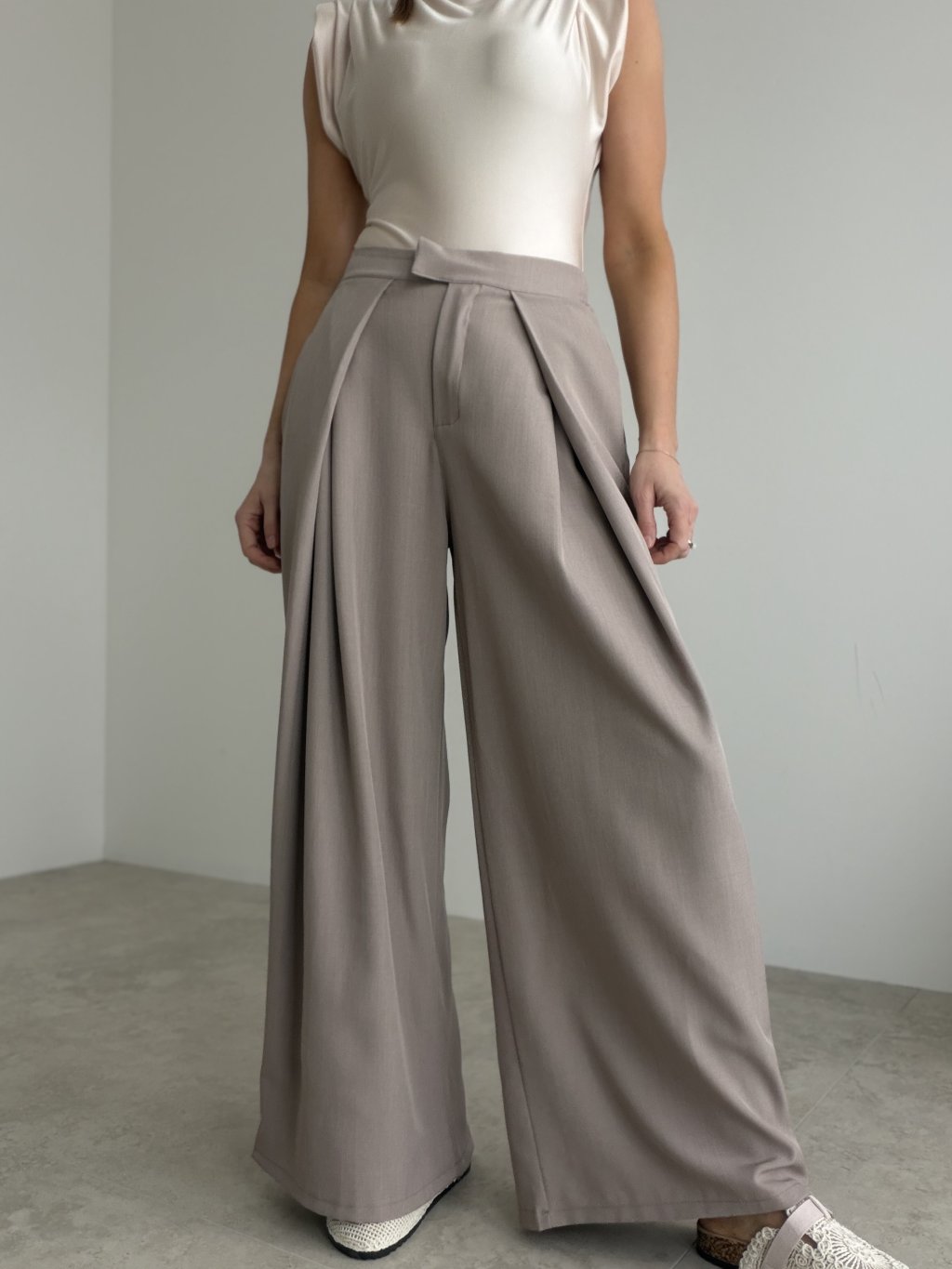 Elegant wide-leg trousers are a perfect choice for women who love comfort while keeping a polished and feminine look. The front has a refined appearance thanks to clean lines and delicate pleat detailing at the waist, creating a beautiful flowing effect when walking. The cut visually elongates the silhouette and adds a sophisticated touch to any outfit.