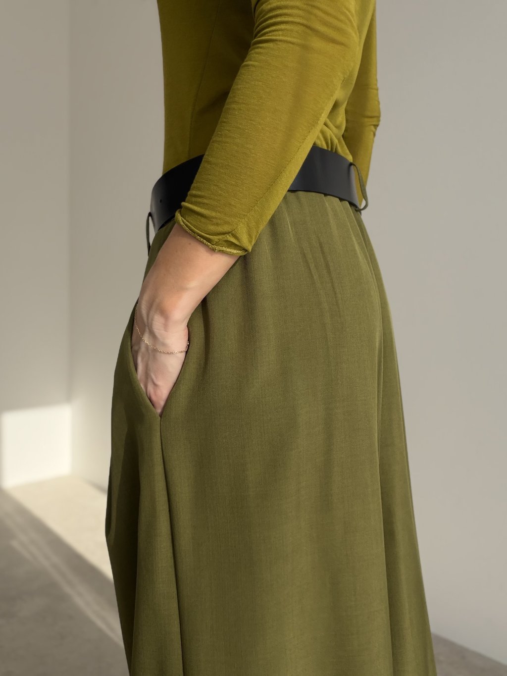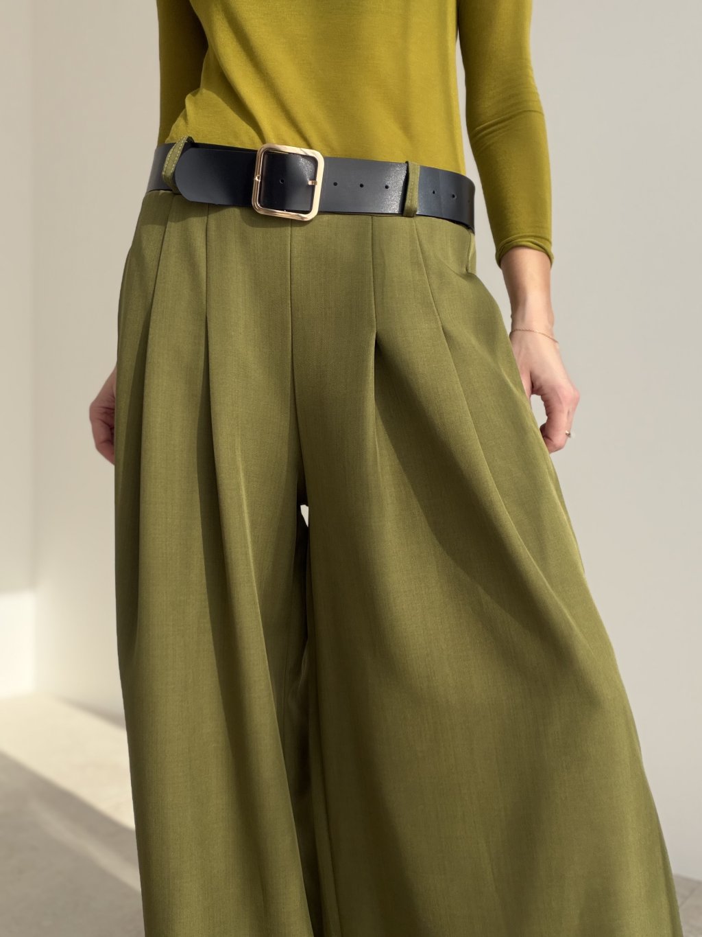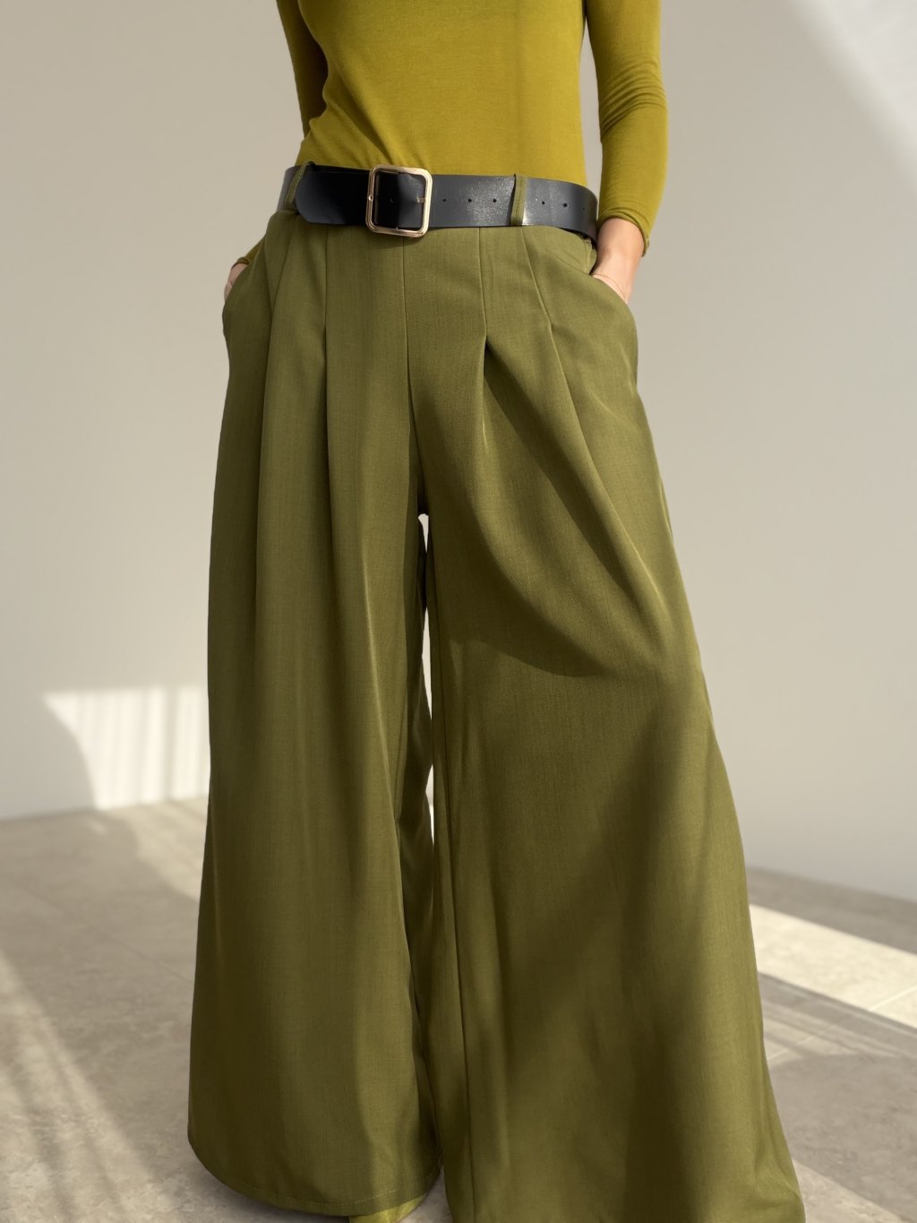Elegant wide-leg trousers designed to elongate the silhouette and create a polished, refined look. The cut is made to highlight the waist while keeping the fit comfortable throughout the day. Subtle front pleats add structure and a premium feel, helping the fabric fall beautifully as you move. With practical pockets and a versatile shape, they work perfectly for the office, meetings, and evening looks—just switch the top and accessories to match the occasion.