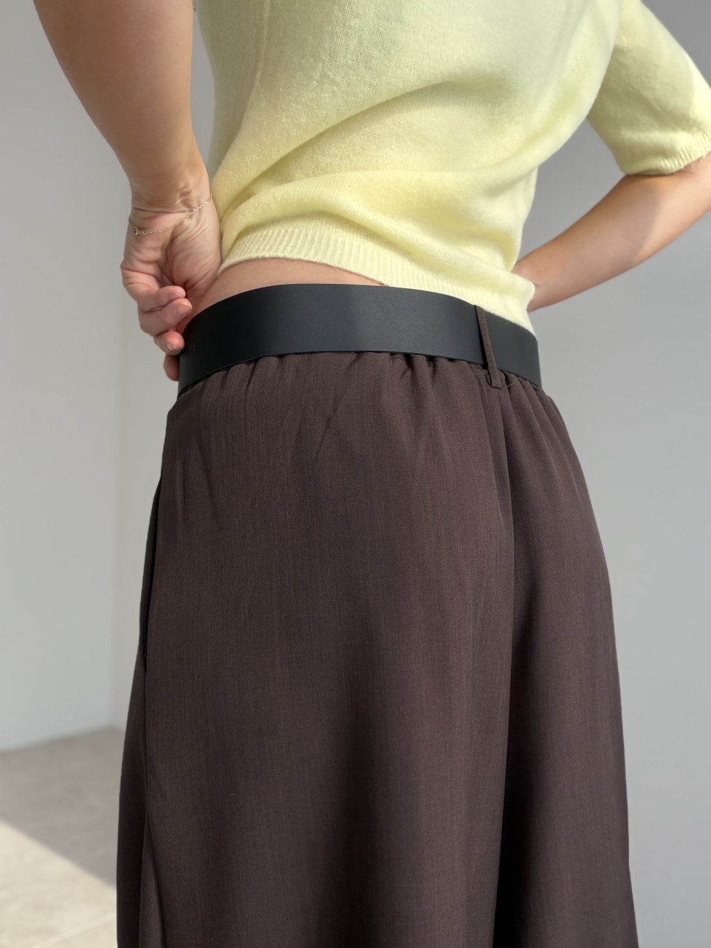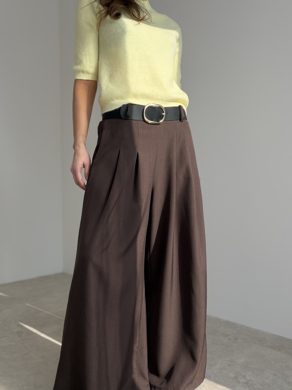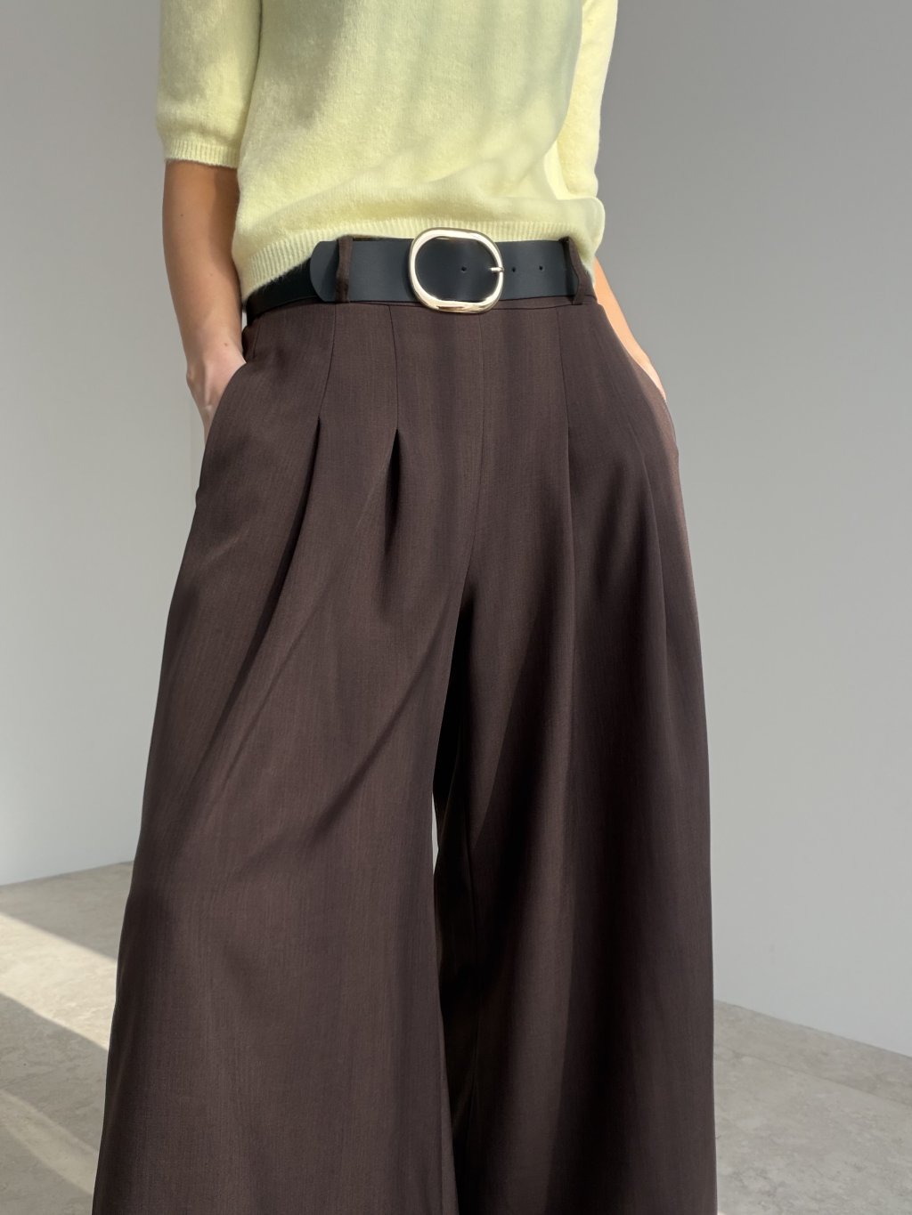 Elegant wide-leg trousers designed to elongate the silhouette and create a polished, refined look. The cut is made to highlight the waist while keeping the fit comfortable throughout the day. Subtle front pleats add structure and a premium feel, helping the fabric fall beautifully as you move. With practical pockets and a versatile shape, they work perfectly for the office, meetings, and evening looks—just switch the top and accessories to match the occasion.