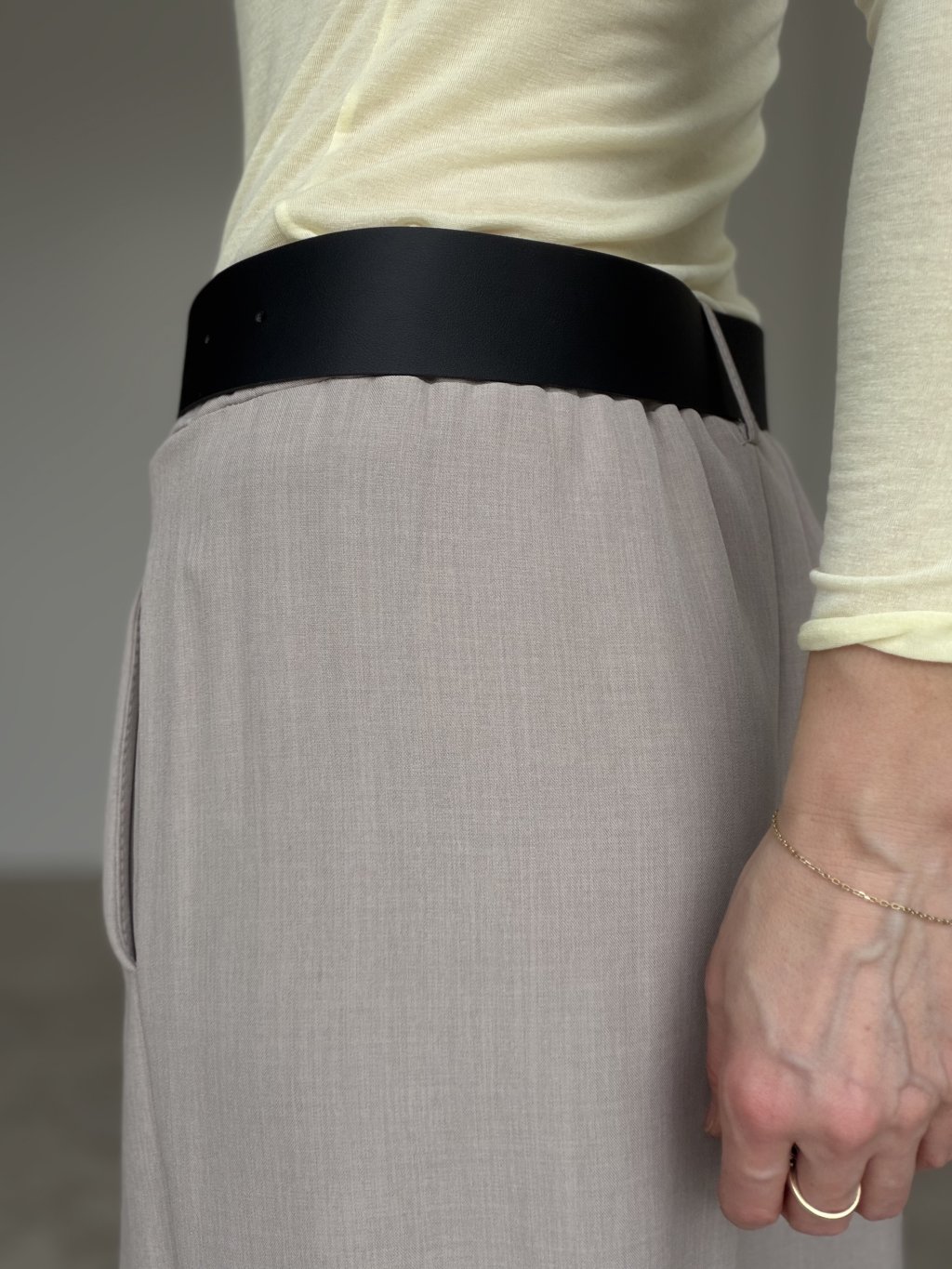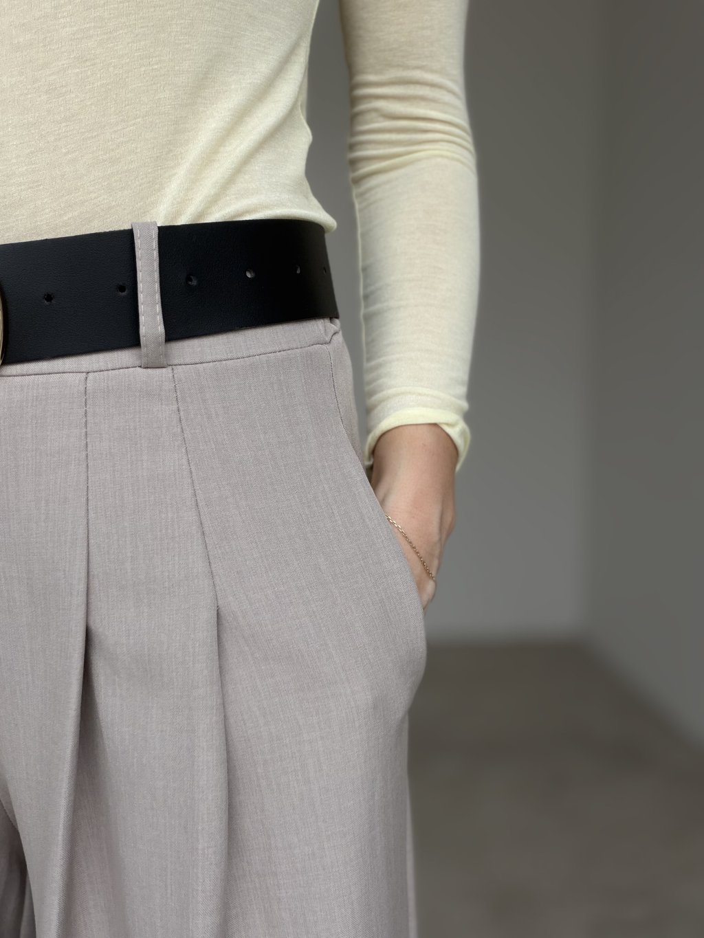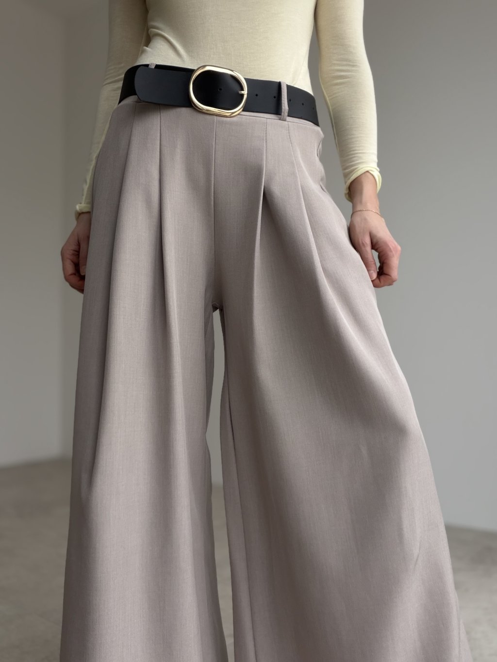 Elegant wide-leg trousers designed to elongate the silhouette and create a polished, refined look. The cut is made to highlight the waist while keeping the fit comfortable throughout the day. Subtle front pleats add structure and a premium feel, helping the fabric fall beautifully as you move. With practical pockets and a versatile shape, they work perfectly for the office, meetings, and evening looks—just switch the top and accessories to match the occasion.
