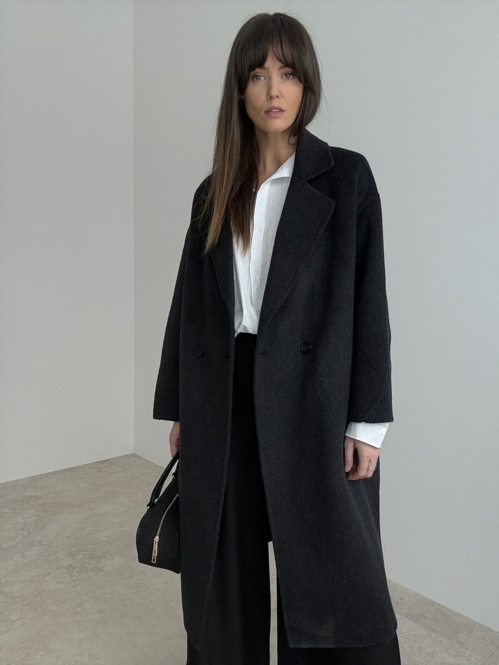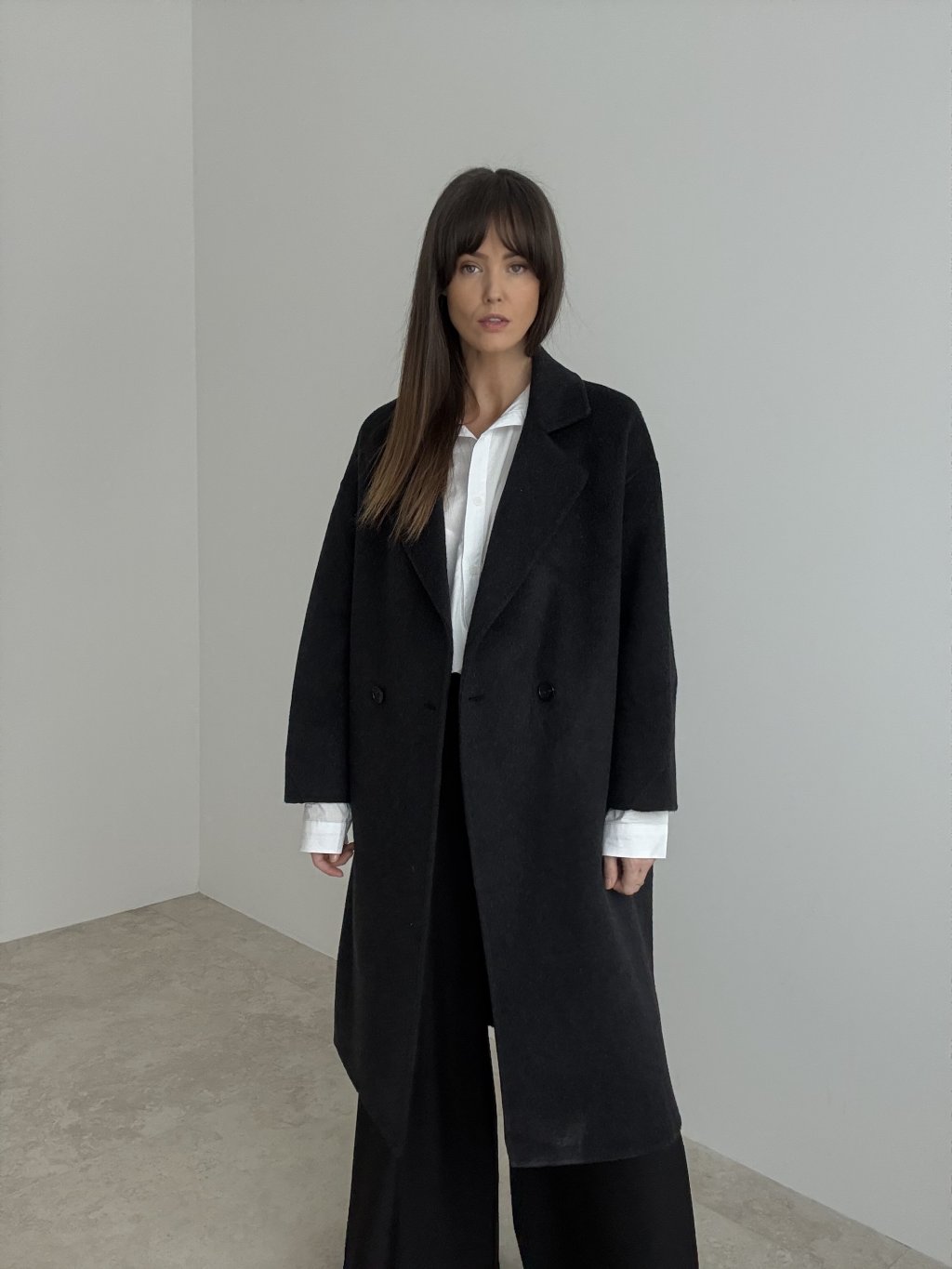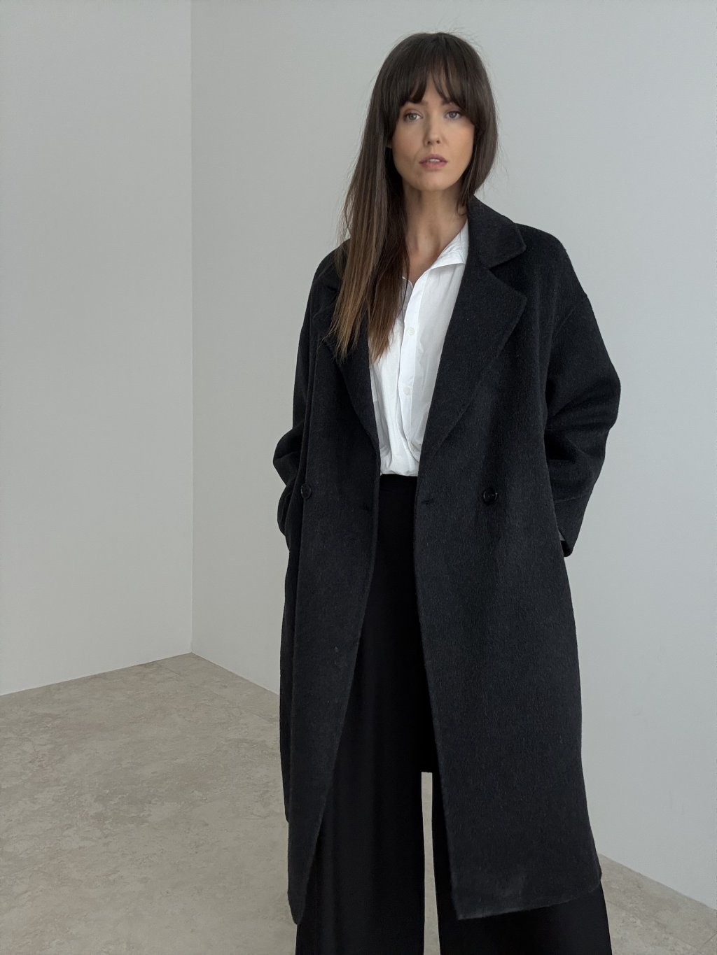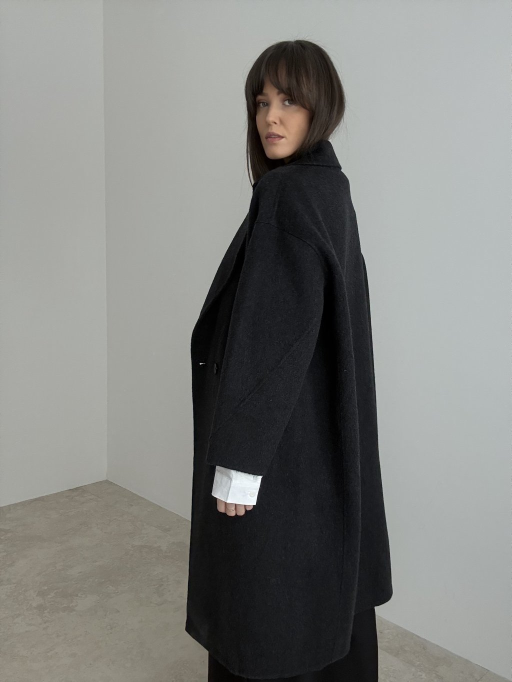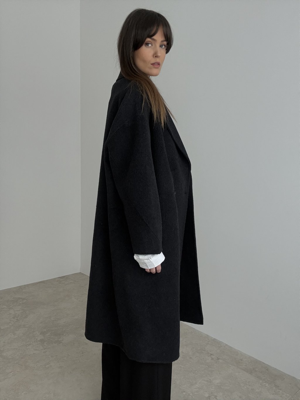 Handmade wool coat with a longer relaxed fit and classic lapels for a timeless, elegant look.