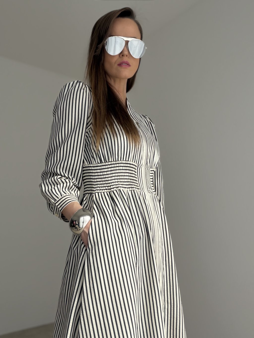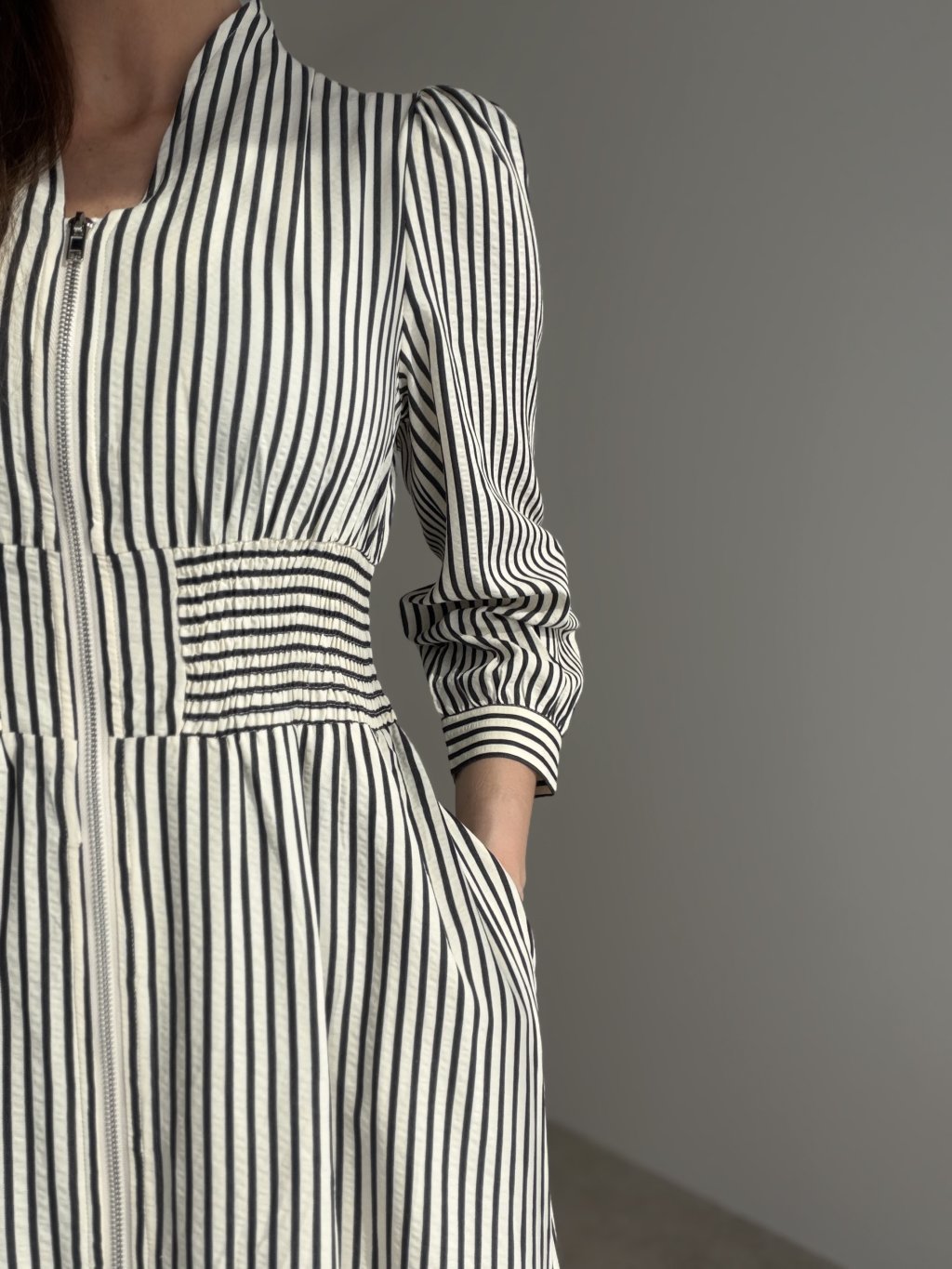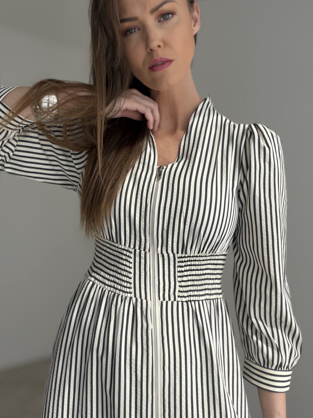 Elegant zip-front dress with a long skirt, defined waist and long sleeves for a feminine and sophisticated look. A timeless piece that works beautifully for everyday wear as well as more polished occasions.