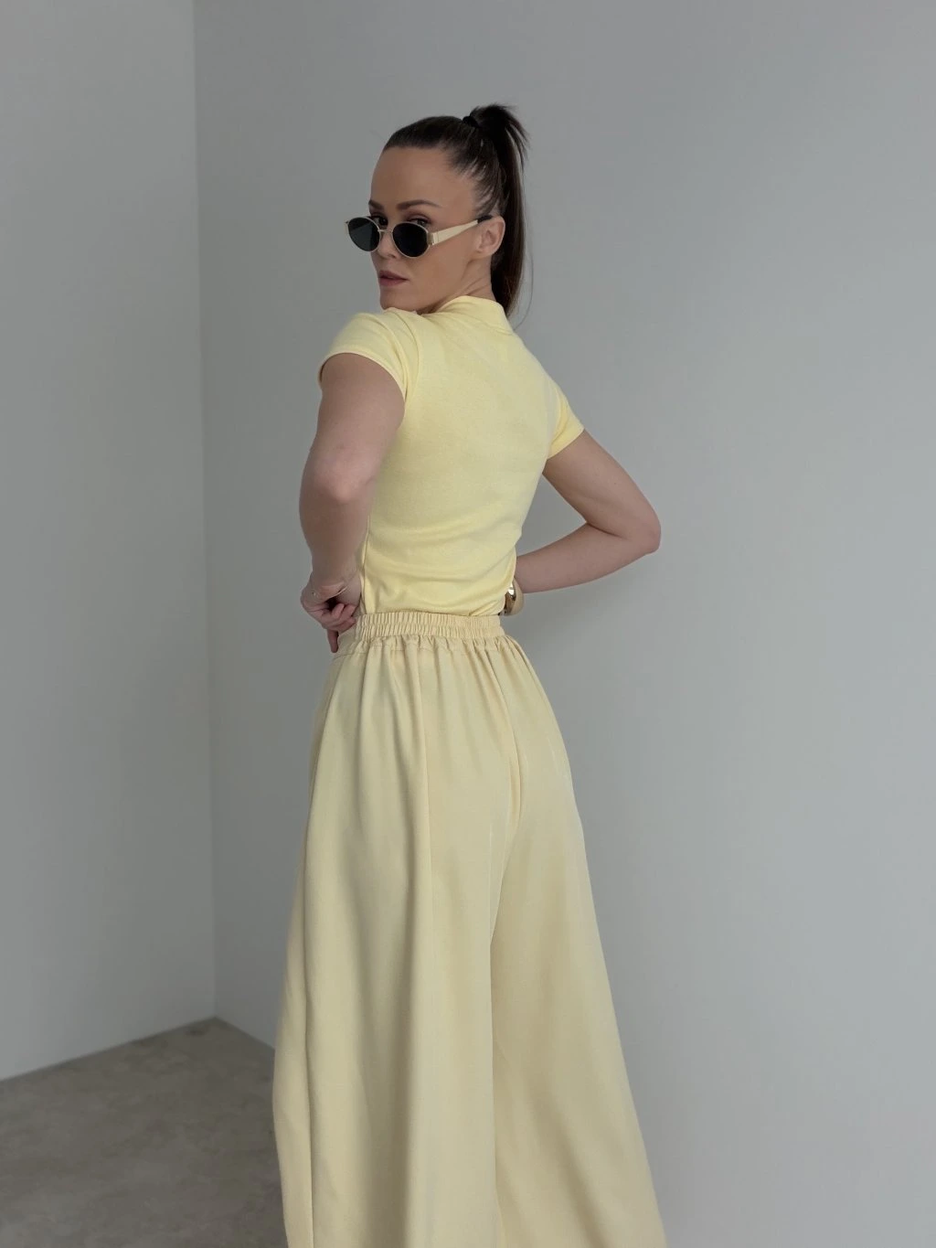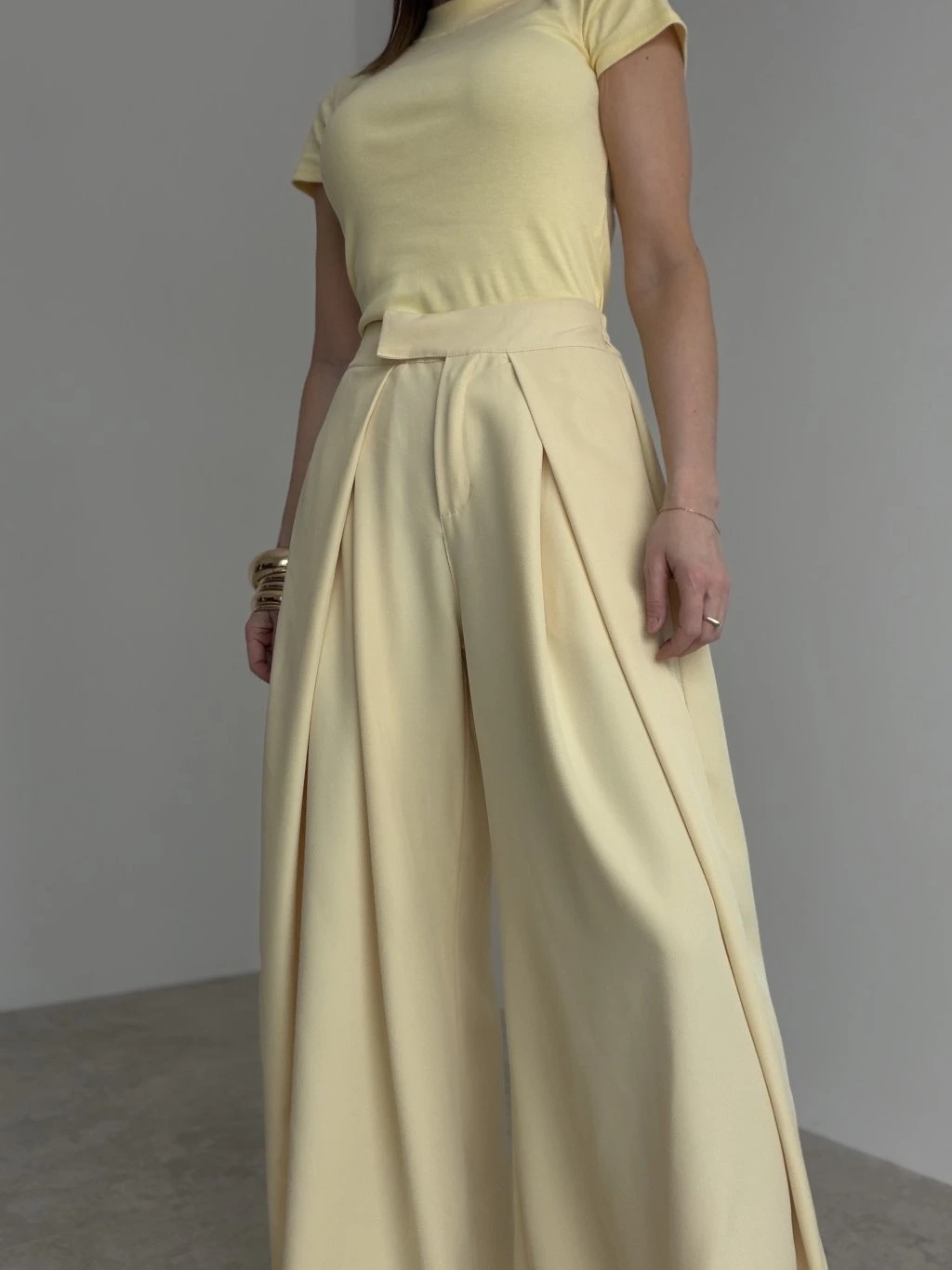 Elegantné široké nohavice s vysokým pásom, ktoré pôsobia upravene a zároveň sú maximálne pohodlné na celodenné nosenie. Predná časť so záhybmi vytvára krásnu siluetu a dodáva outfitu štruktúru, zatiaľ čo zadná časť pásu je riešená pružne, aby sa nohavice príjemne prispôsobili postave. Voľné, široké nohavice splývajú pri chôdzi, opticky predlžujú nohy a ľahko sa kombinujú do pracovných aj voľnočasových outfitov. Stačí zmeniť top a obuv a získaš úplne iný štýl – od minimalistického po elegantný.