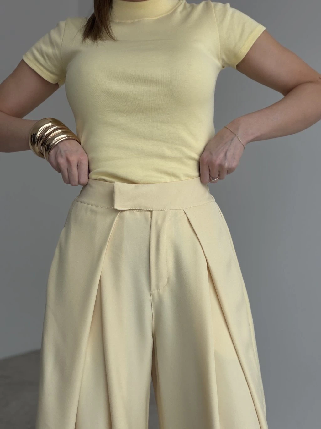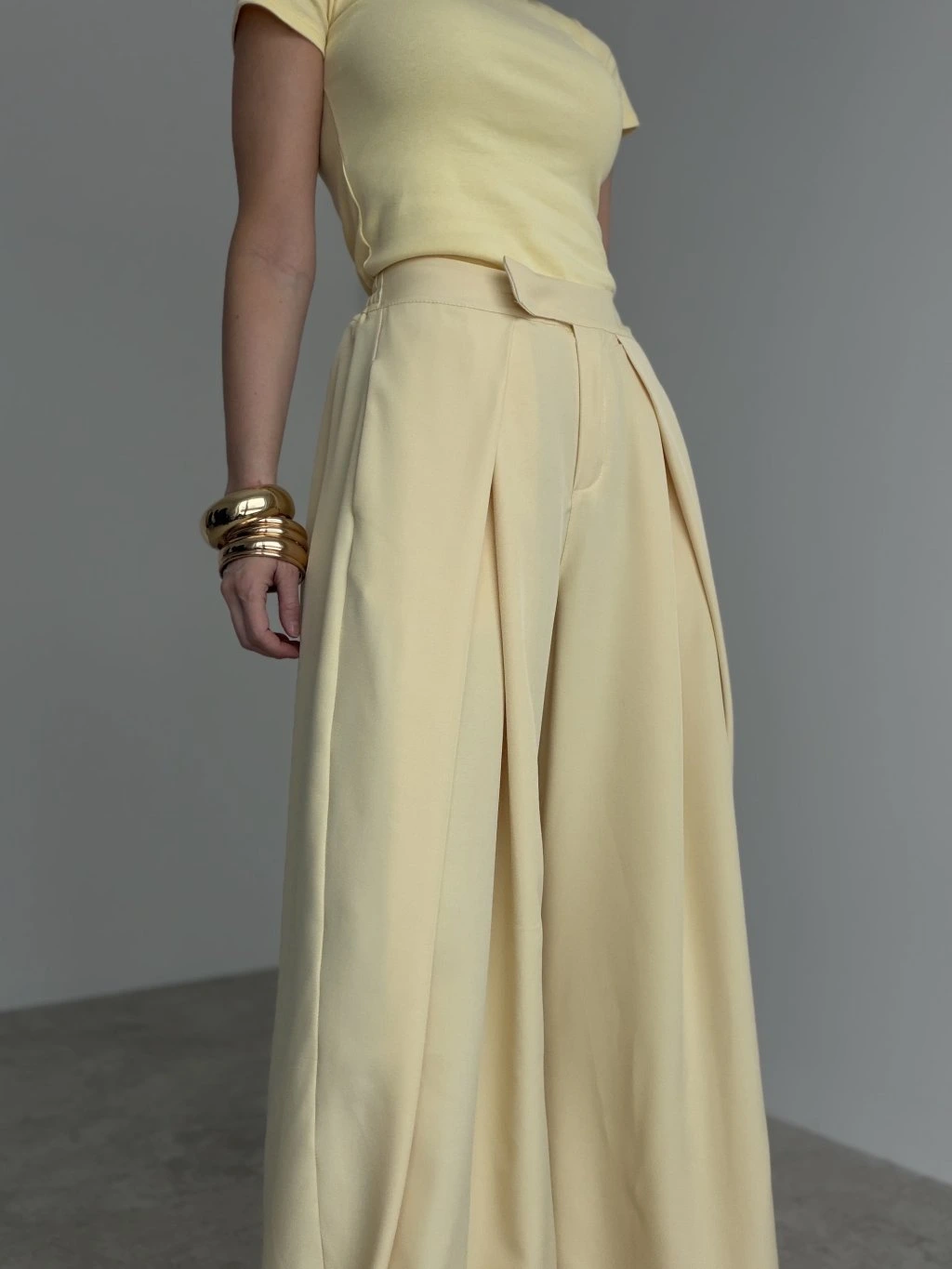 Široké nohavice s vysokým pásom, záhybmi vpredu a pružným pásom vzadu. Pohodlný, elegantný strih na každý deň aj do práce.
