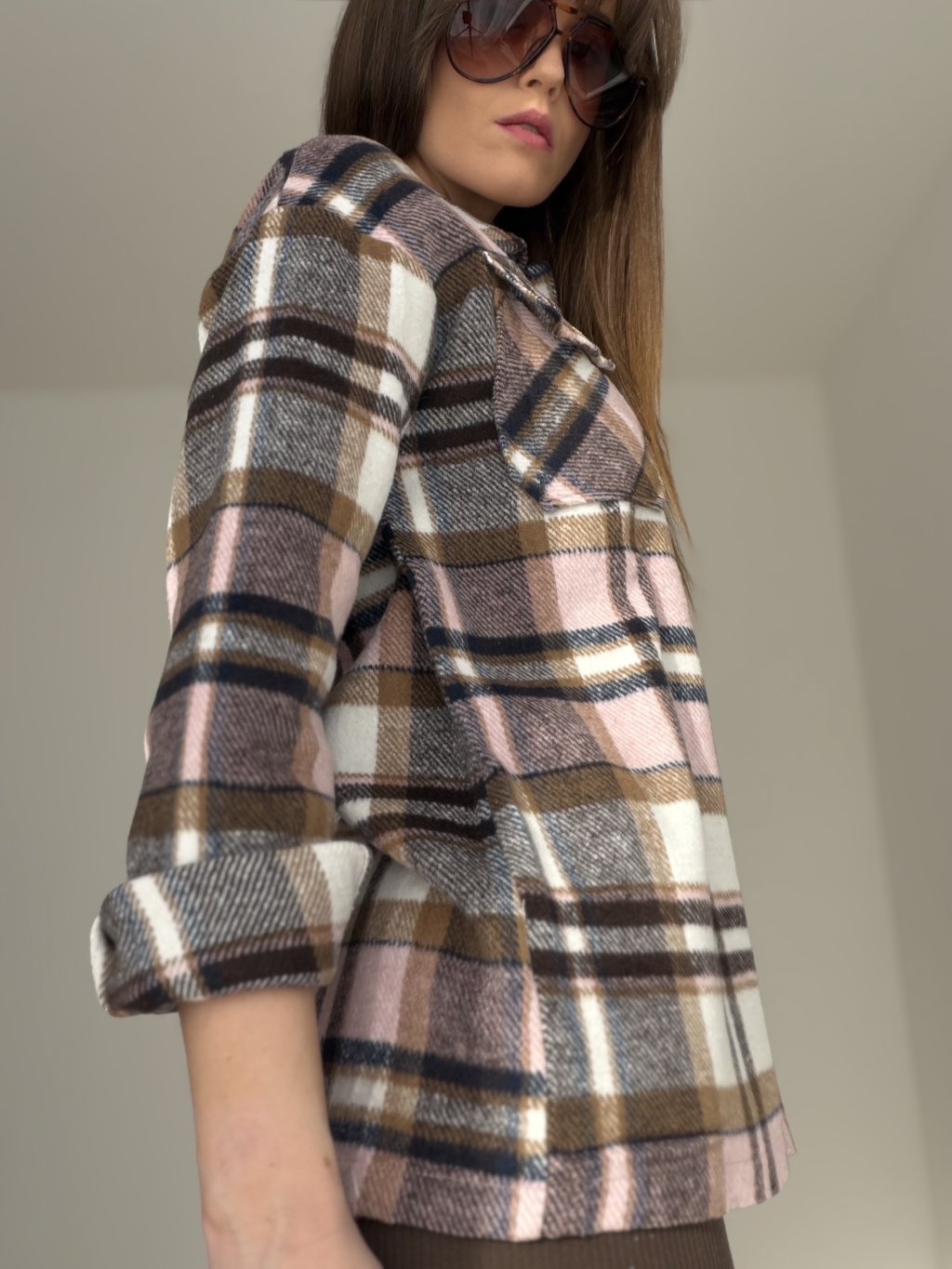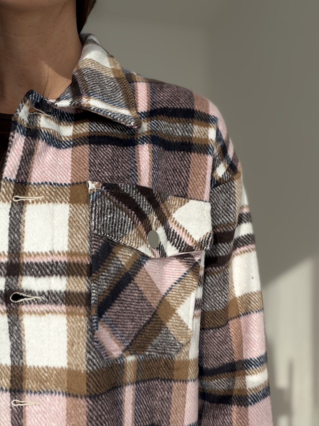 Košeľová bunda v károvanom dizajne so zapínaním na gombíky a náprsnými vreckami. Pohodlný voľnejší strih ideálny na vrstvenie.