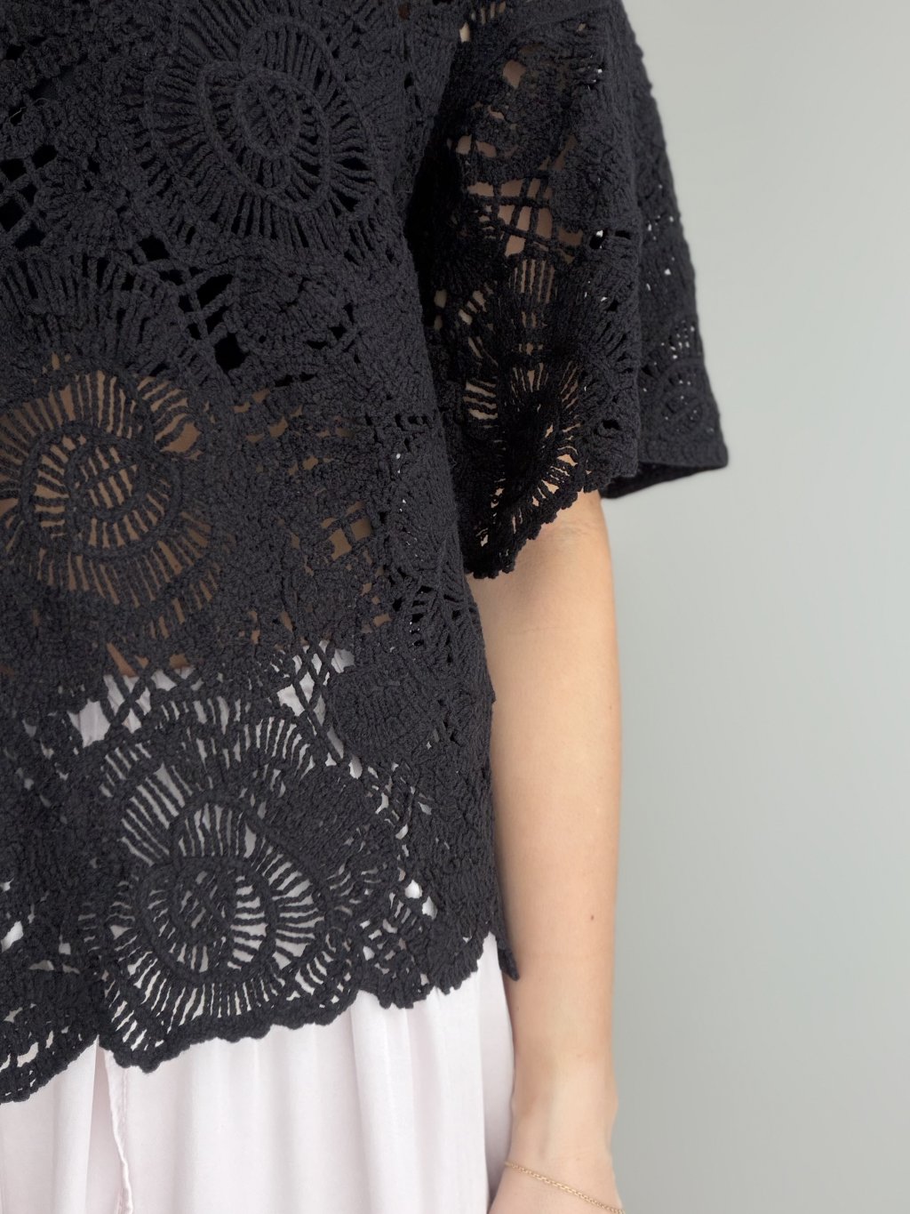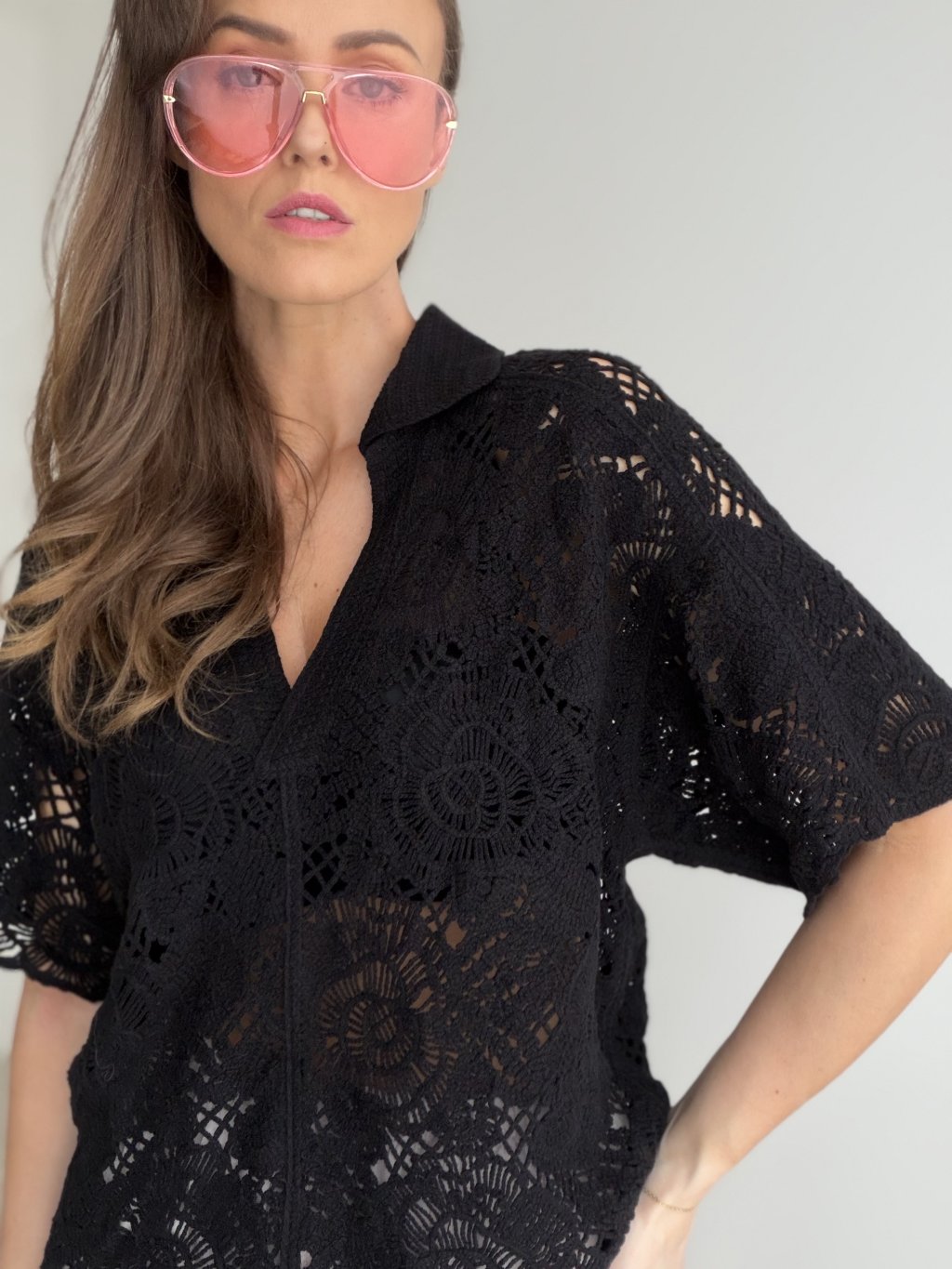 Vzdušný háčkovaný top s voľným strihom, výstrihom do V a ozdobným vzorom. Skvelý na vrstvenie aj letné kombinácie.
