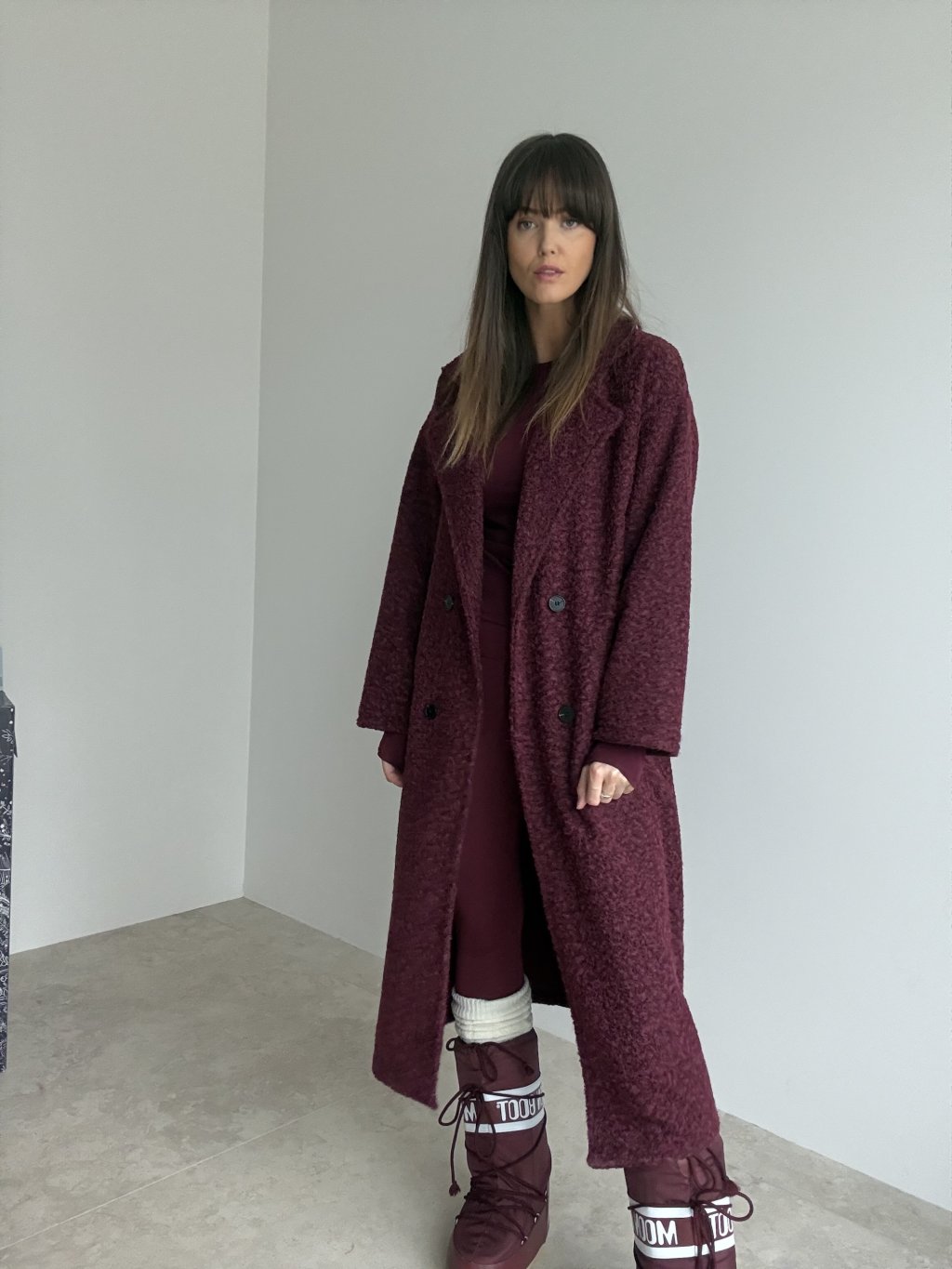 Dlhý, mierne oversize kabát z mäkkého, hrejivého materiálu s fazónovým golierom, gombíkovým zapínaním a vreckami po bokoch. Nepodšitý model, ideálny na vrstvenie cez pleteniny a šaty, vytvára moderný zimný outfit.