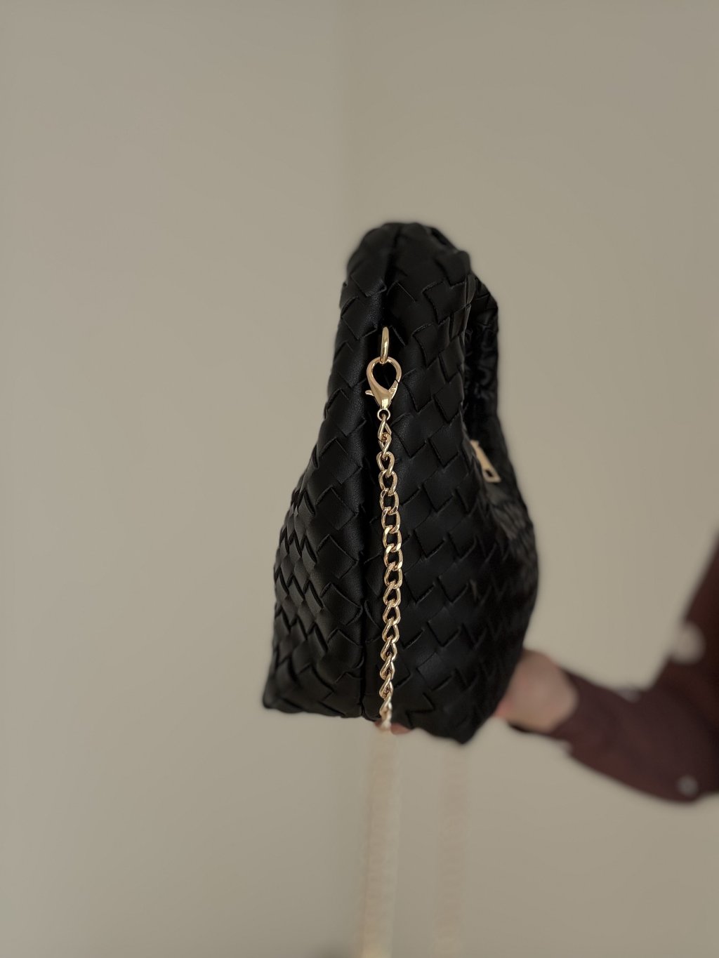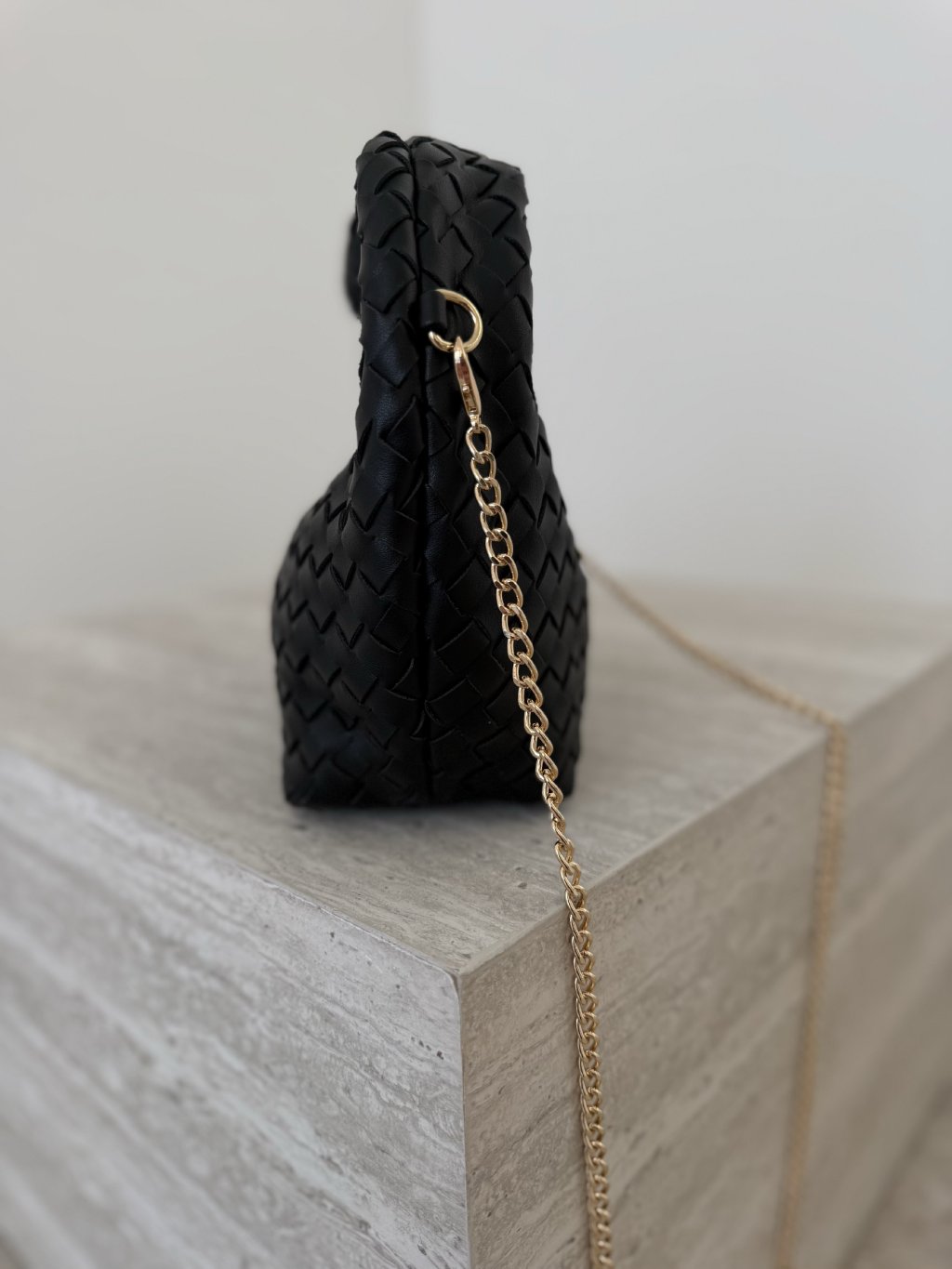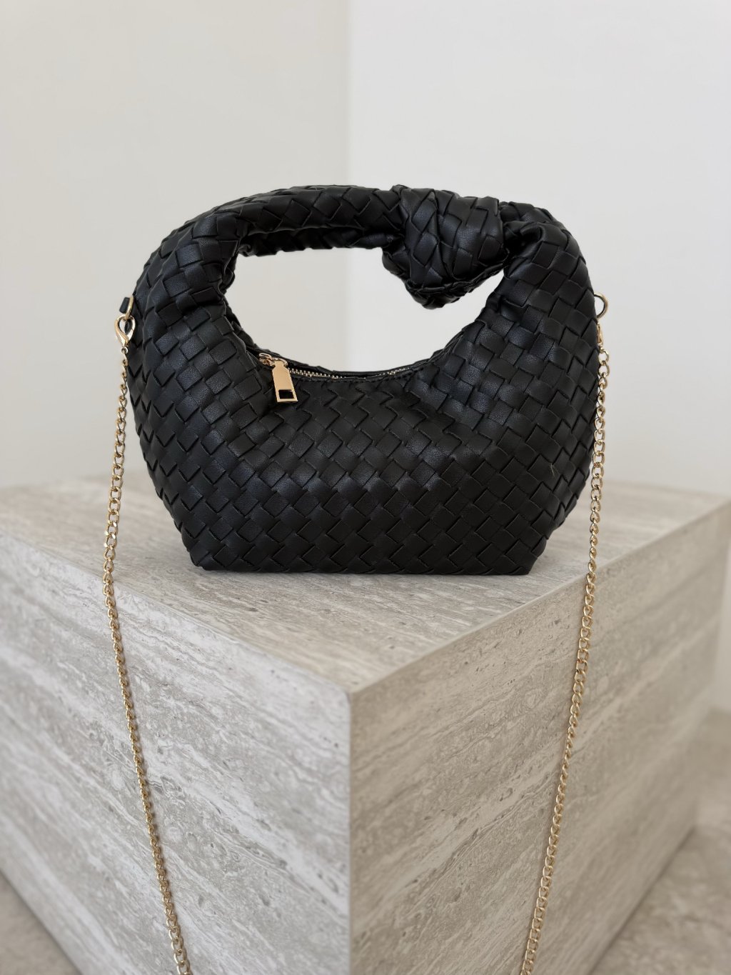 Kompaktná kabelka s prepletaným efektom a odnímateľnou retiazkou. Vhodná na nosenie v ruke aj na pleci, ideálna na každodenné essentials.