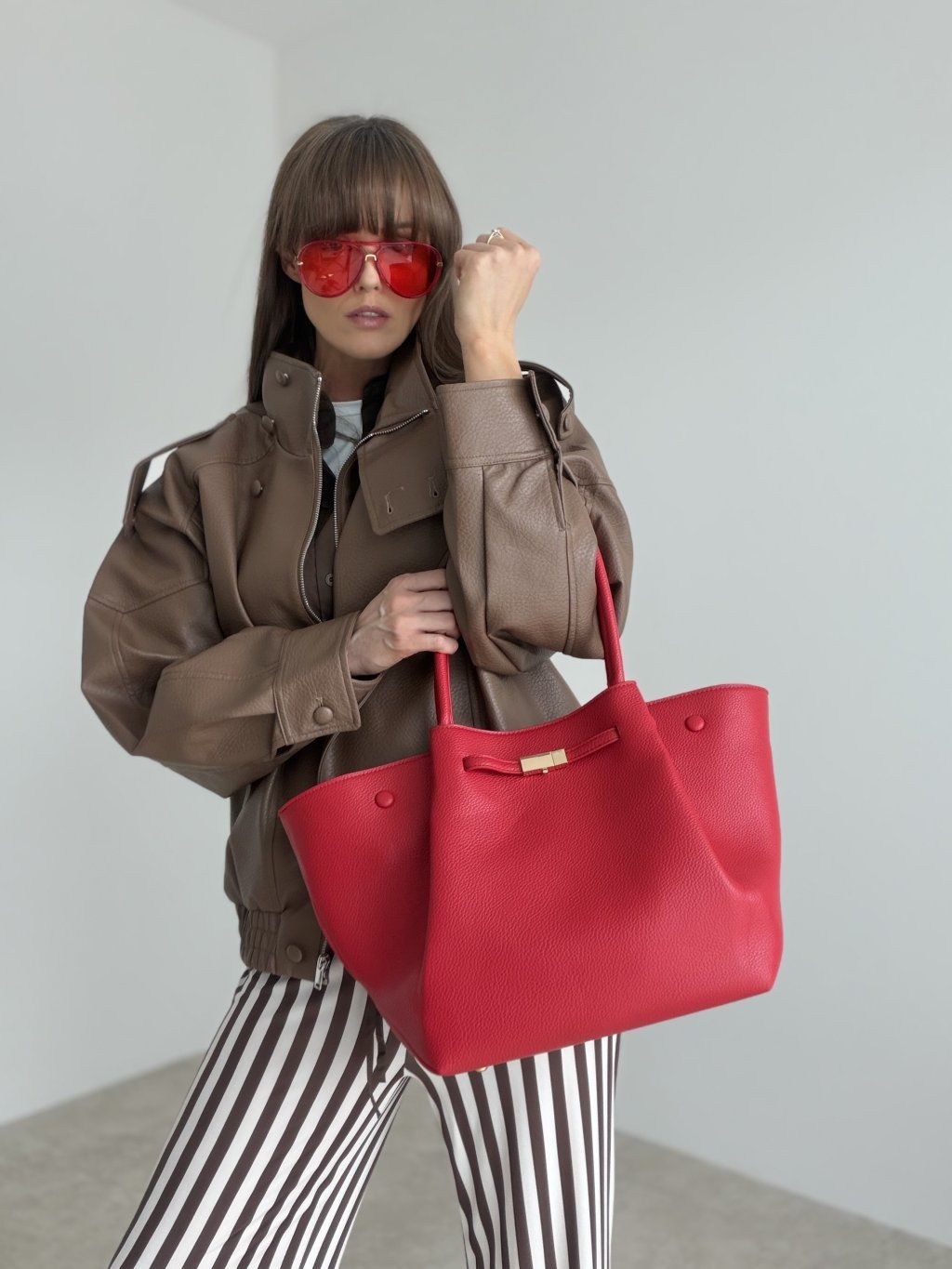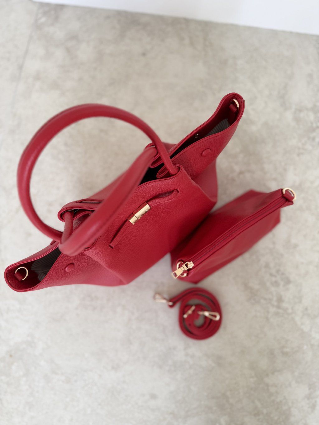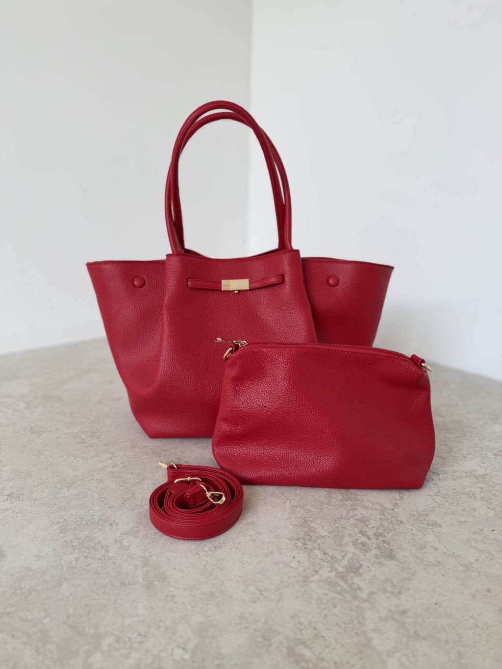 Elegantná kabelka s praktickým vnútorným priestorom, doplnená o menšiu taštičku a odnímateľný popruh na rôzne spôsoby nosenia.