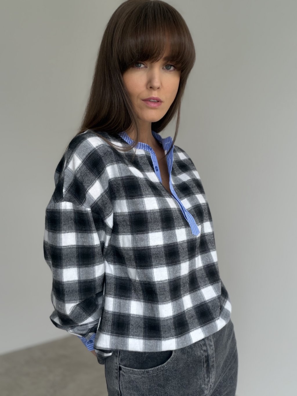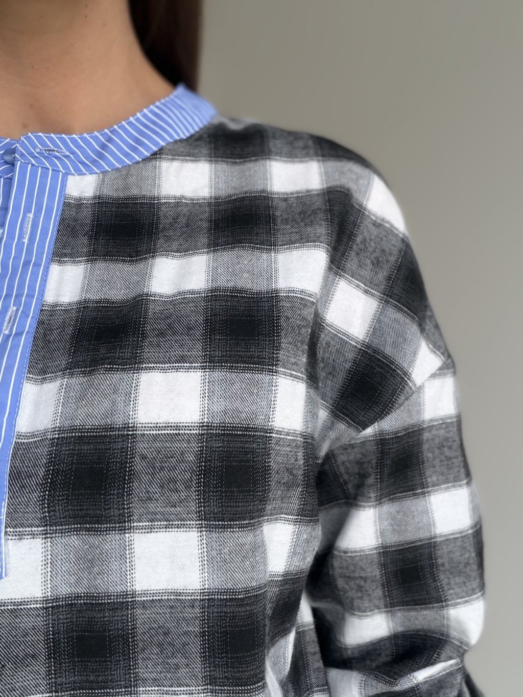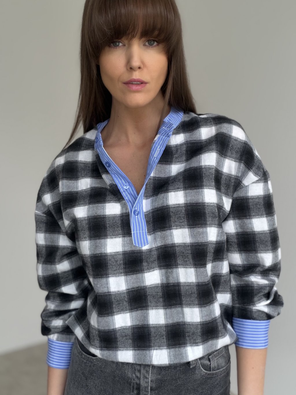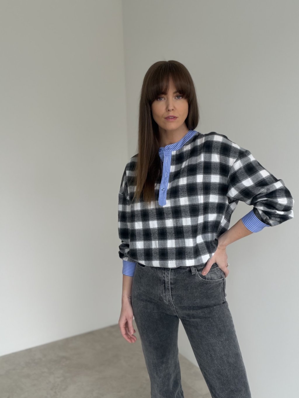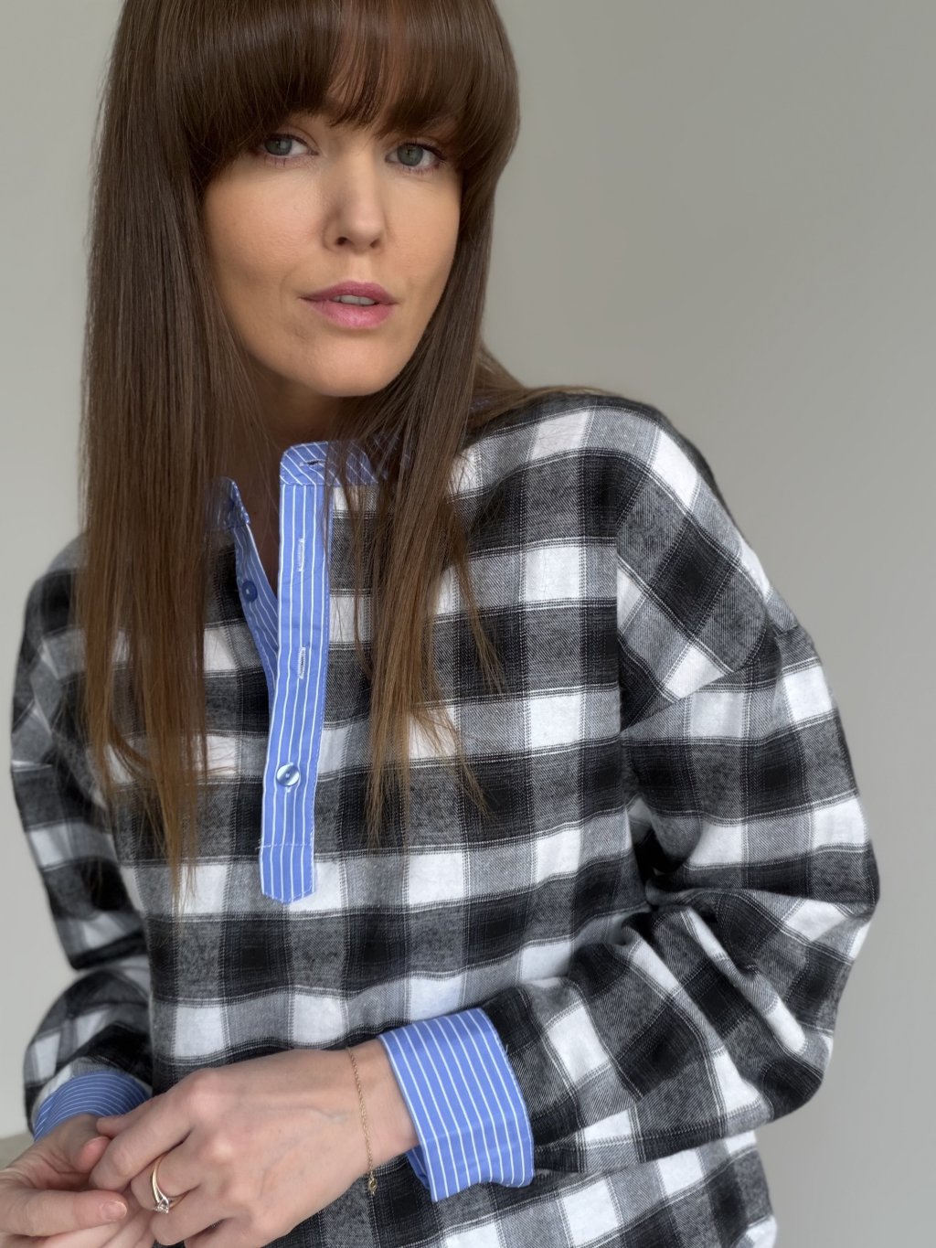 Pohodlná káro košeľa s uvoľneným strihom a kontrastnými detailmi na lége a manžetách.