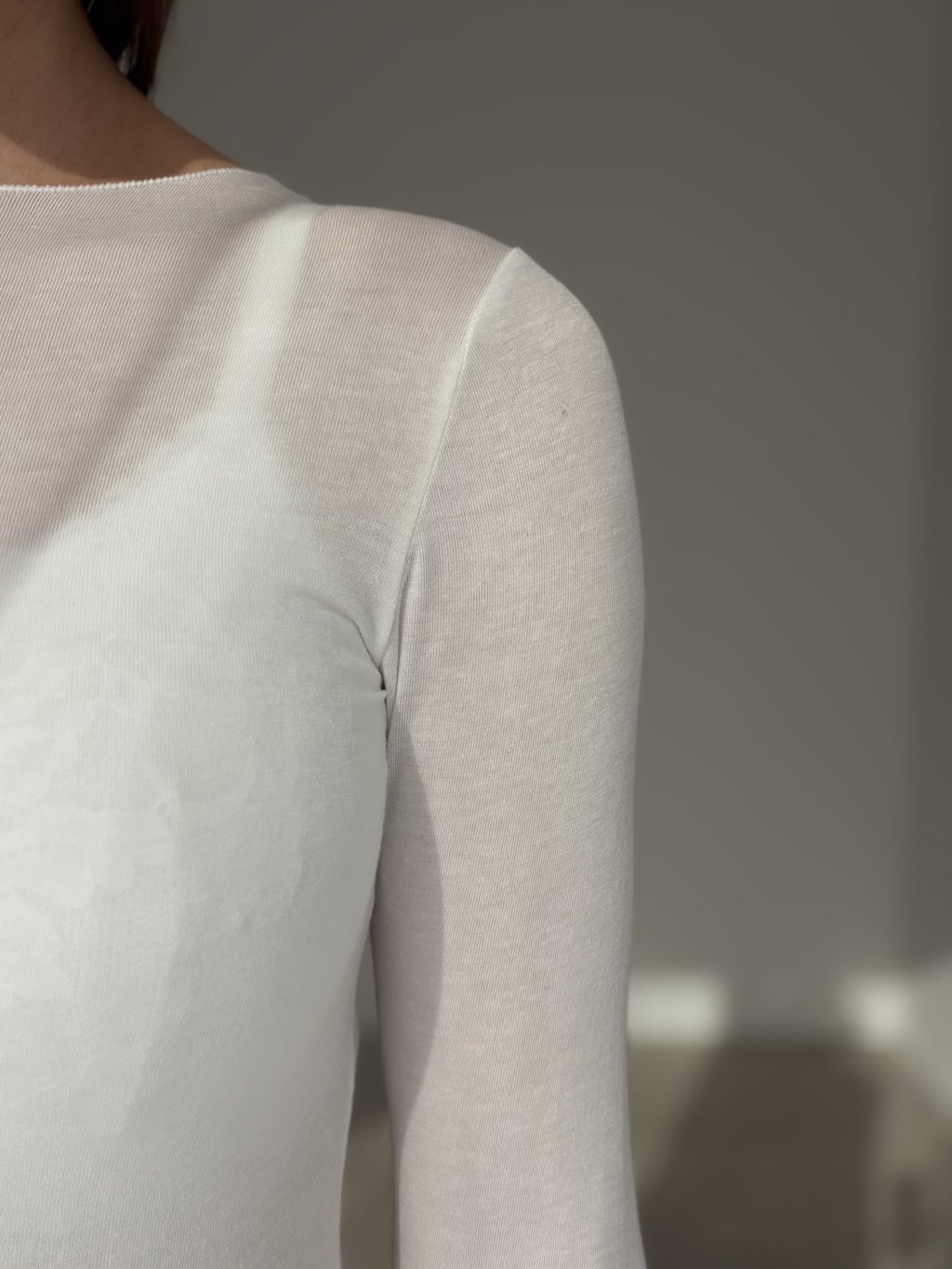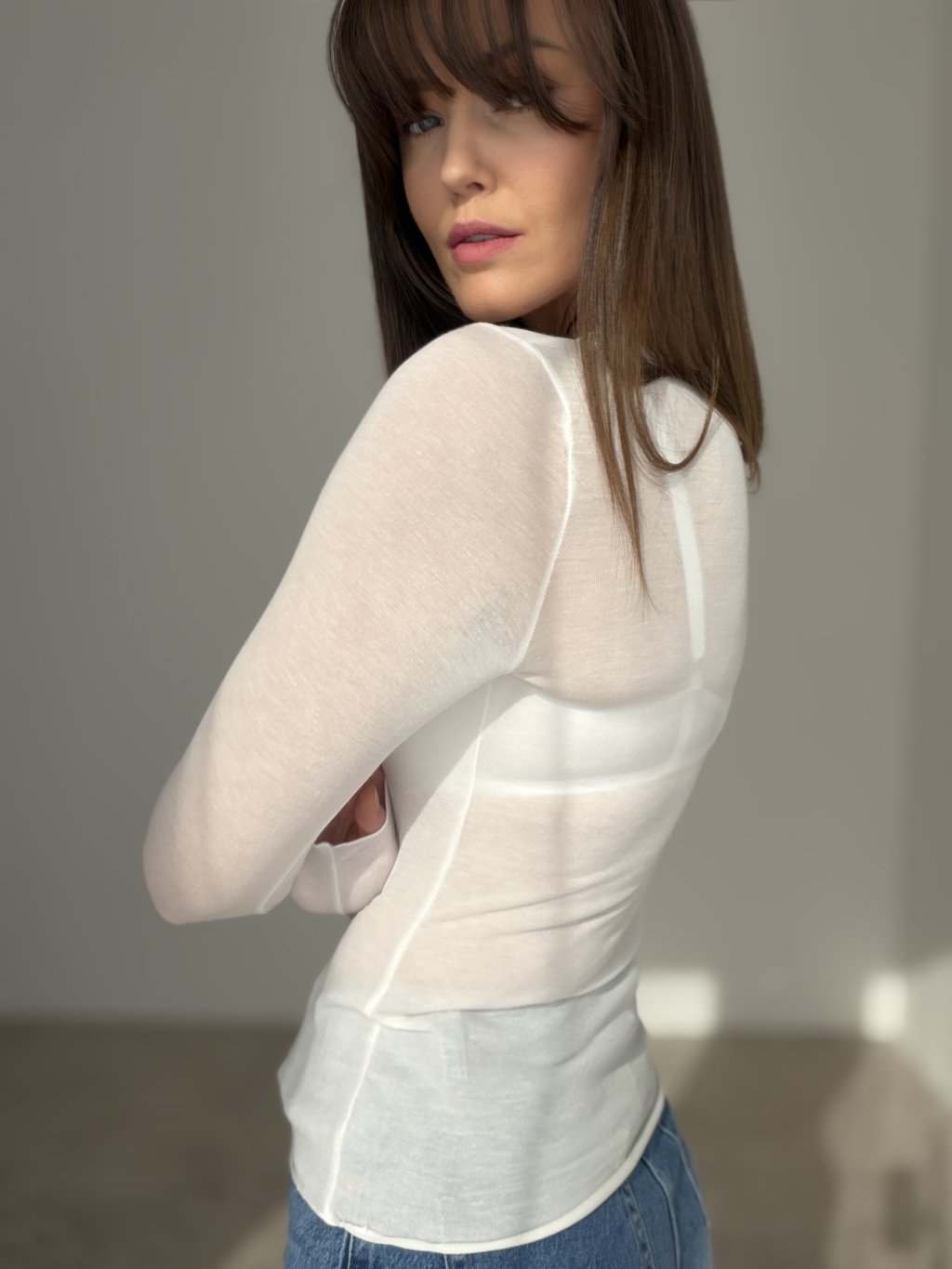 Jemný kašmírový top s dlhým rukávom a elegantným lodičkovým výstrihom. Ľahučký, hebký úplet je príjemný na pokožke, prirodzene sa prispôsobí postave a krásne sa vrství pod sako či kardigán. Minimalistický strih pôsobí čisto a nadčasovo – hodí sa k sukniam aj nohaviciam, na bežné dni aj formálnejšie príležitosti.