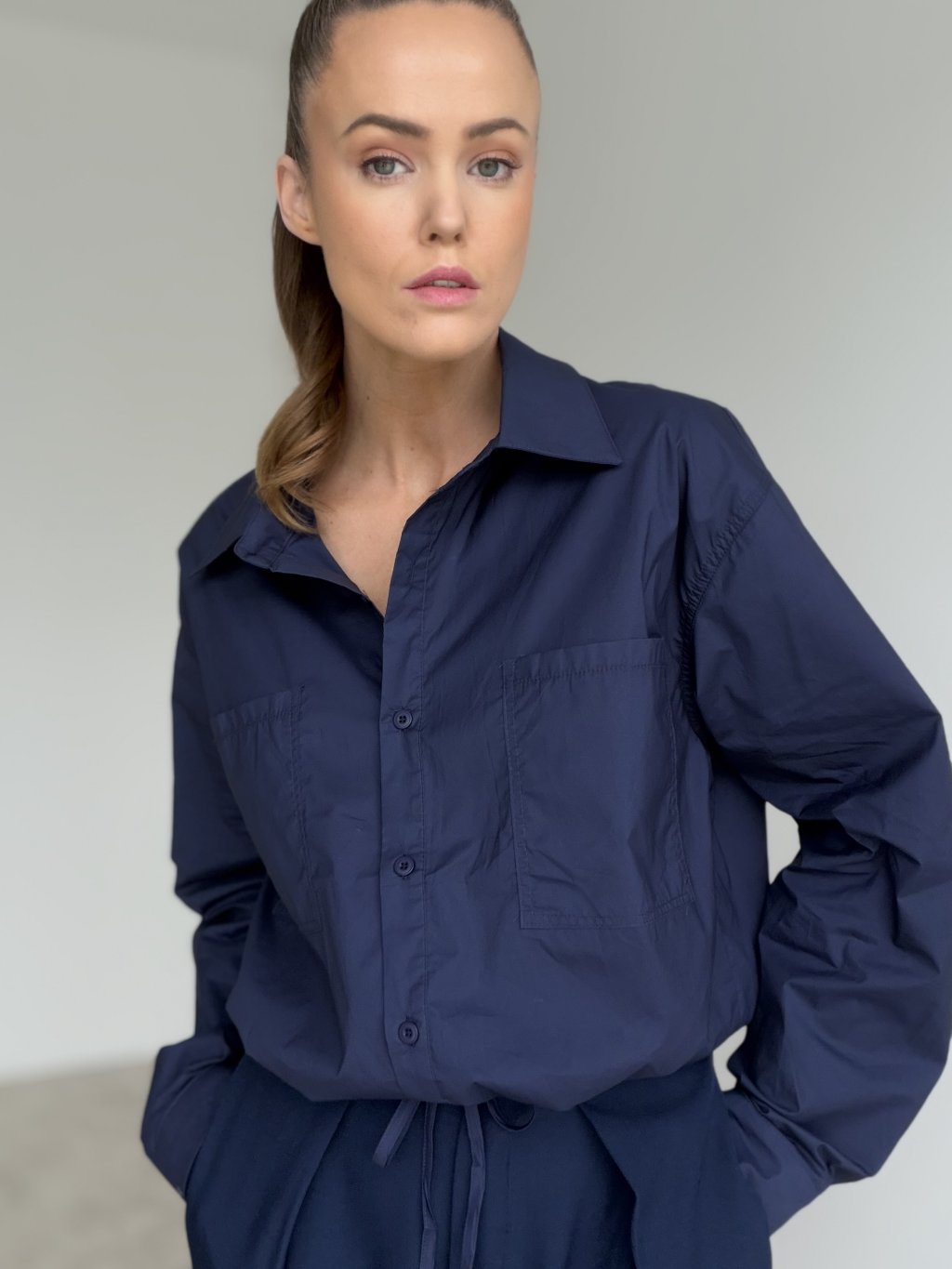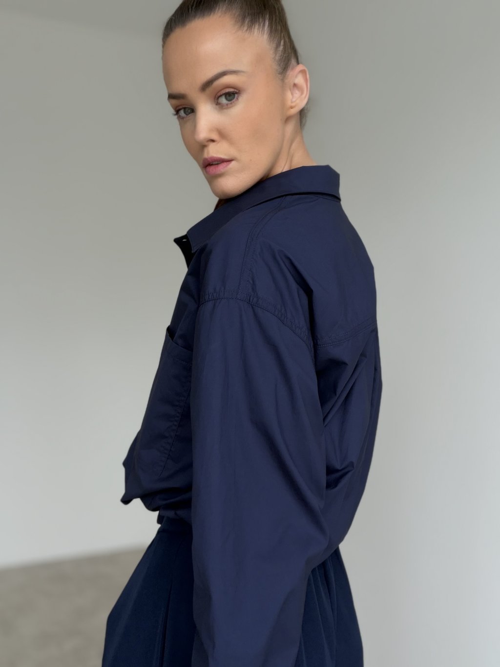 Ležérna a zároveň štýlová bavlnená košeľa s detailom na viazanie v páse, ktorý umožňuje prispôsobiť si strih podľa postavy. Dvojité náprsné vrecká a jemne nariasené rukávy dodávajú modelu nenútenú eleganciu. Ideálna voľba na každodenné nosenie – či už do mesta, na prechádzku alebo k ležérnemu outfitu.