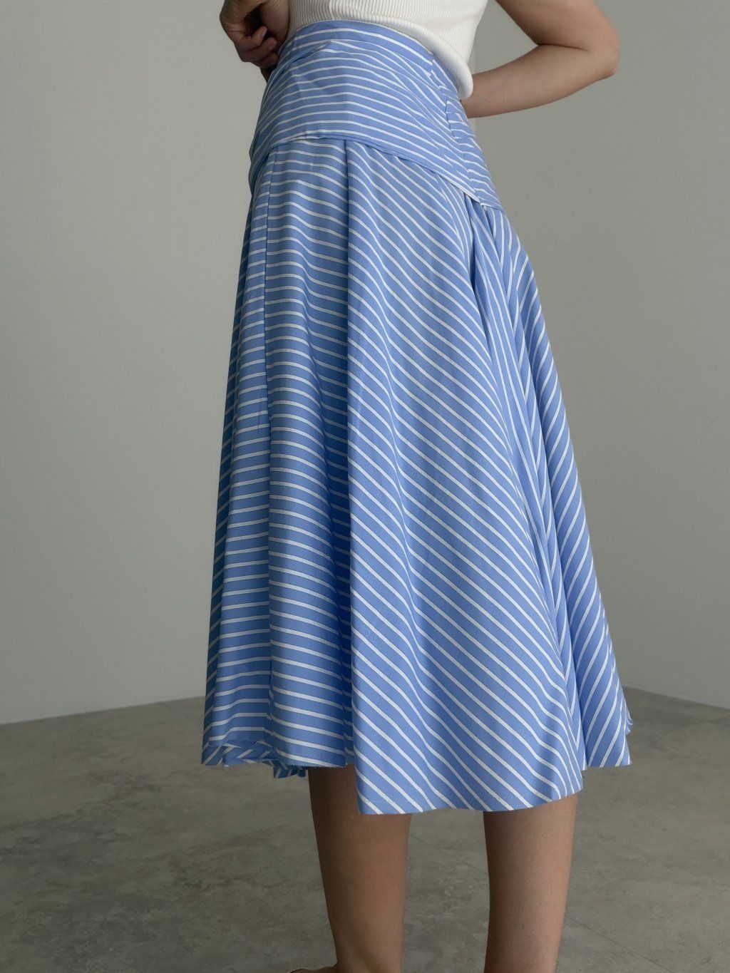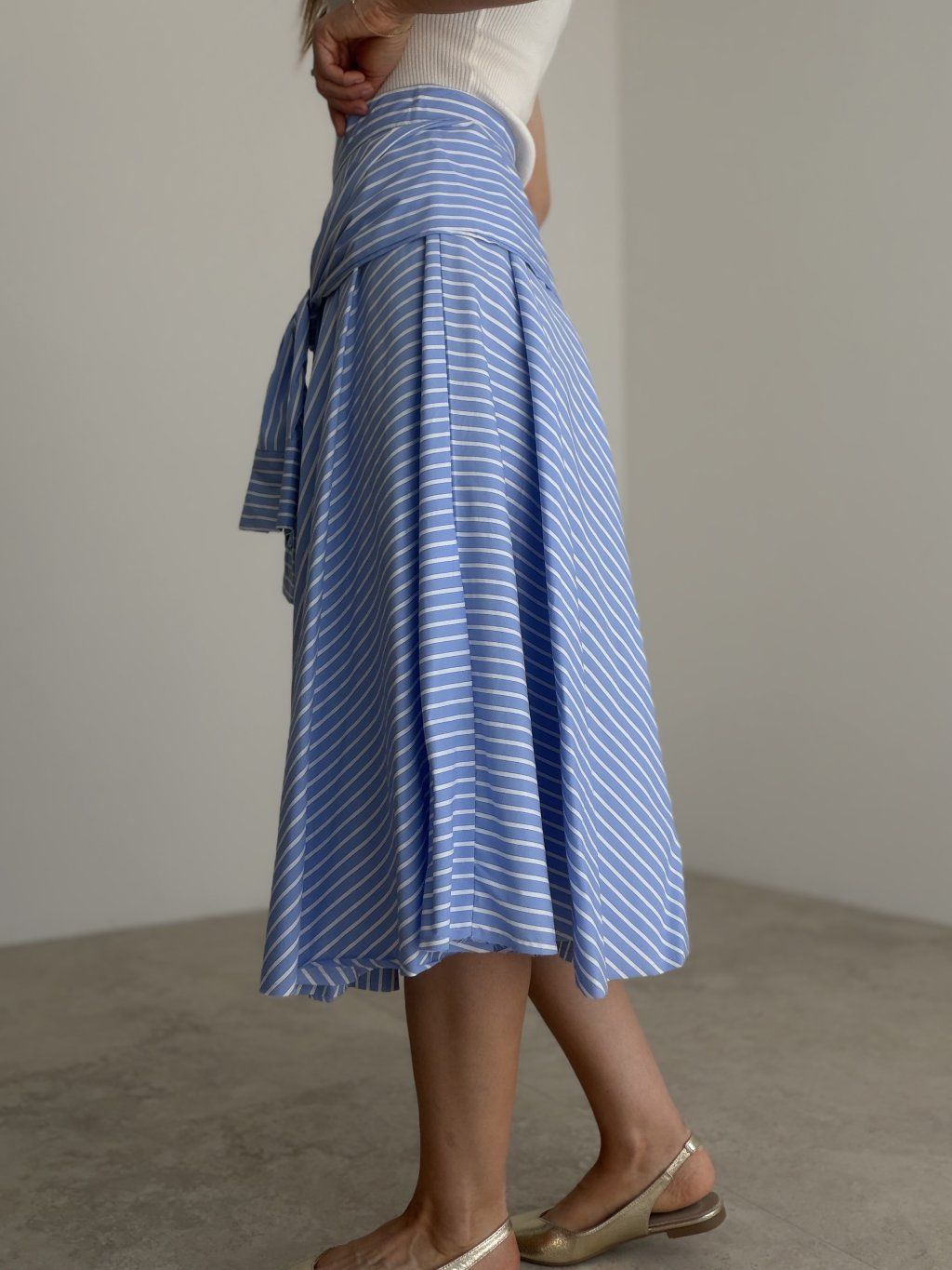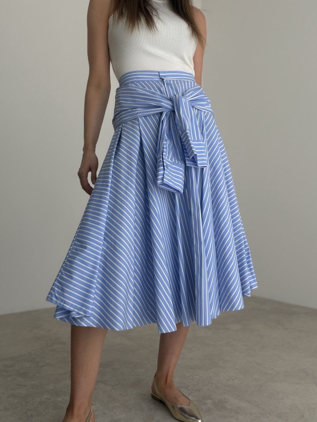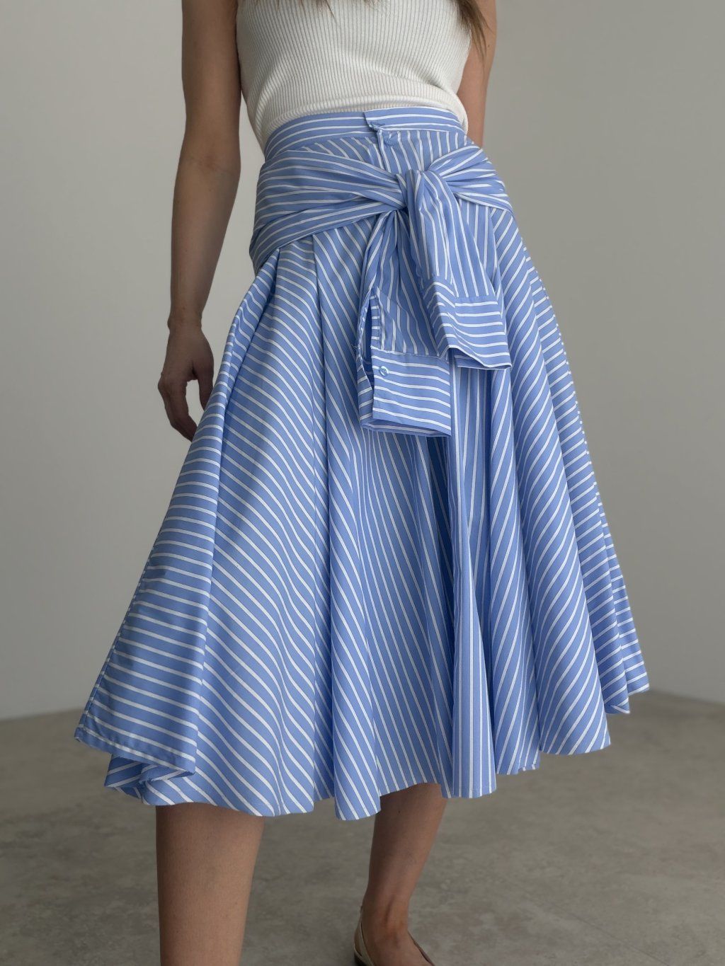 Košeľová sukňa s prúžkovaným vzorom a efektom zaviazanej košele v páse. Rozšírený midi strih pôsobí žensky, pohodlne a štýlovo.