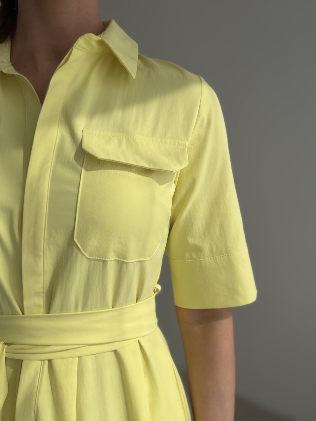 Elegantné košeľové šaty s golierom, viazaním v páse a nadčasovým strihom, ktorý pôsobí žensky a upravene. Univerzálny kúsok vhodný na bežné dni aj elegantnejšie príležitosti.