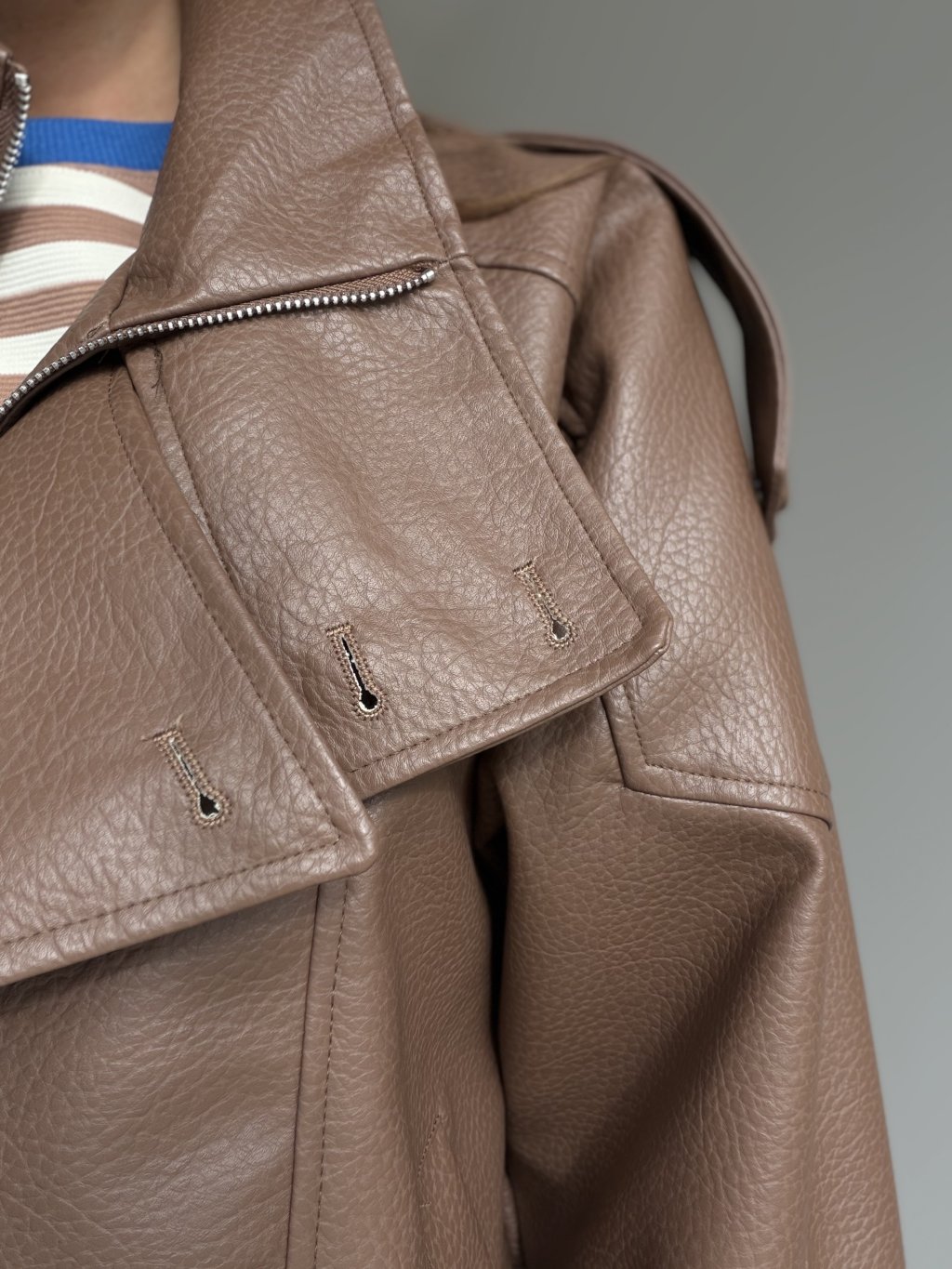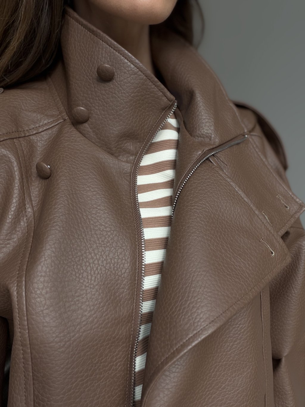 Koženková bunda s oversized strihom, vyšším golierom a zipsovým zapínaním. Voľné ramená, výrazné prešitie a pružné zakončenie v páse vytvárajú moderný, pohodlný look.