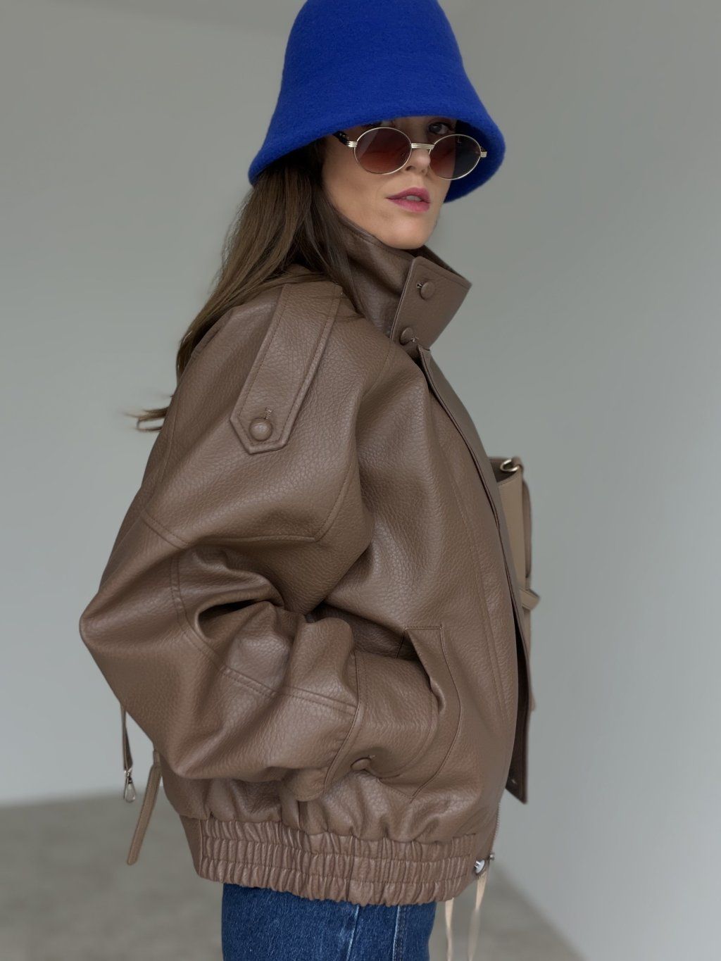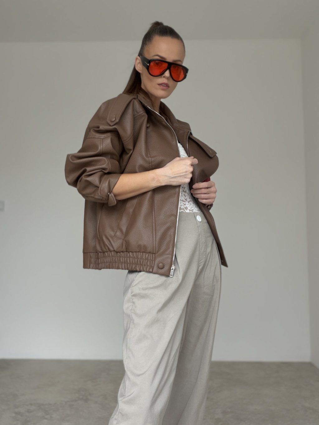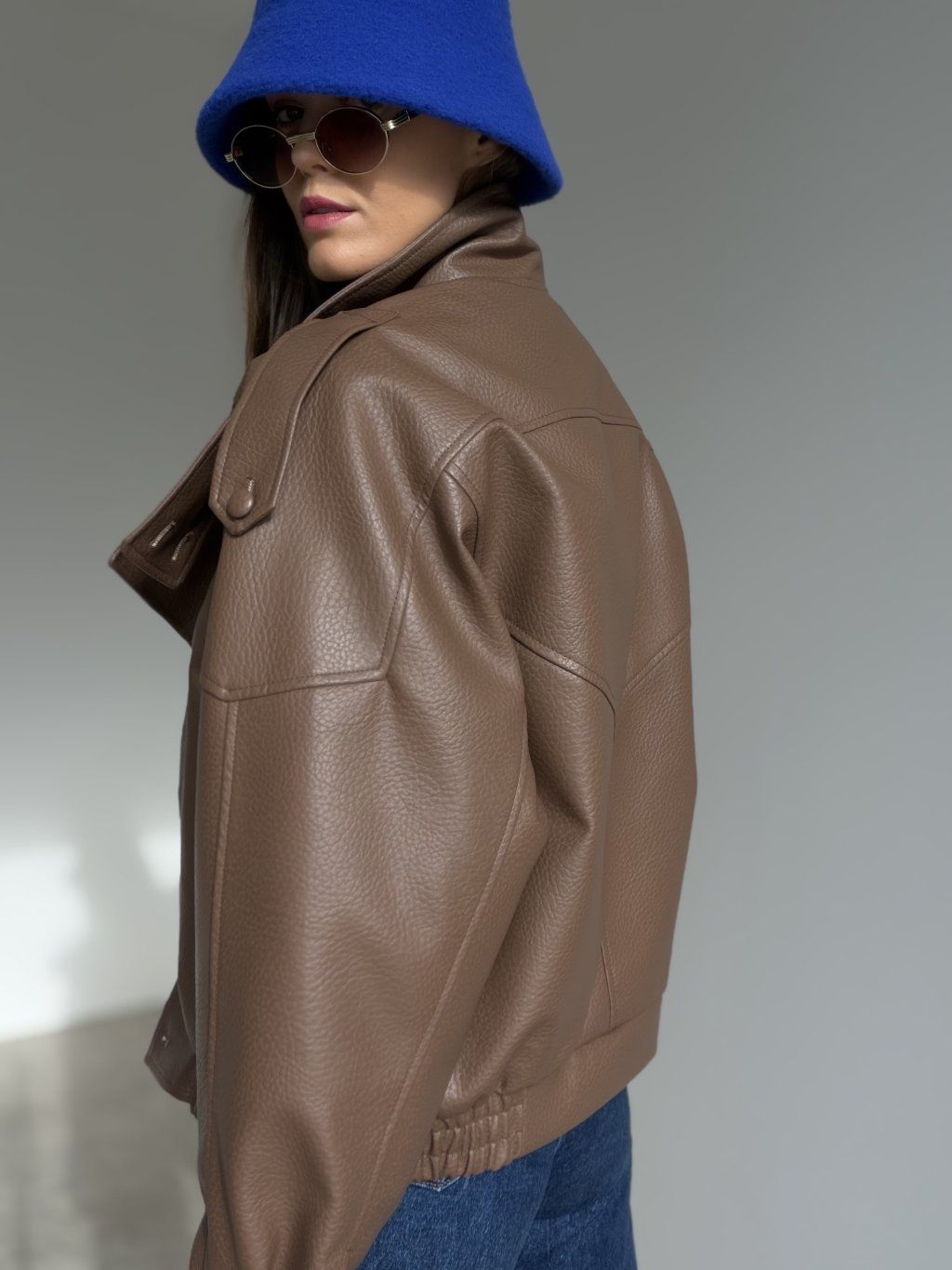 Koženková bunda s oversized strihom, vyšším golierom a zipsovým zapínaním. Voľné ramená, výrazné prešitie a pružné zakončenie v páse vytvárajú moderný, pohodlný look.