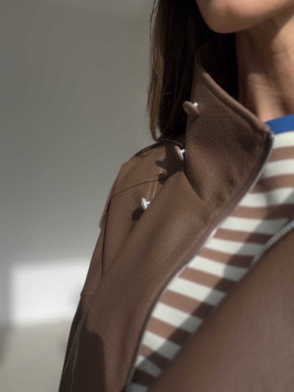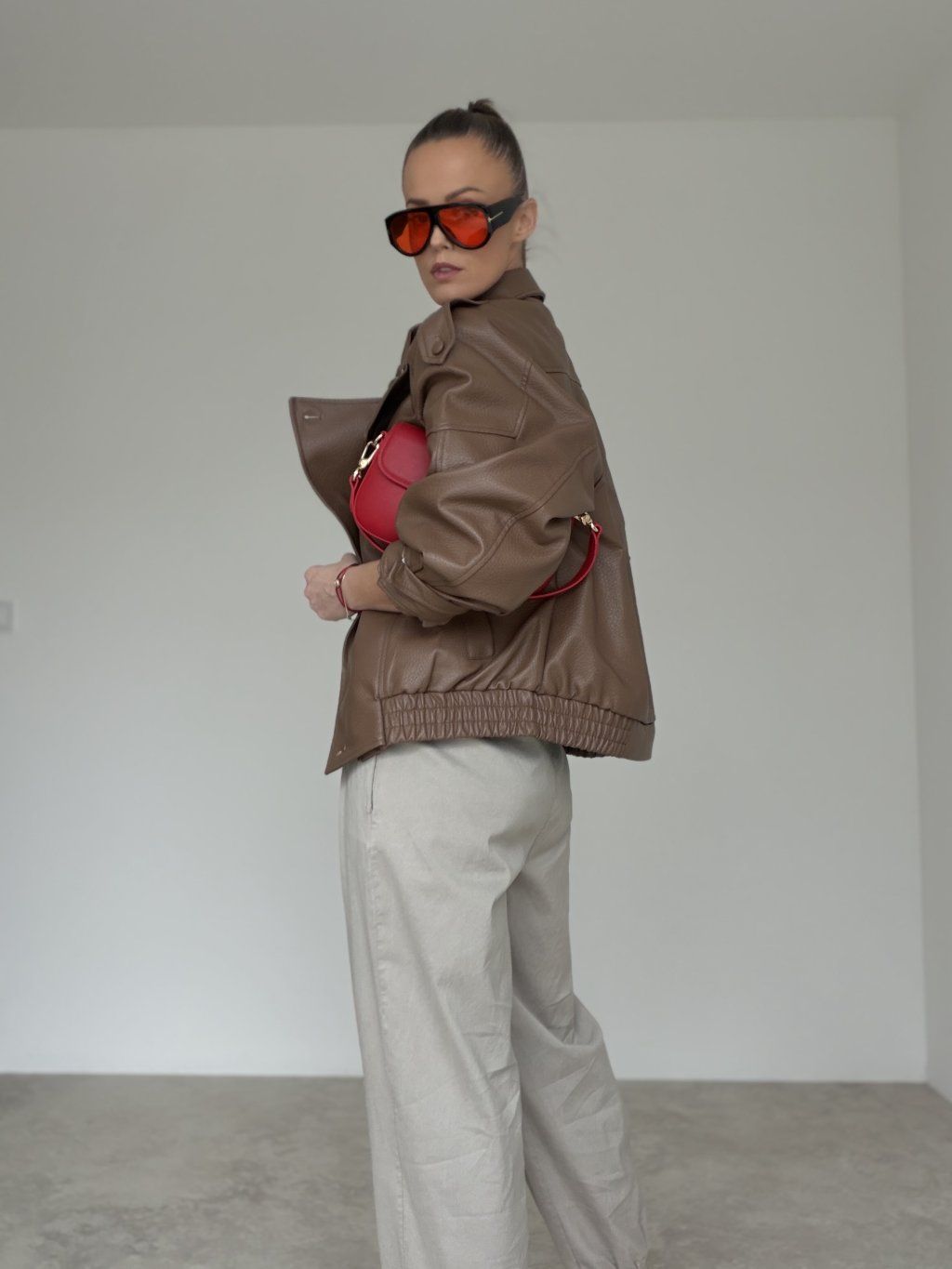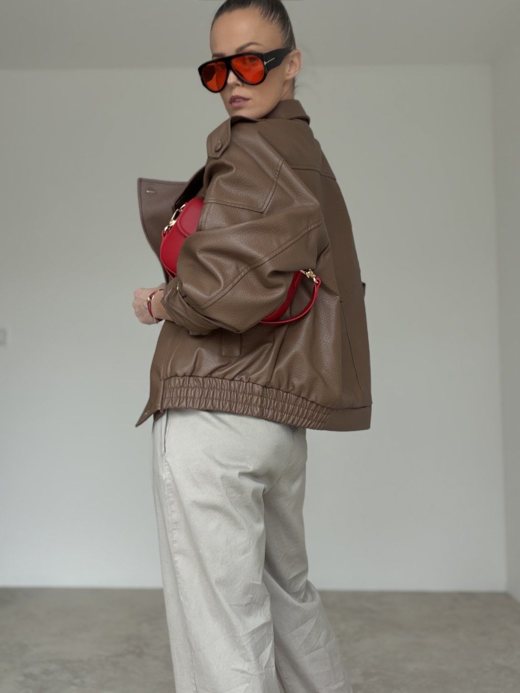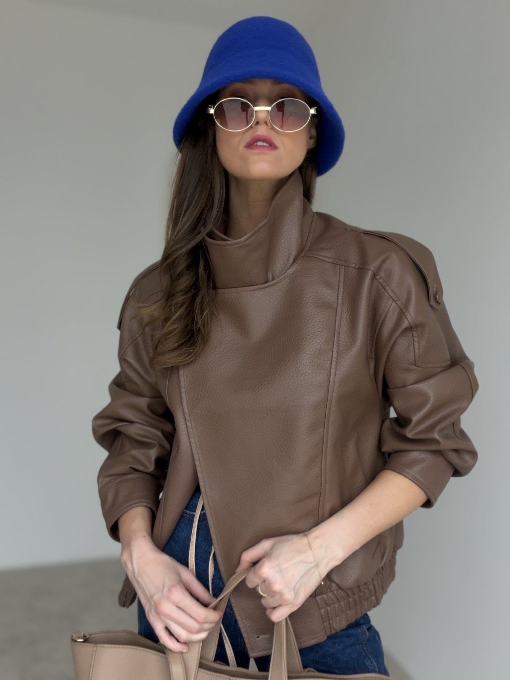 Koženková bunda s oversized strihom, vyšším golierom a zipsovým zapínaním. Voľné ramená, výrazné prešitie a pružné zakončenie v páse vytvárajú moderný, pohodlný look.