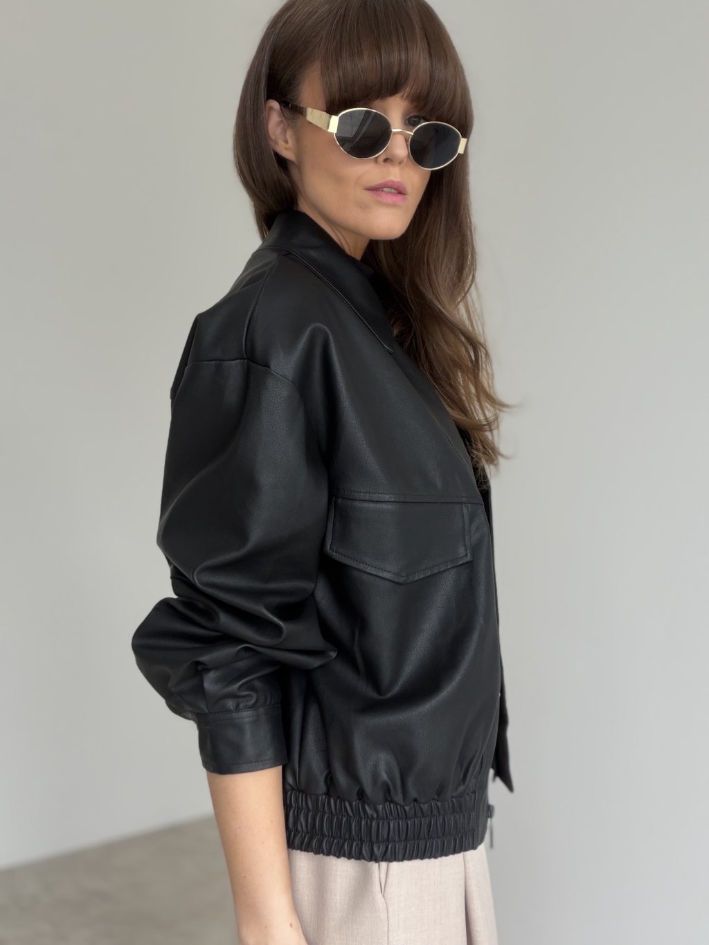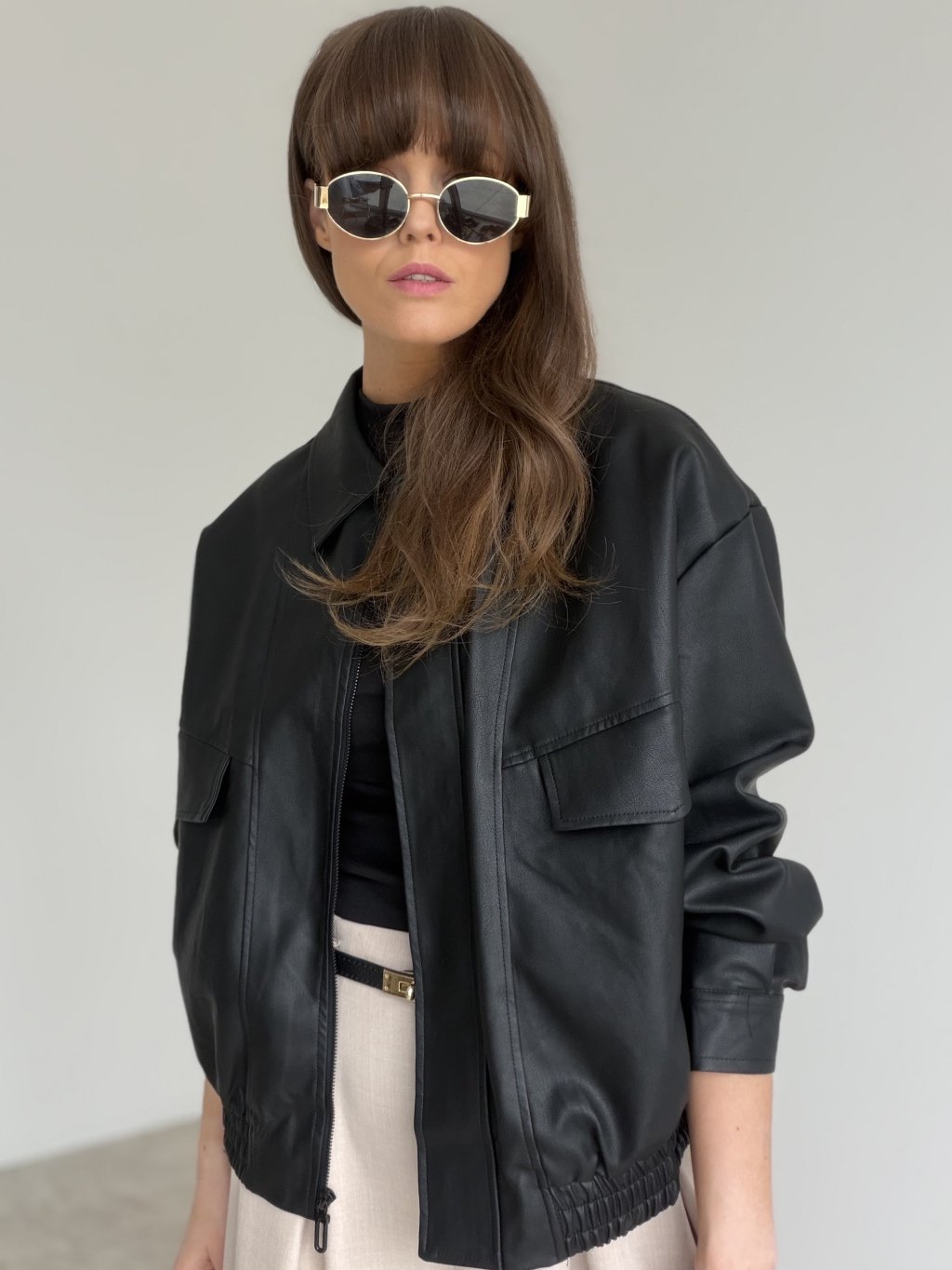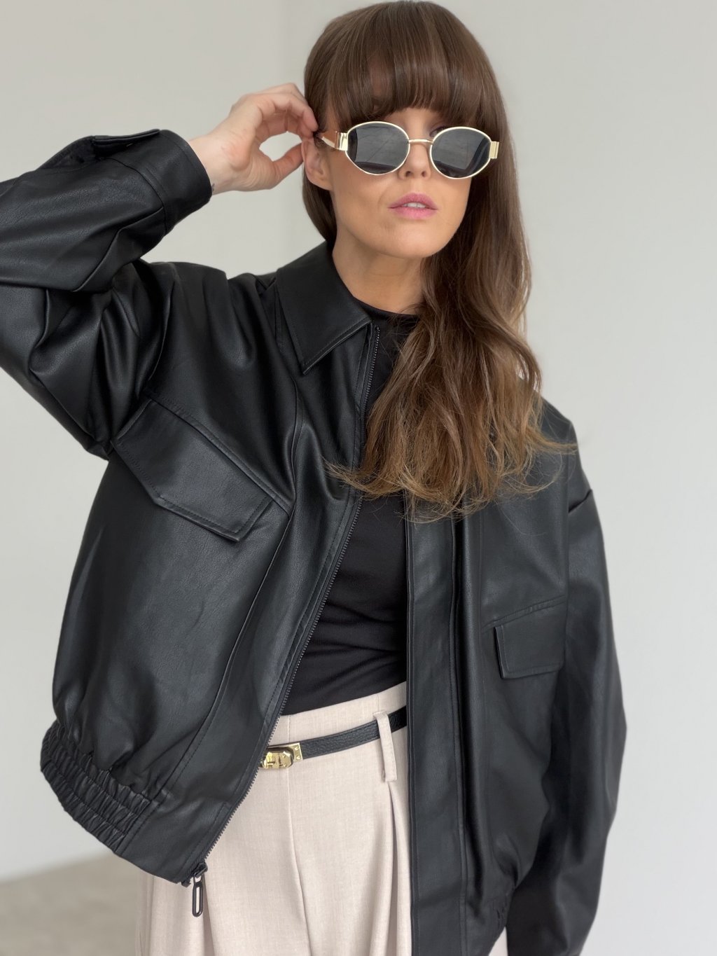 Štýlová bunda z koženkového materiálu v modernom, mierne voľnejšom strihu, ktorá okamžite dodá outfitu výraz a šmrnc. Má čisté línie, výrazný golier a zapínanie na zips, vďaka čomu pôsobí upravene, no stále ležérne. Praktické vrecká na hrudi a pohodlné rukávy vytvárajú nadčasový „street“ efekt, ktorý sa výborne kombinuje s nohavicami, sukňou aj šatami. Spodný lem je riešený pružným zakončením, takže bunda pekne drží tvar a zároveň je komfortná na nosenie počas celého dňa.