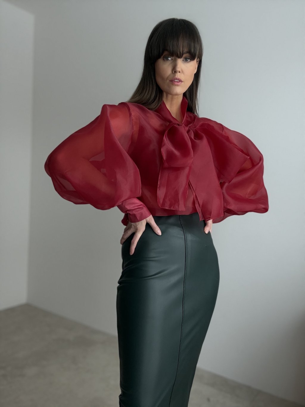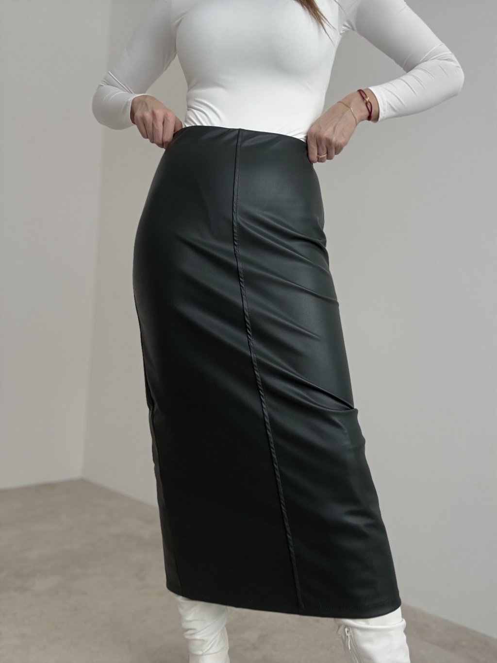 Koženková sukňa v midi dĺžke so ženským, elegantným strihom, ktorý krásne zvýrazní postavu. Jemne elastický materiál pôsobí uhladene a pohodlne, zatiaľ čo vyšší pás formuje siluetu a dodáva sukni moderný vzhľad. Zadný rozparok zaručuje komfort pri chôdzi a vytvára štíhlu líniu tela. Sukňa sa výborne kombinuje s blúzkami, rolákmi či topmi, vďaka čomu je ideálnou voľbou na pracovné aj spoločenské stylingy.