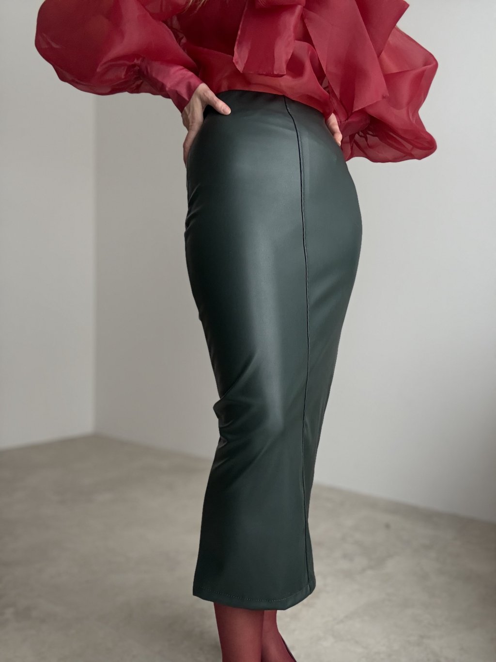 Elegantná midi sukňa z koženkového materiálu s vyšším pásom a zadným rozparkom pre pohodlné nosenie.