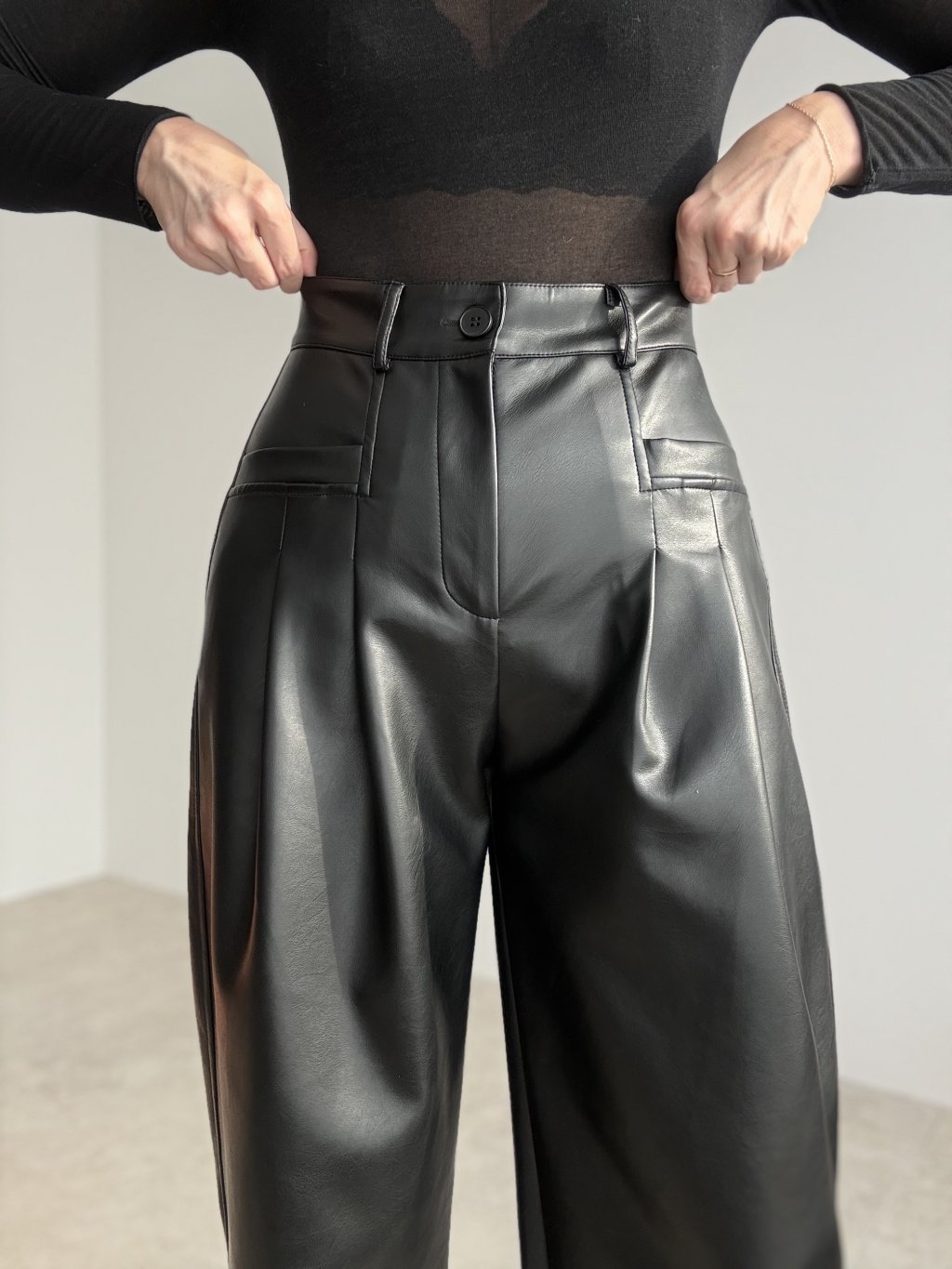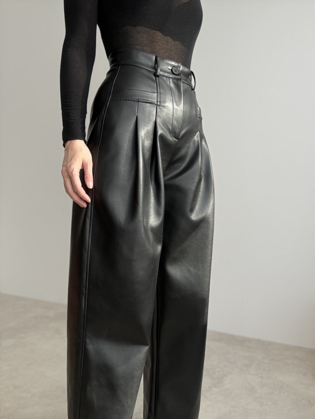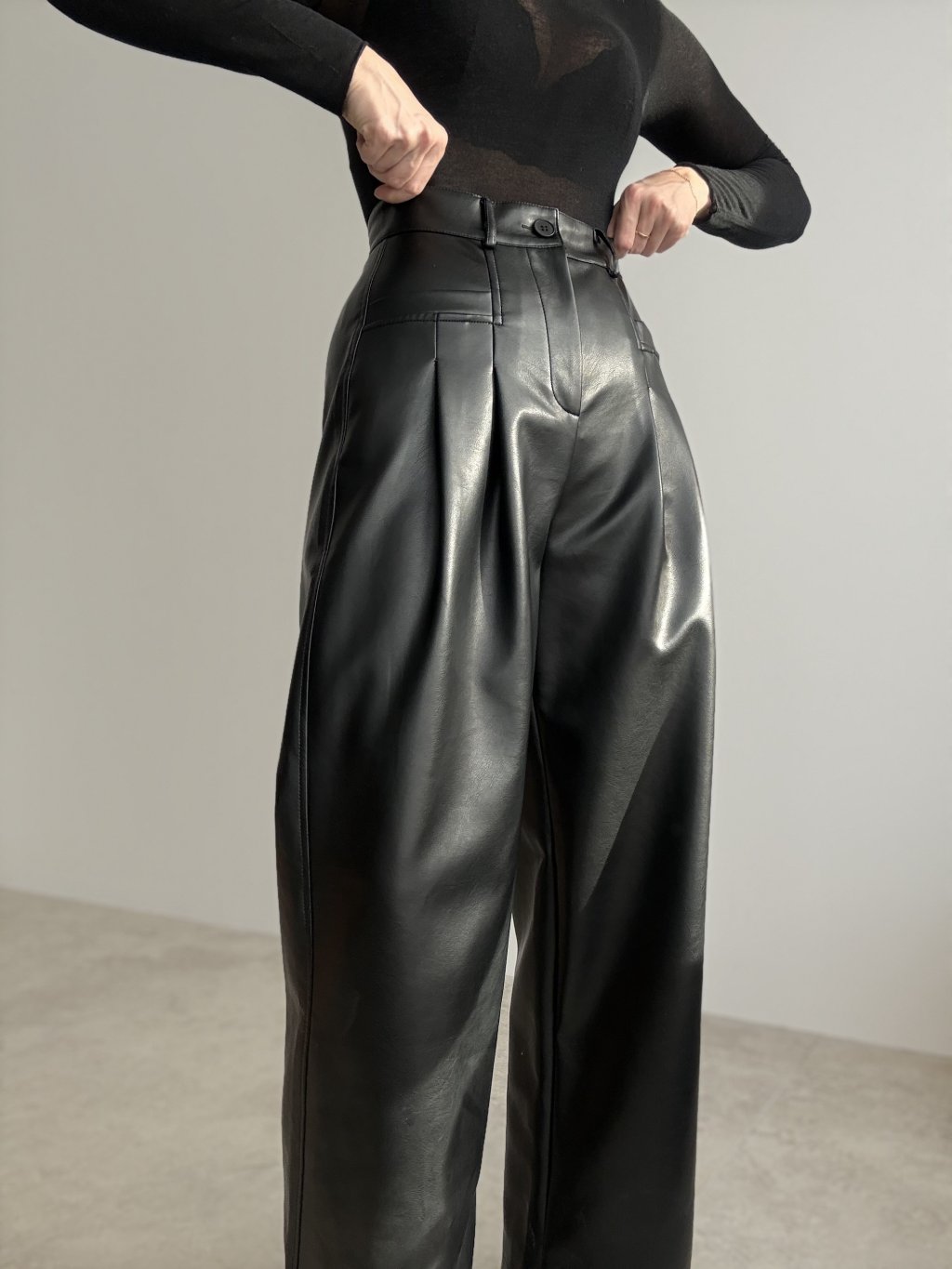 Koženkové nohavice s vyšším pásom, ktoré okamžite dodajú outfitu moderný a sebavedomý charakter. Majú rovný až mierne rozšírený wide strih, ktorý voľne padá pozdĺž nôh a pôsobí veľmi žensky a zároveň pohodlne. V páse sú doplnené pútkami na opasok, zapínaním na zips a gombík a minimalistickými vreckami, vďaka čomu pekne formujú siluetu a zvýraznia pás. Jemne lesklý povrch vytvára efekt luxusného materiálu, no nohavice zostávajú príjemné na nosenie. Skvele sa hodia k body, priliehavým topom, oversize košeliam aj k saku – využiješ ich na večer do mesta, na oslavy, ale aj na bežné nosenie, keď chceš svoj look pozdvihnúť na vyššiu úroveň.