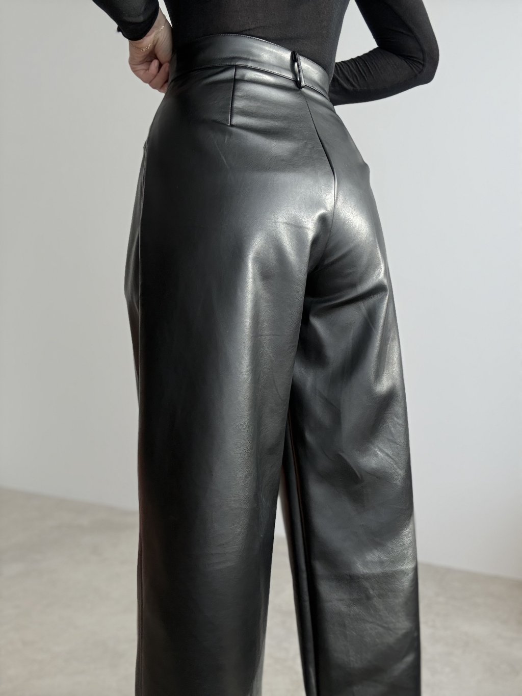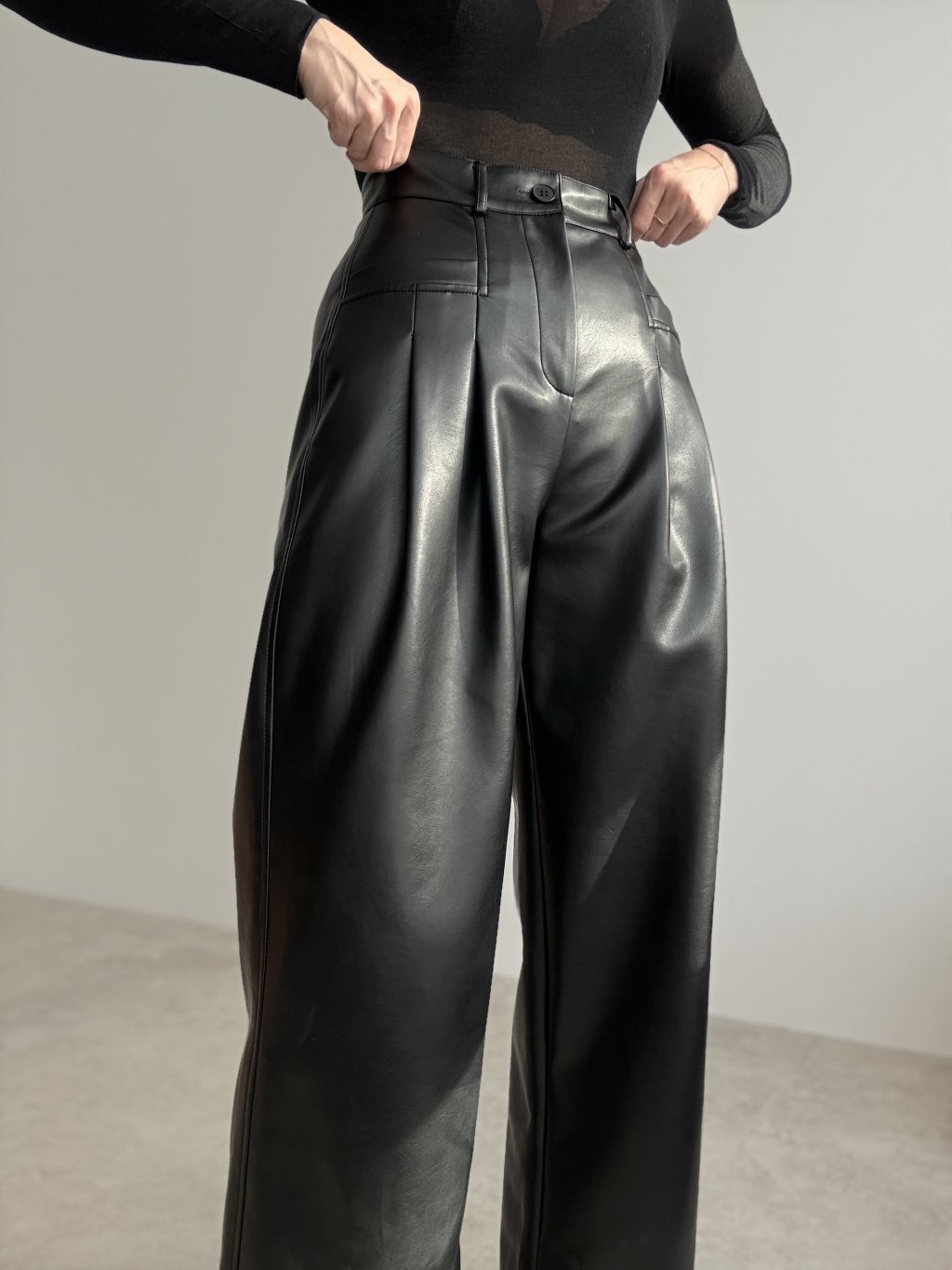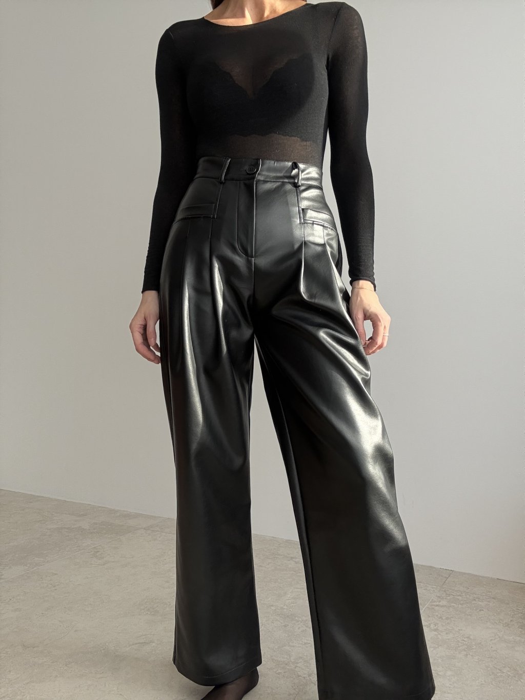 Koženkové nohavice s vyšším pásom, ktoré okamžite dodajú outfitu moderný a sebavedomý charakter. Majú rovný až mierne rozšírený wide strih, ktorý voľne padá pozdĺž nôh a pôsobí veľmi žensky a zároveň pohodlne. V páse sú doplnené pútkami na opasok, zapínaním na zips a gombík a minimalistickými vreckami, vďaka čomu pekne formujú siluetu a zvýraznia pás. Jemne lesklý povrch vytvára efekt luxusného materiálu, no nohavice zostávajú príjemné na nosenie. Skvele sa hodia k body, priliehavým topom, oversize košeliam aj k saku – využiješ ich na večer do mesta, na oslavy, ale aj na bežné nosenie, keď chceš svoj look pozdvihnúť na vyššiu úroveň.