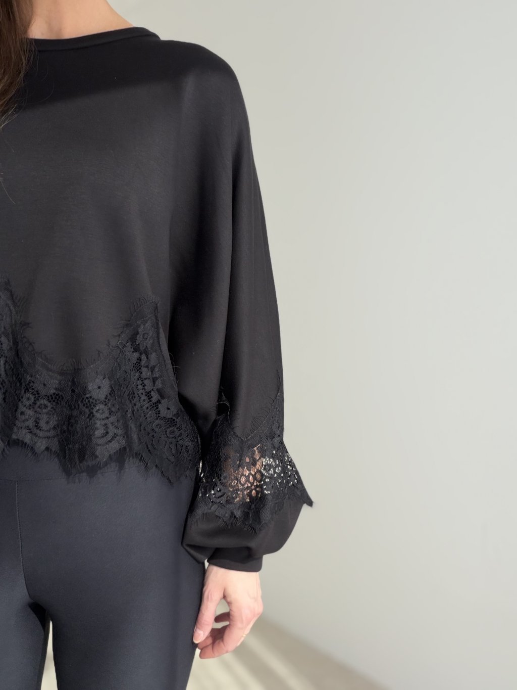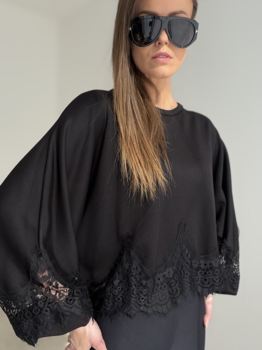 Výrazný a originálny kúsok, ktorý spája pohodlie mikiny s jemnosťou a eleganciou krajkového detailu. Voľný strih pôsobí moderne, vzdušne a zároveň veľmi žensky, vďaka čomu sa tento model stáva neprehliadnuteľnou súčasťou outfitu. Široké rukávy a splývavá silueta dodávajú celku zaujímavý módny efekt, zatiaľ čo krajkové zakončenie prináša jemný, sofistikovaný akcent. Tento model sa skvelo hodí k priliehavým nohaviciam, legínam aj elegantnejším kúskom a jednoducho vytvorí outfit, ktorý pôsobí štýlovo a výnimočne. Materiál je príjemný na nosenie a ideálny pre ženy, ktoré chcú spojiť pohodlie s výrazným ženským detailom.