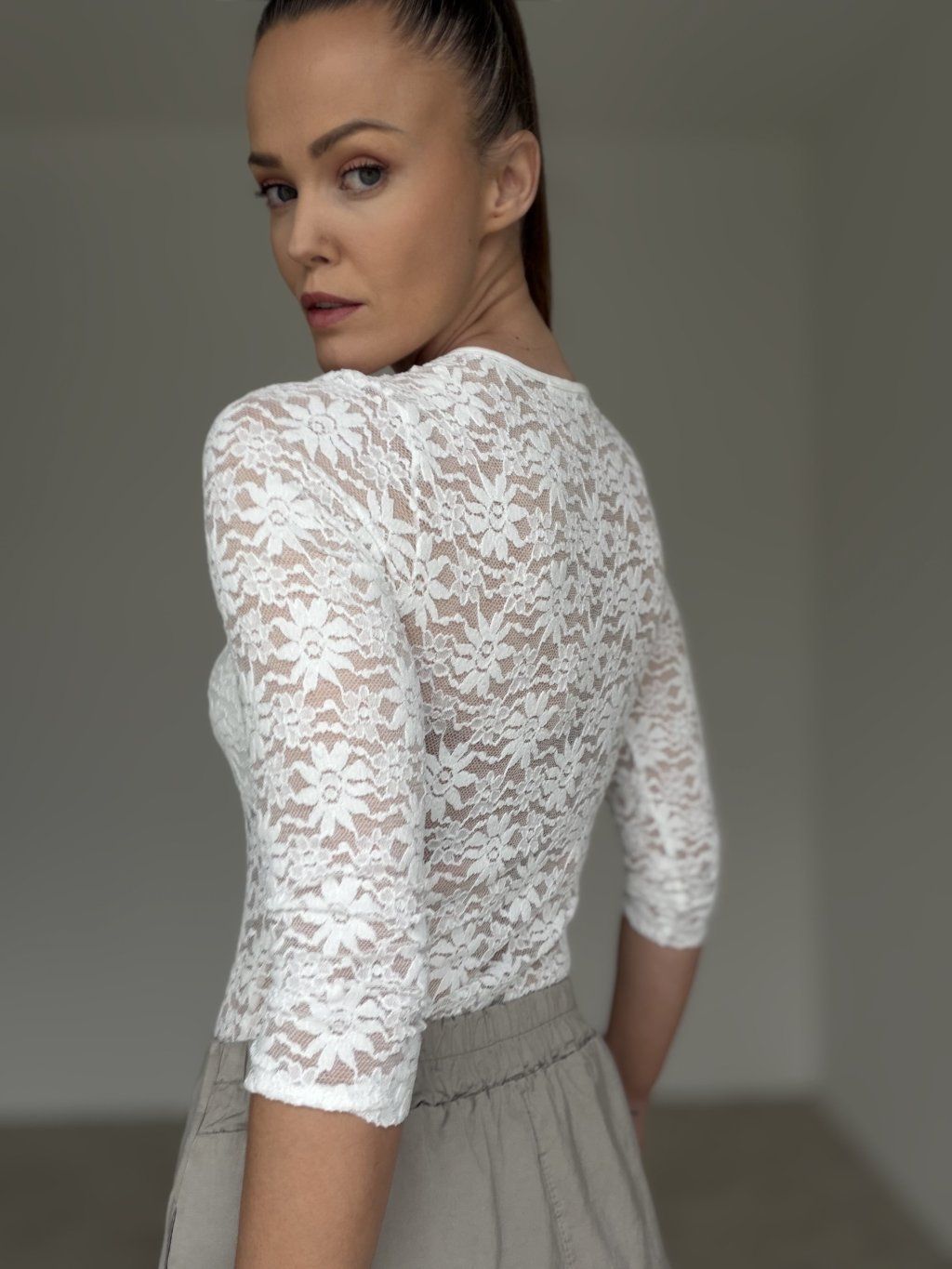 Krajkové body s priliehavým strihom a podšitou časťou v oblasti hrudníka. Elegantné, ženské a ideálne k vysokému pásu aj pod sako.