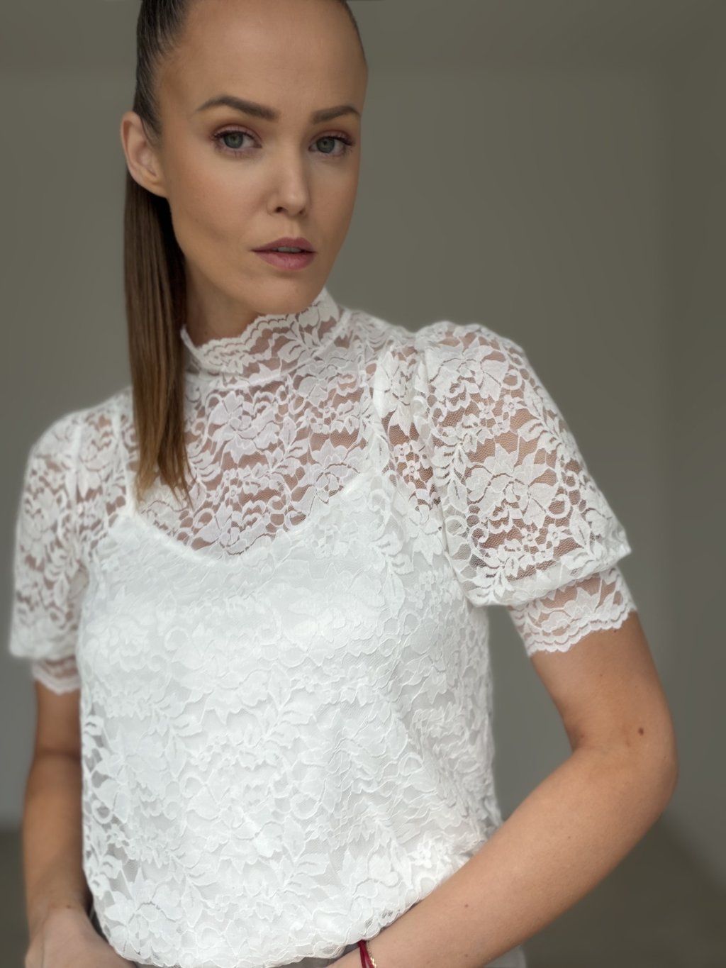 Elegantný krajkový top s vyšším golierom a krátkymi rukávmi pôsobí žensky, jemne a veľmi štýlovo. Je ideálny na vytvorenie romantického aj elegantného outfitu na rôzne príležitosti.