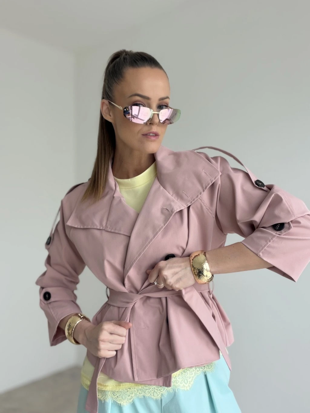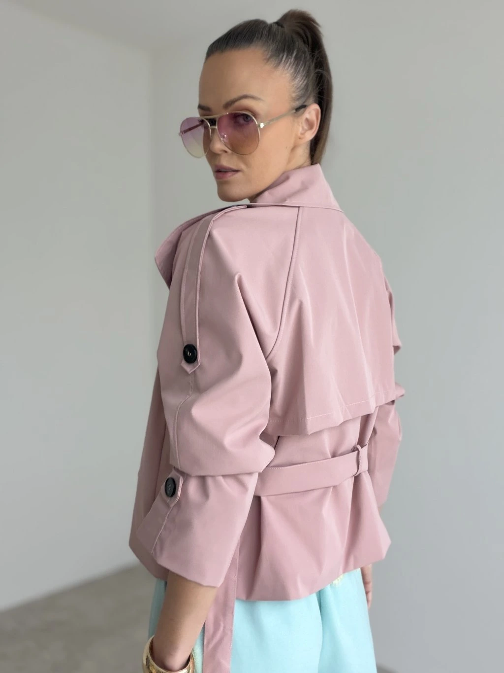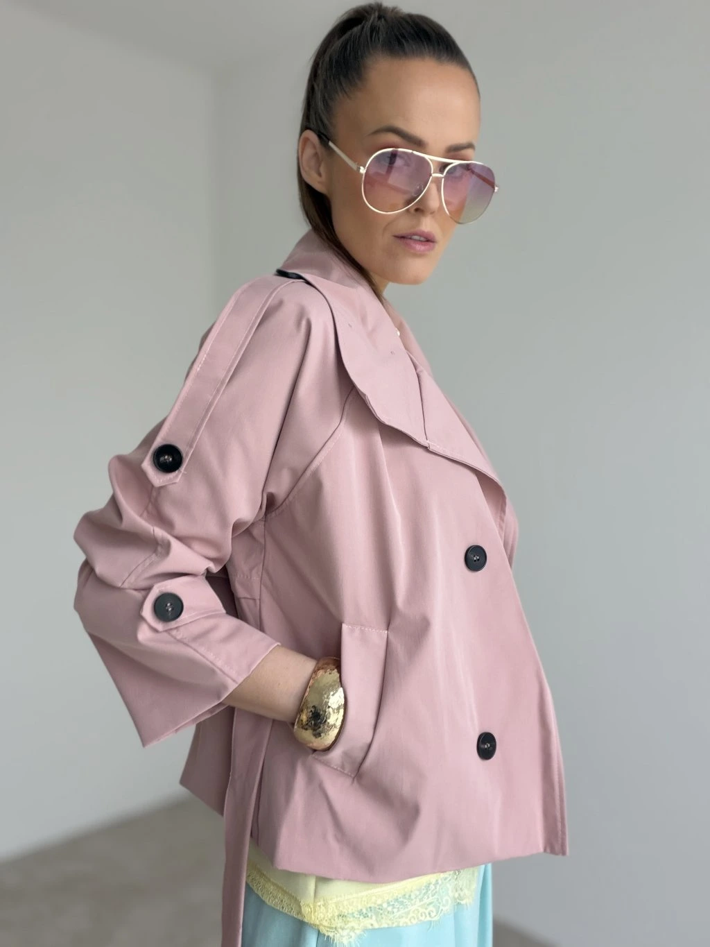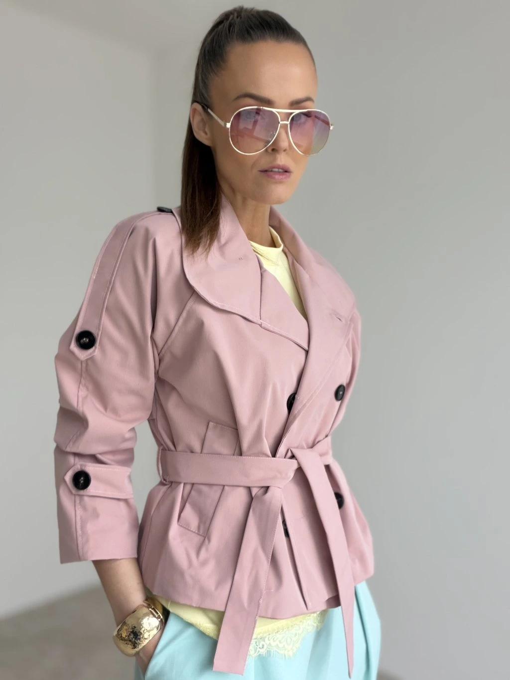 Elegantný krátky trenčkot v modernom prevedení, ktorý vytvorí upravený look bez námahy. Strih je kratší a veľmi lichotivý, krásne zvýrazní pás vďaka viazaniu a zároveň nechá vyniknúť nohavice či sukňu. Dvojradové zapínanie, výrazný golier a premyslené detaily na rukávoch dodávajú celku nadčasový charakter. Materiál pôsobí pevnejšie, no stále pohodlne, takže trenčkot drží tvar a vyzerá elegantne aj pri bežnom nosení. Skvelo sa kombinuje do mesta, do práce aj na večerné stretnutie – stačí zmeniť doplnky.