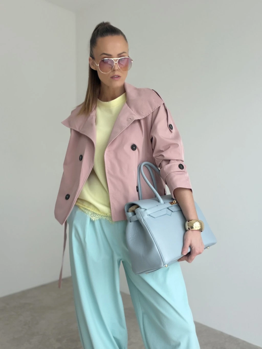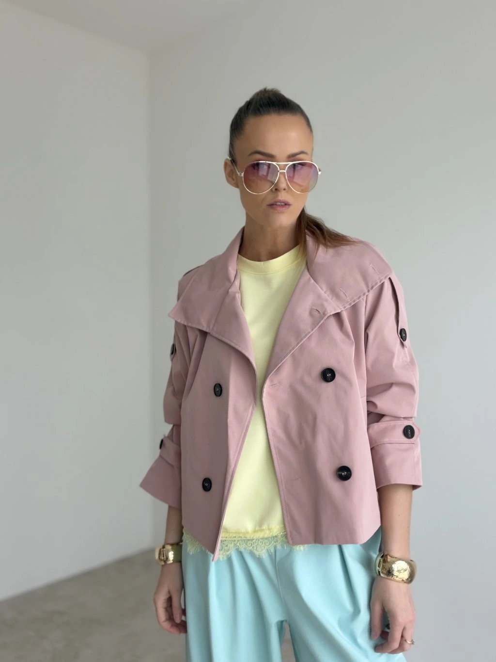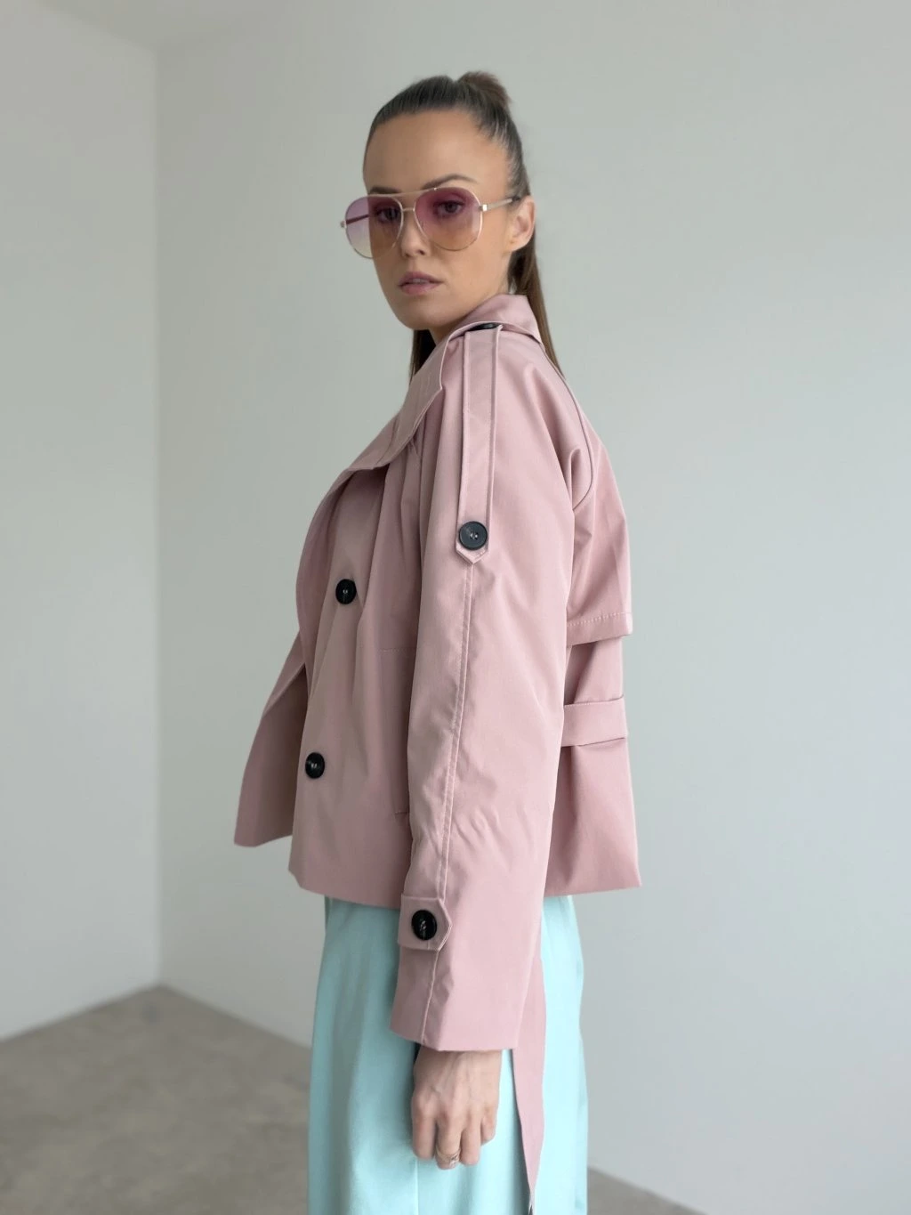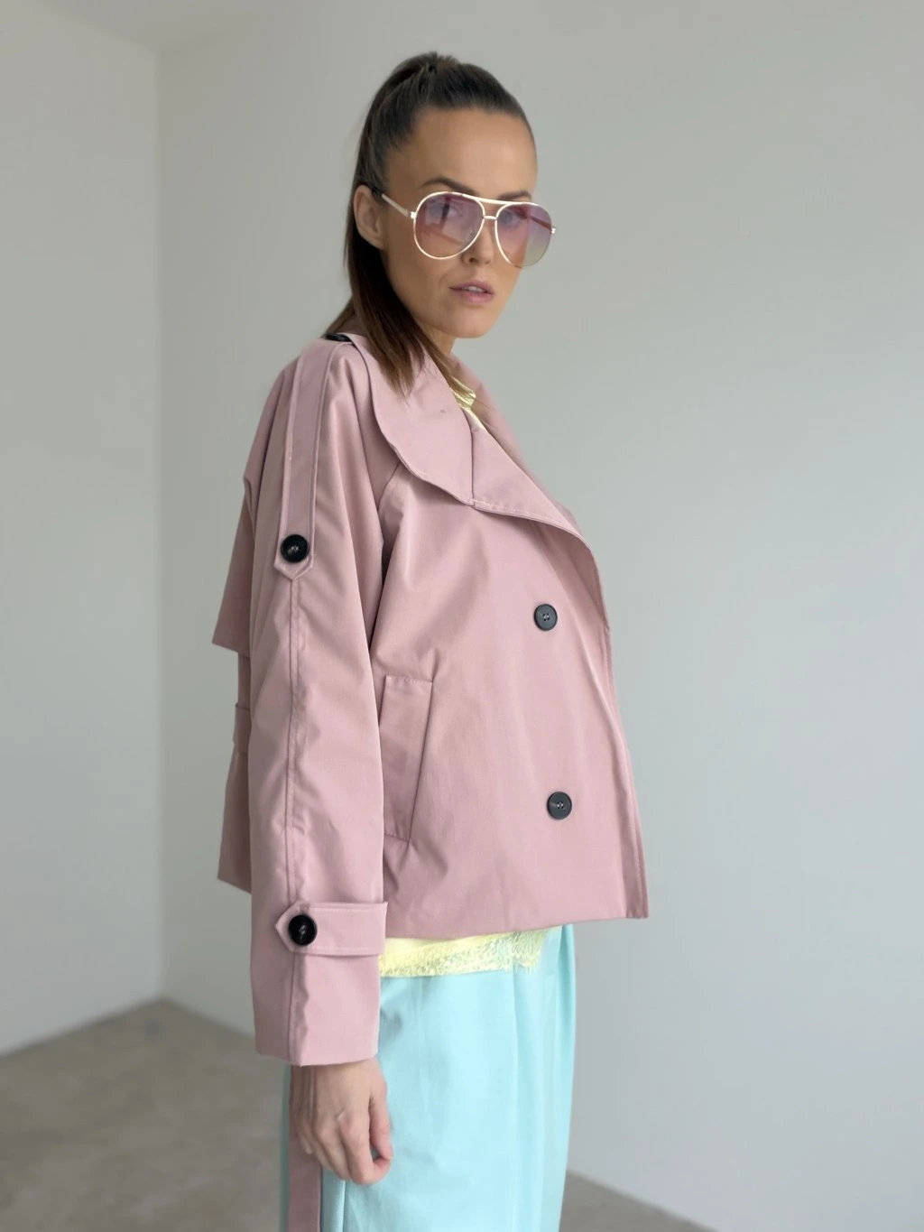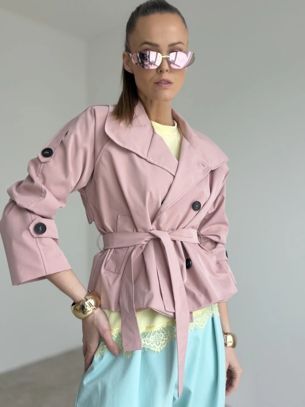 Elegantný krátky trenčkot v modernom prevedení, ktorý vytvorí upravený look bez námahy. Strih je kratší a veľmi lichotivý, krásne zvýrazní pás vďaka viazaniu a zároveň nechá vyniknúť nohavice či sukňu. Dvojradové zapínanie, výrazný golier a premyslené detaily na rukávoch dodávajú celku nadčasový charakter. Materiál pôsobí pevnejšie, no stále pohodlne, takže trenčkot drží tvar a vyzerá elegantne aj pri bežnom nosení. Skvelo sa kombinuje do mesta, do práce aj na večerné stretnutie – stačí zmeniť doplnky.