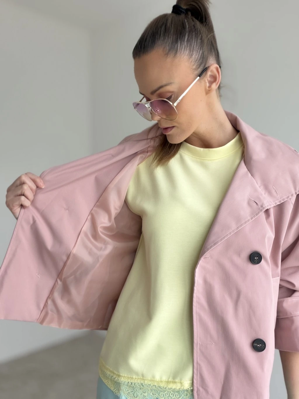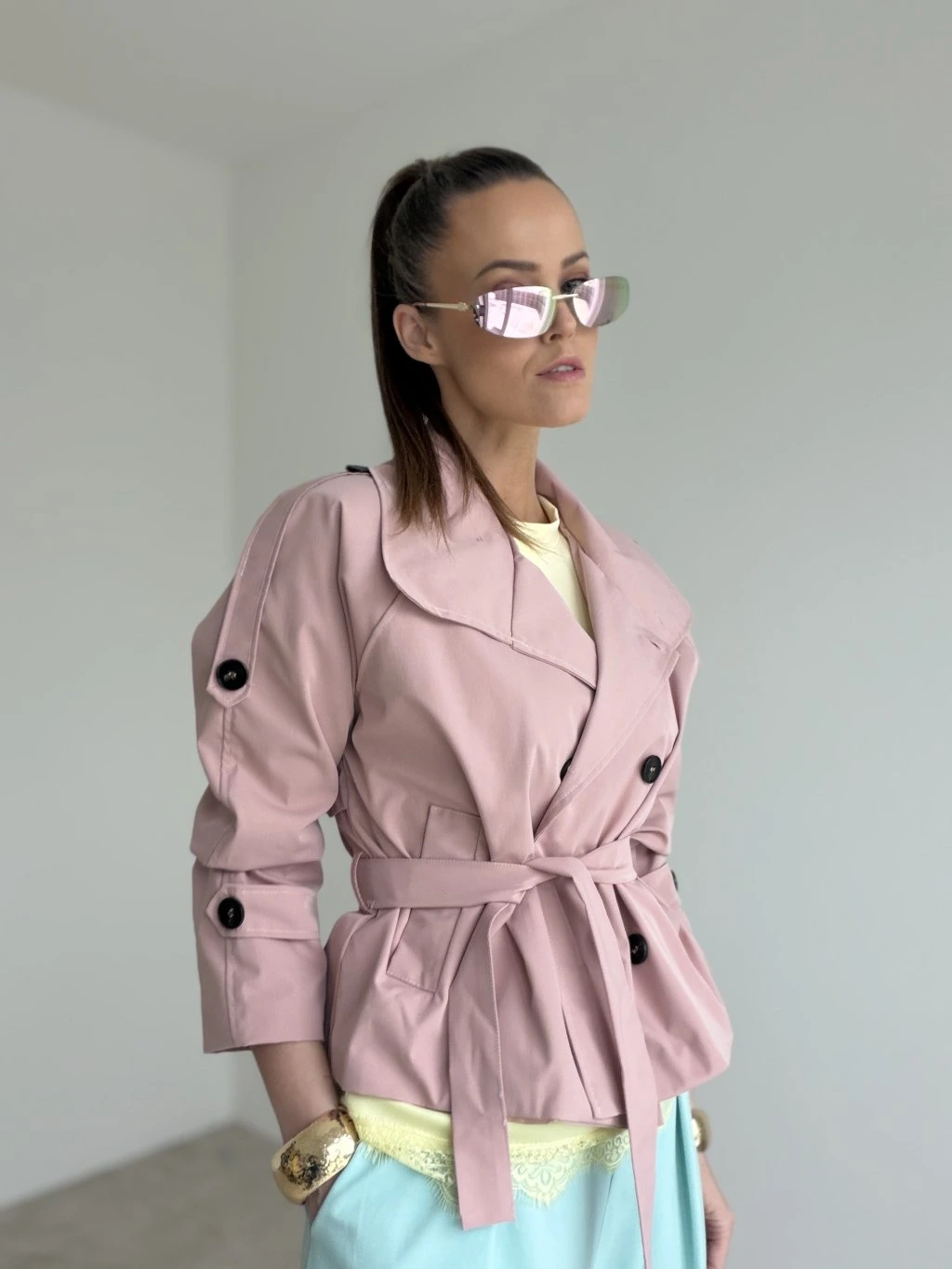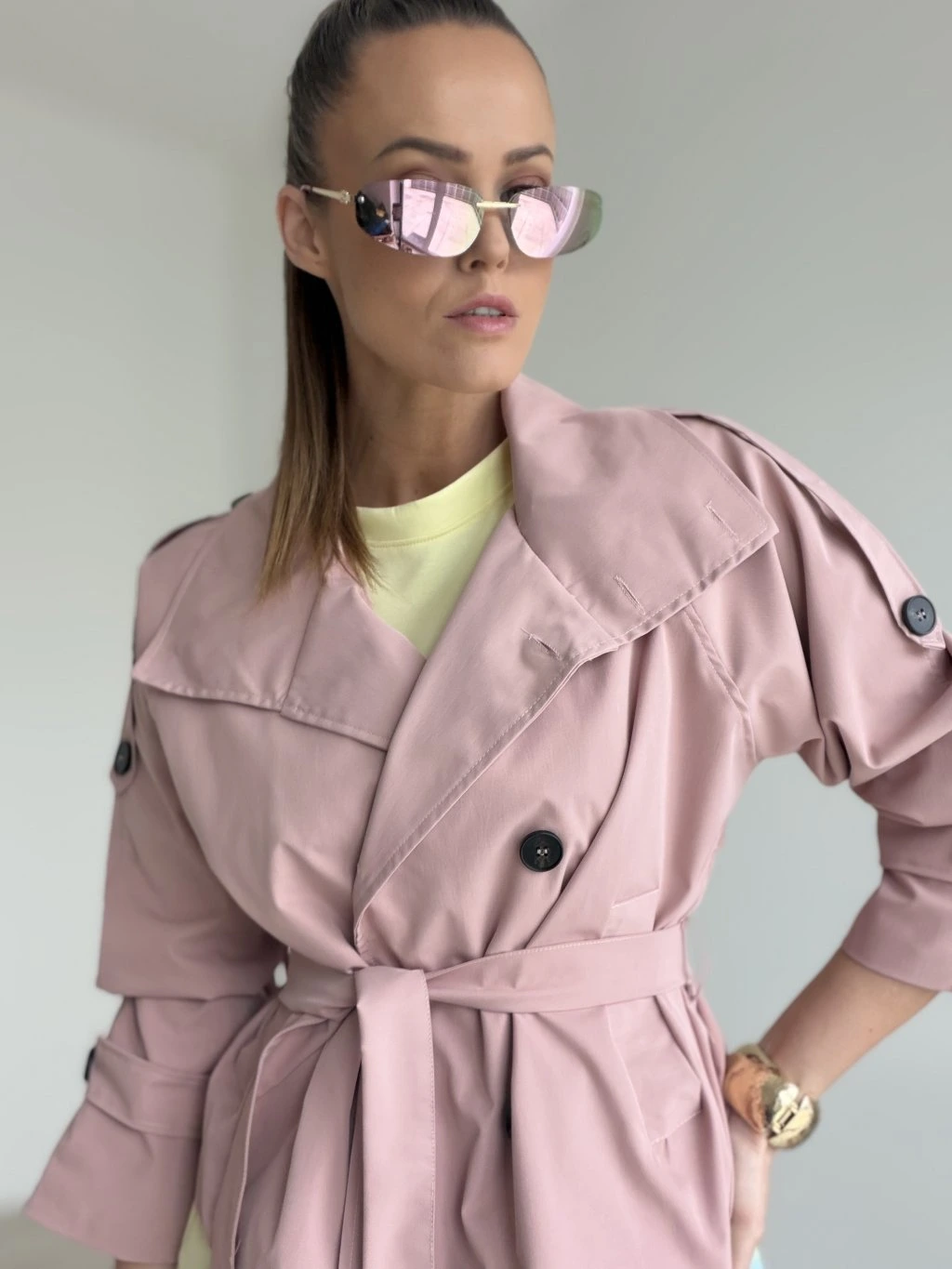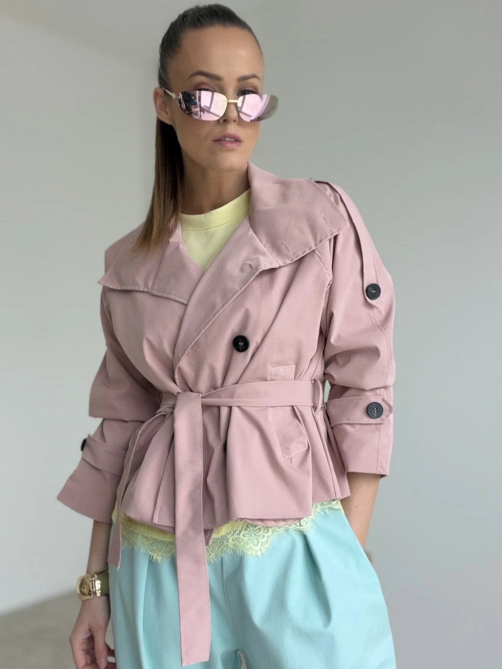 Krátky trenčkot s dvojradovým zapínaním a viazaním v páse, ktorý vytvára elegantný, upravený look. Ideálny do mesta, do práce aj na štýlové layering kombinácie.