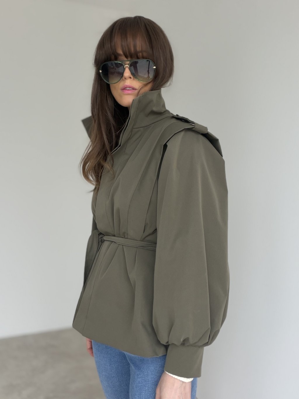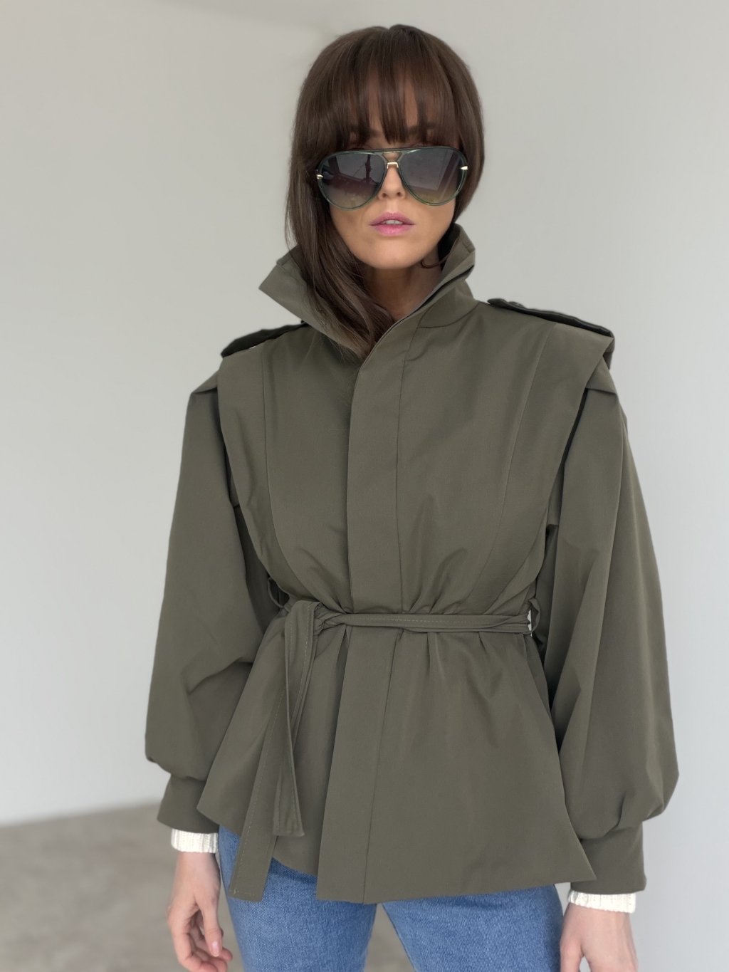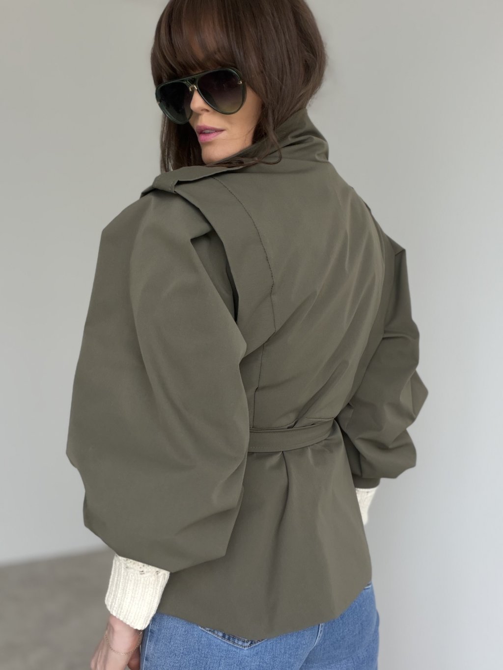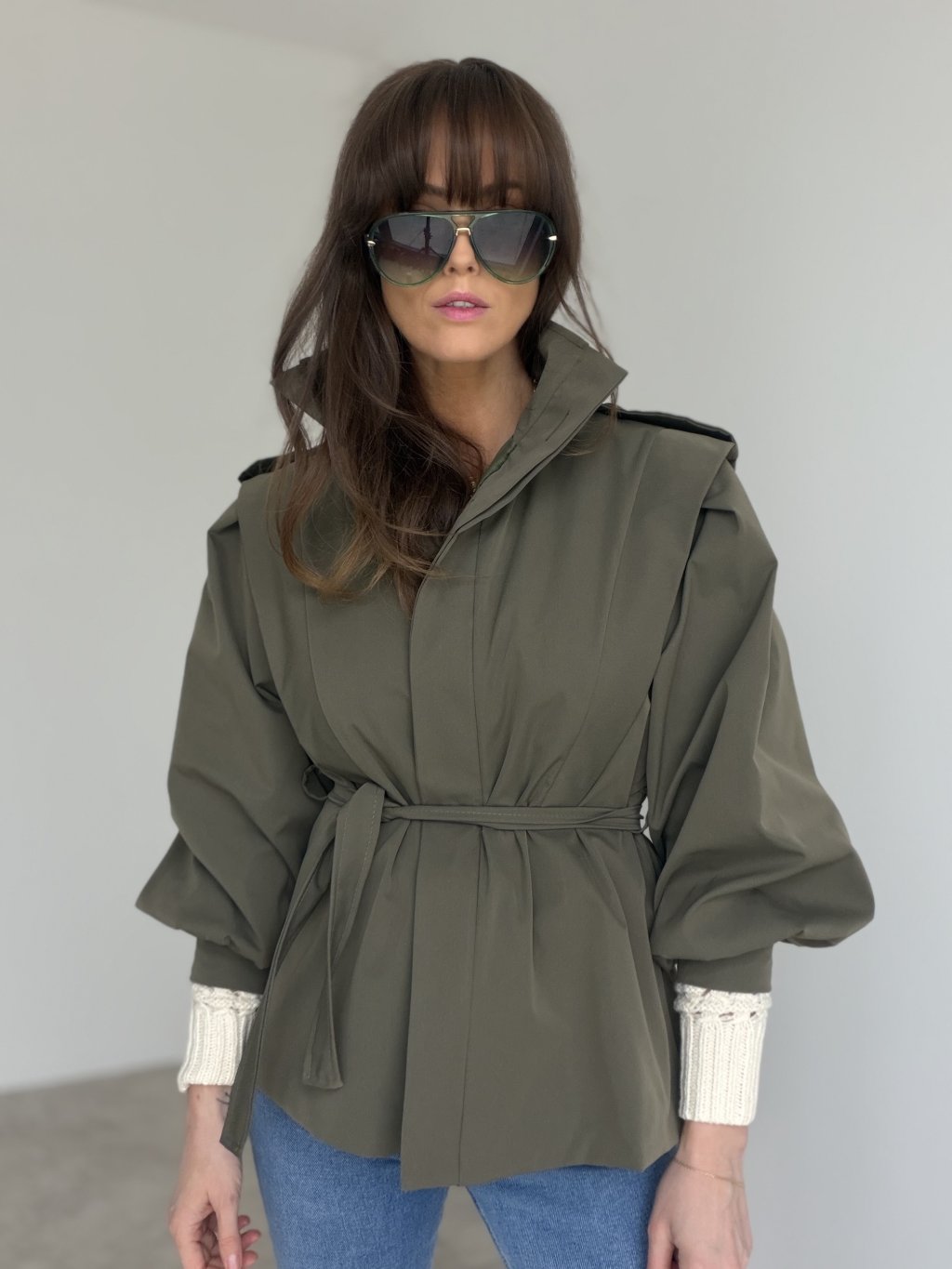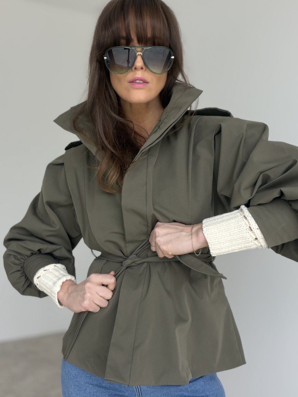 Krátky trenčkot so zapínaním na gombíky, opaskom v páse a výrazne tvarovanými rukávmi. Štýlový prechodový kúsok, ktorý zvýrazní siluetu a dodá outfitu eleganciu.